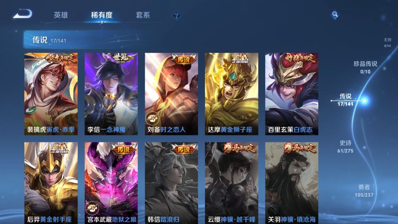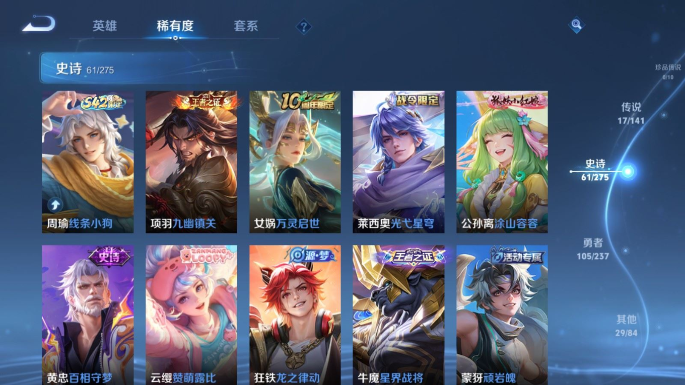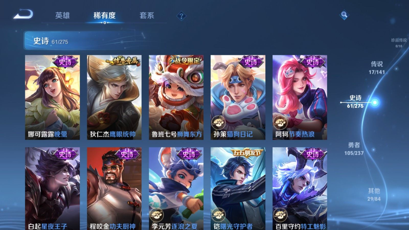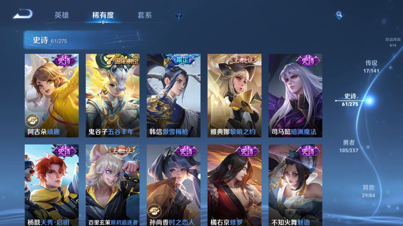 贵族等级:v7皮肤数:213传说品质17 生肖限定5 情人节限定1 荣耀典藏1 英雄数:128