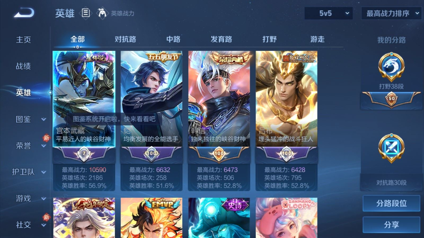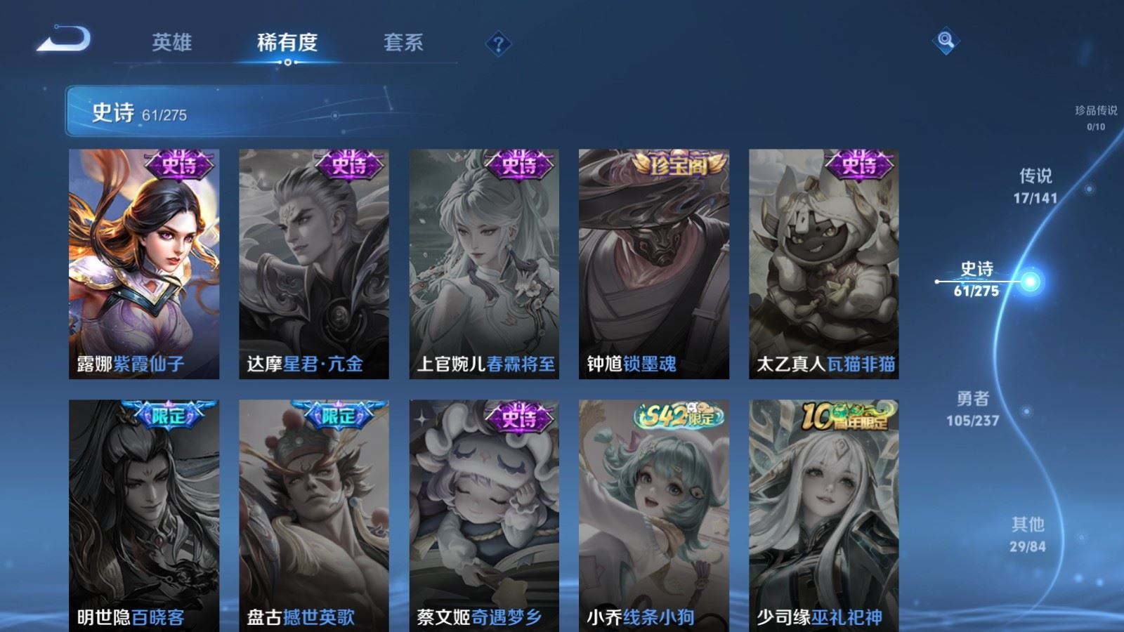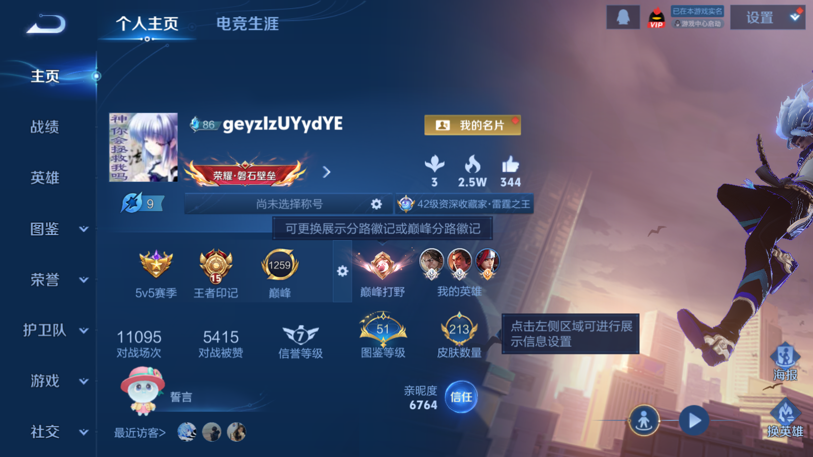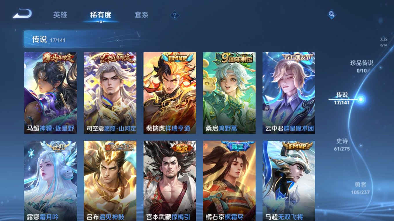 贵族等级:v7皮肤数:213传说品质17 生肖限定5 情人节限定1 荣耀典藏1 英雄数:128