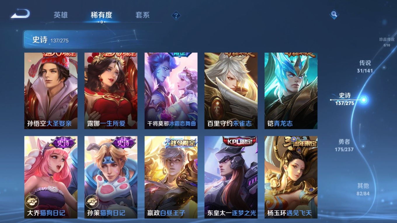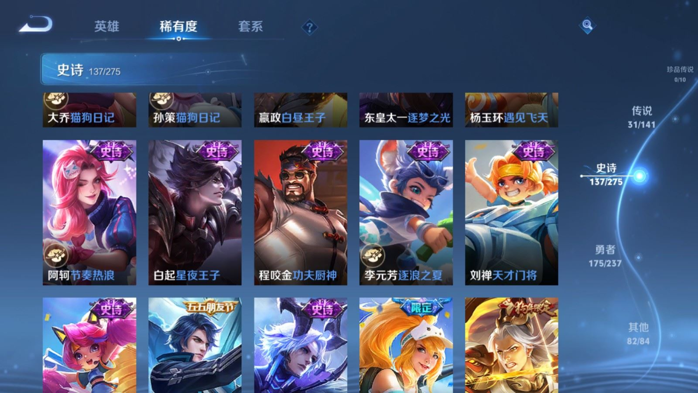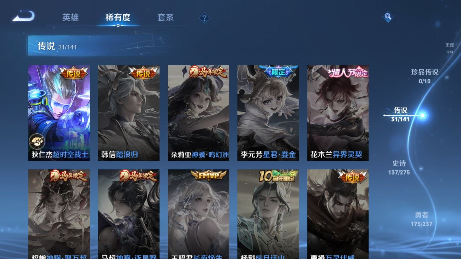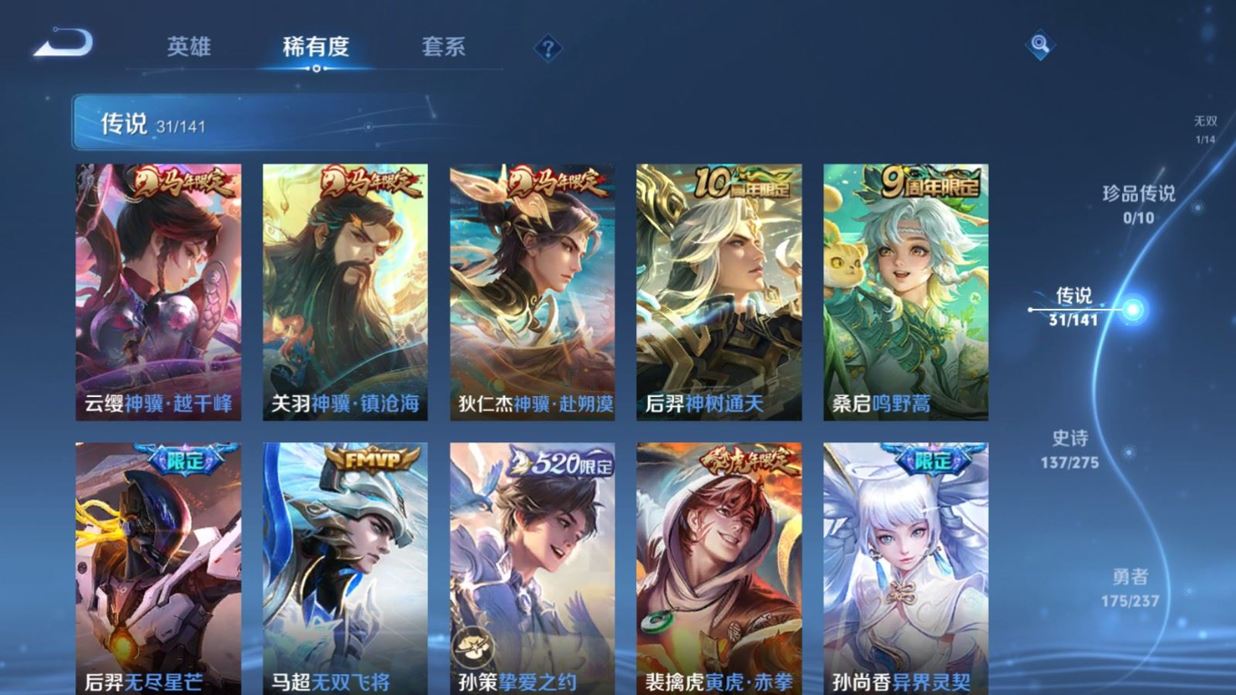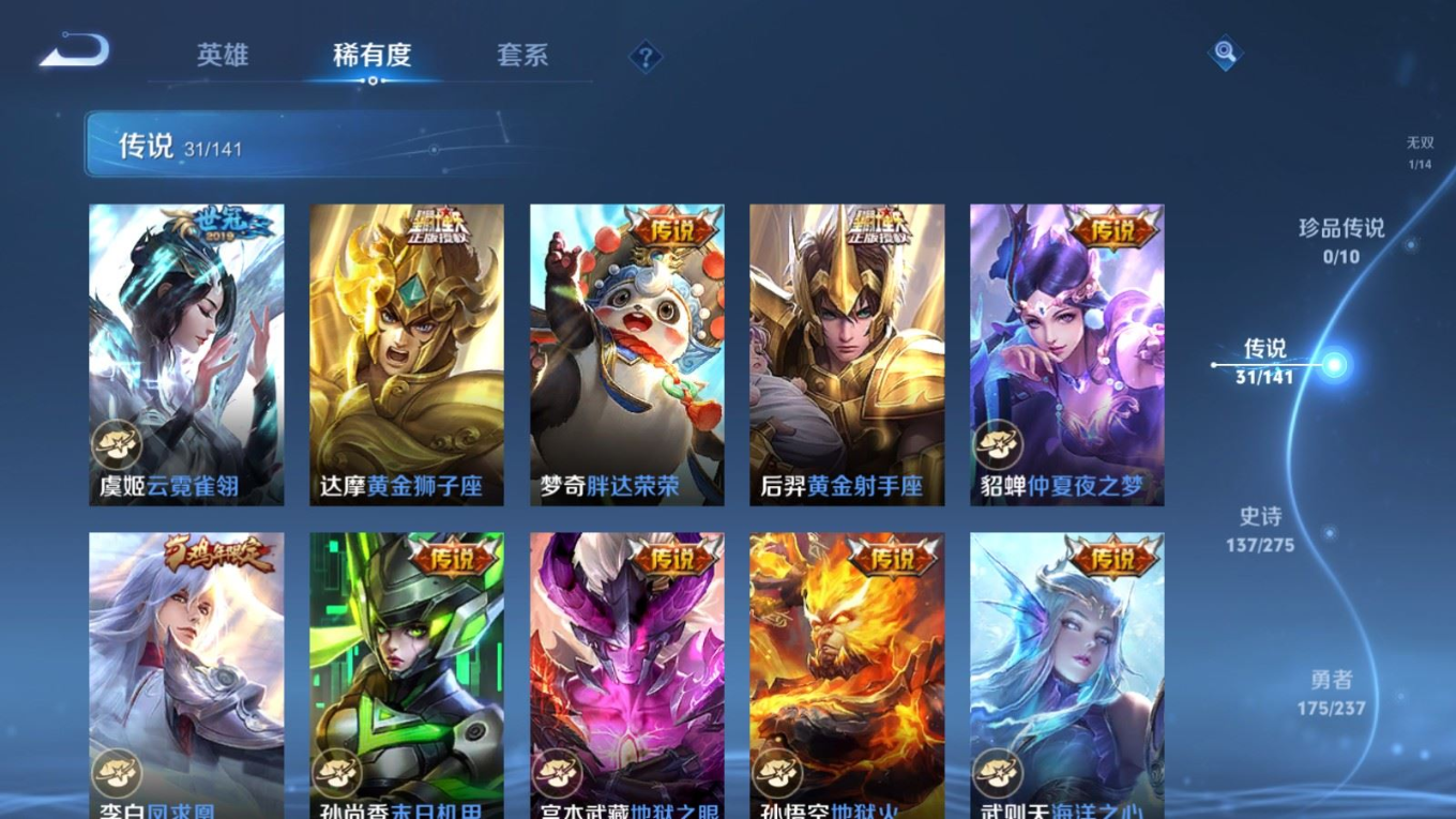 传说品质_后羿_黄金射手座传说品质_后羿_无尽星芒传说品质_后羿_神树通天传说品质_关羽_神骥·镇沧海传说品质_诸葛亮_时雨天司传说品质_孙悟空_地狱火传说品质_马超_无双飞将传说品质_武则天_海洋之心传说品质_干将莫邪_久胜战神传说品质_宫本武藏_地狱之眼传说品质_西施_游龙清影传说品质_貂蝉_遇见胡旋传说品质_貂蝉_猫影幻舞传说品质_貂蝉_仲夏夜之梦传说品质_李信_一念神魔传说品质_孙尚香_末日机甲传说品质_孙尚香_异界灵契传说品质_梦奇_胖达荣荣传说品质_桑启_鸣野蒿传说品质_云缨_神骥·越千峰传说品质_李白_凤求凰传说品质_曜_李逍遥 传说品质_孙策_挚爱之约传说品质_狄仁杰_超时空战士传说品质_狄仁杰_神骥·赴朔漠传说品质_达摩_黄金狮子座传说品质_铠_绛天战甲传说品质_虞姬_云霓雀翎传说品质_虞姬_启明星使传说品质_赵云_淬星耀世传说品质_裴擒虎_寅虎·赤拳