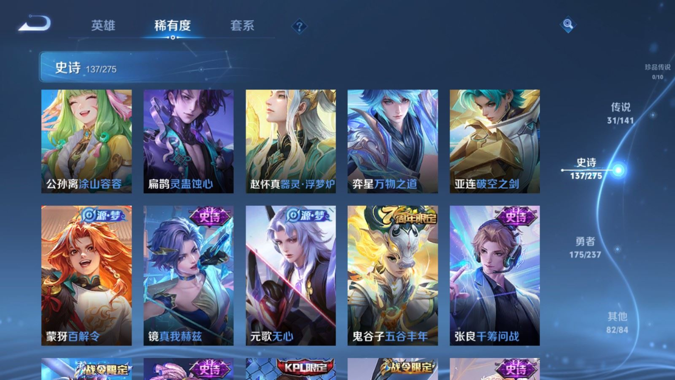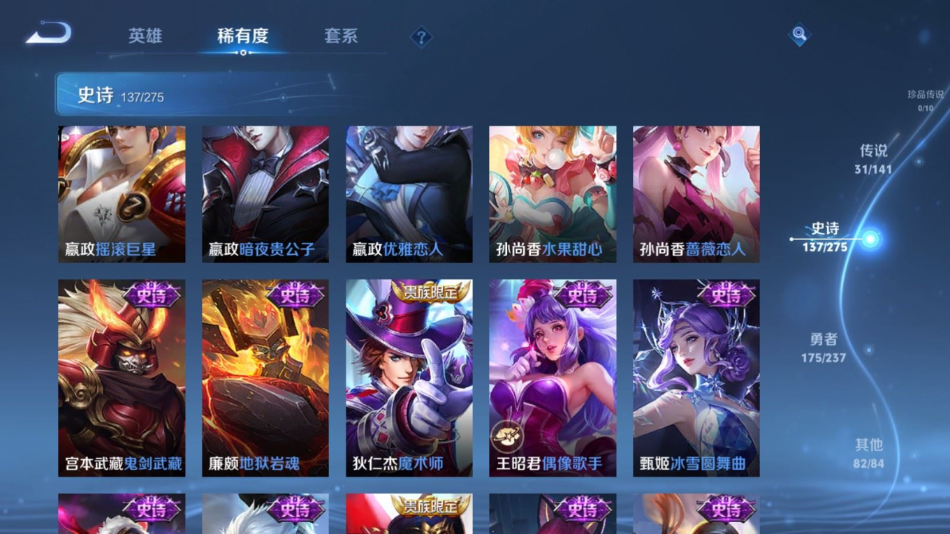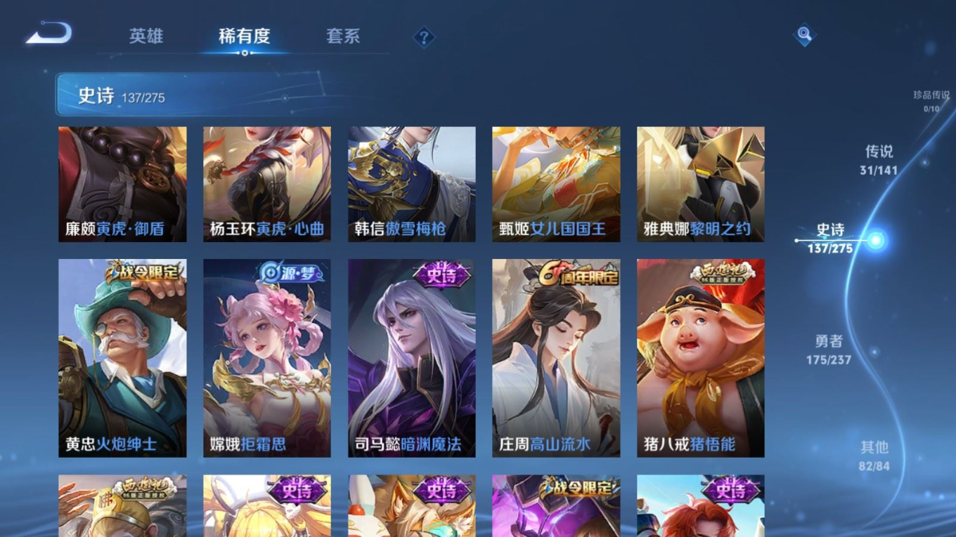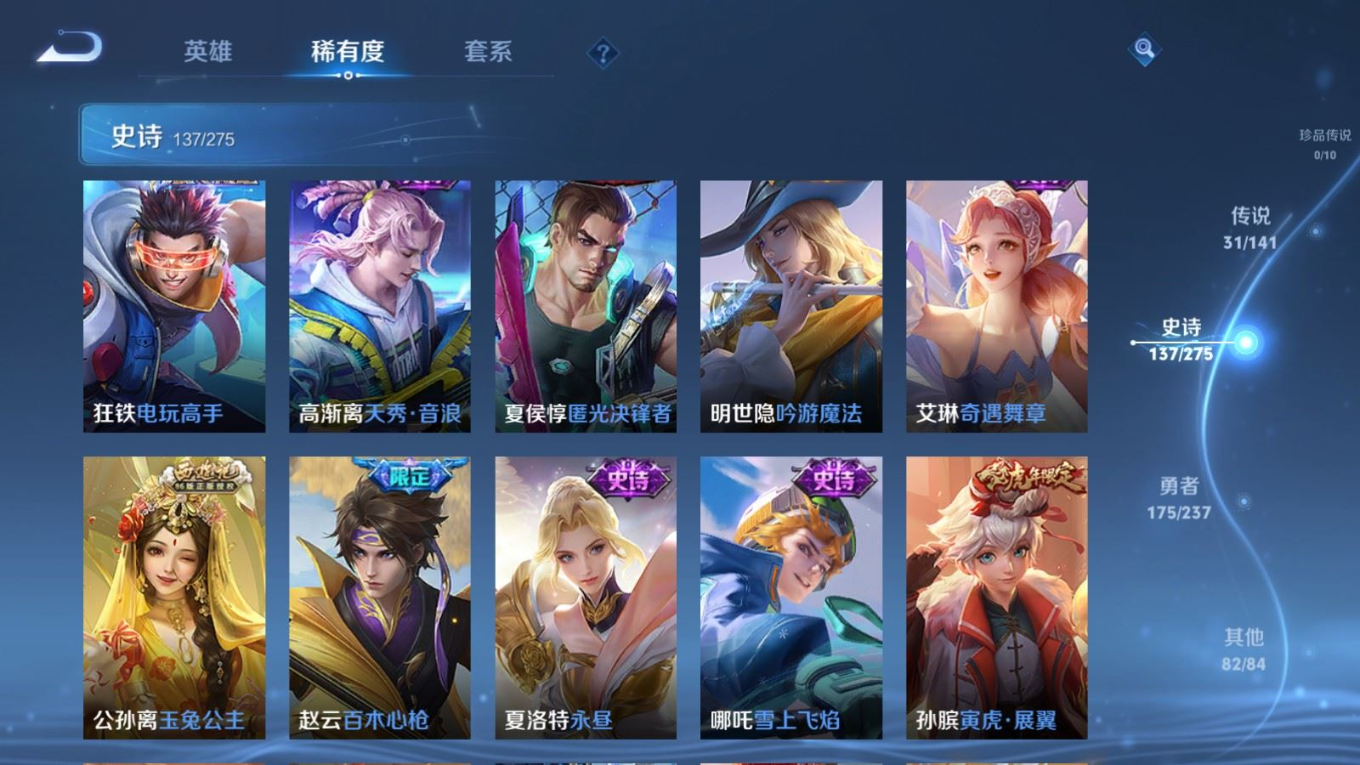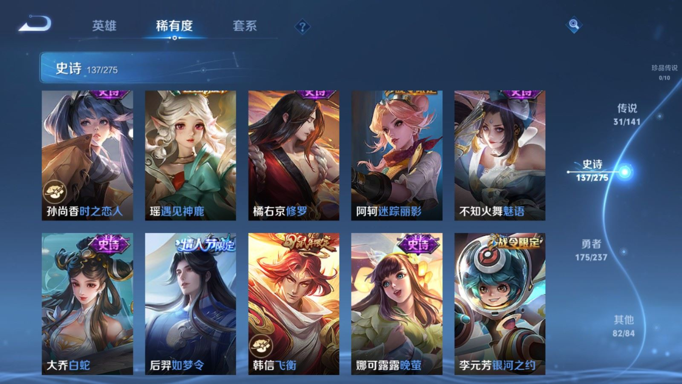 传说品质_后羿_黄金射手座传说品质_后羿_无尽星芒传说品质_后羿_神树通天传说品质_关羽_神骥·镇沧海传说品质_诸葛亮_时雨天司传说品质_孙悟空_地狱火传说品质_马超_无双飞将传说品质_武则天_海洋之心传说品质_干将莫邪_久胜战神传说品质_宫本武藏_地狱之眼传说品质_西施_游龙清影传说品质_貂蝉_遇见胡旋传说品质_貂蝉_猫影幻舞传说品质_貂蝉_仲夏夜之梦传说品质_李信_一念神魔传说品质_孙尚香_末日机甲传说品质_孙尚香_异界灵契传说品质_梦奇_胖达荣荣传说品质_桑启_鸣野蒿传说品质_云缨_神骥·越千峰传说品质_李白_凤求凰传说品质_曜_李逍遥 传说品质_孙策_挚爱之约传说品质_狄仁杰_超时空战士传说品质_狄仁杰_神骥·赴朔漠传说品质_达摩_黄金狮子座传说品质_铠_绛天战甲传说品质_虞姬_云霓雀翎传说品质_虞姬_启明星使传说品质_赵云_淬星耀世传说品质_裴擒虎_寅虎·赤拳