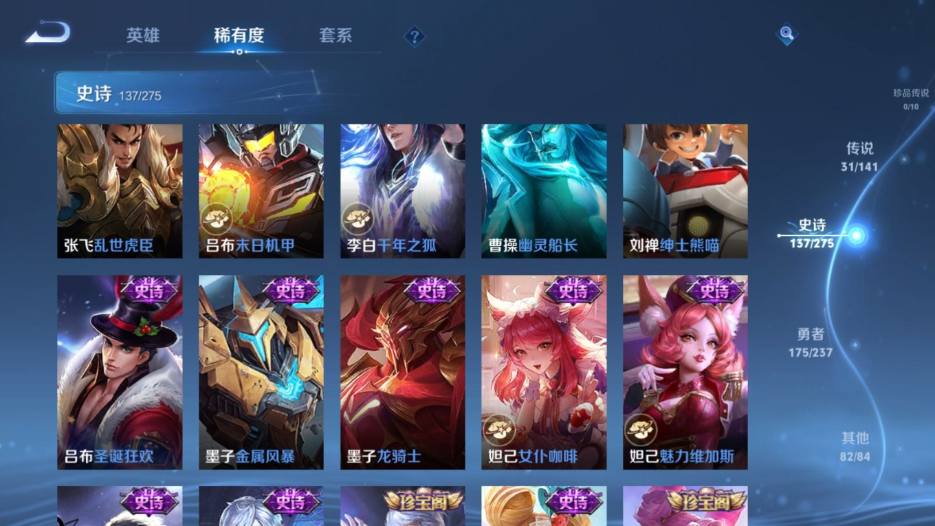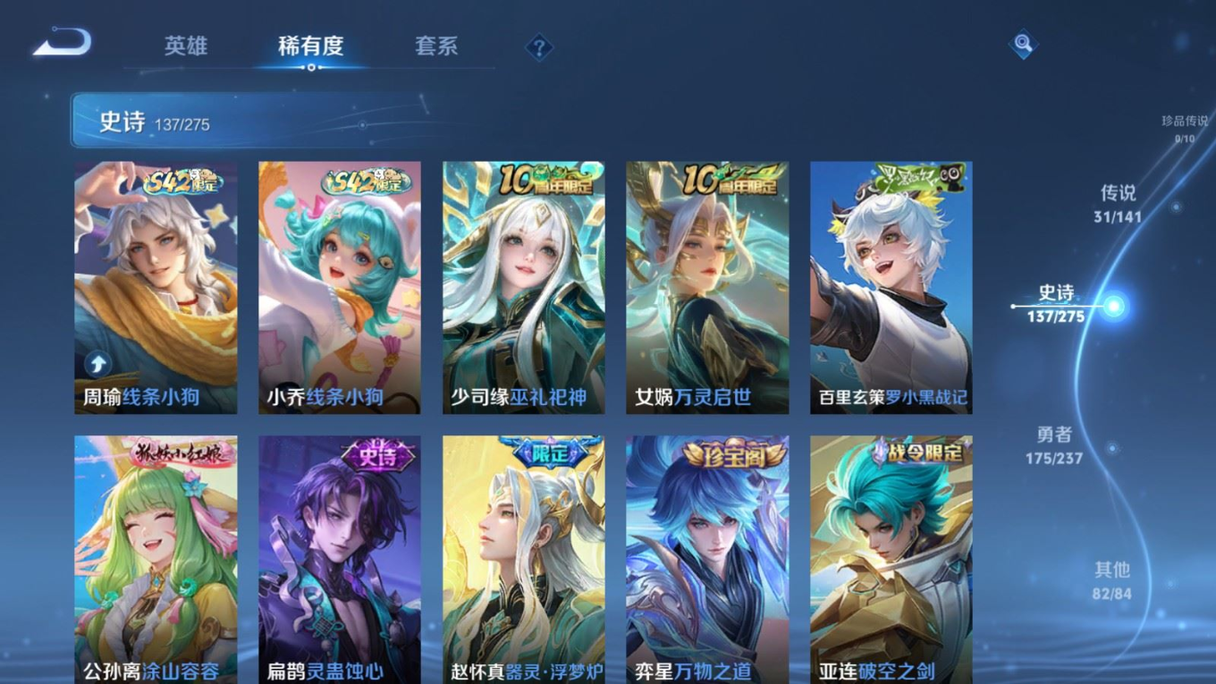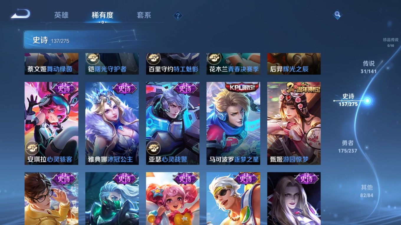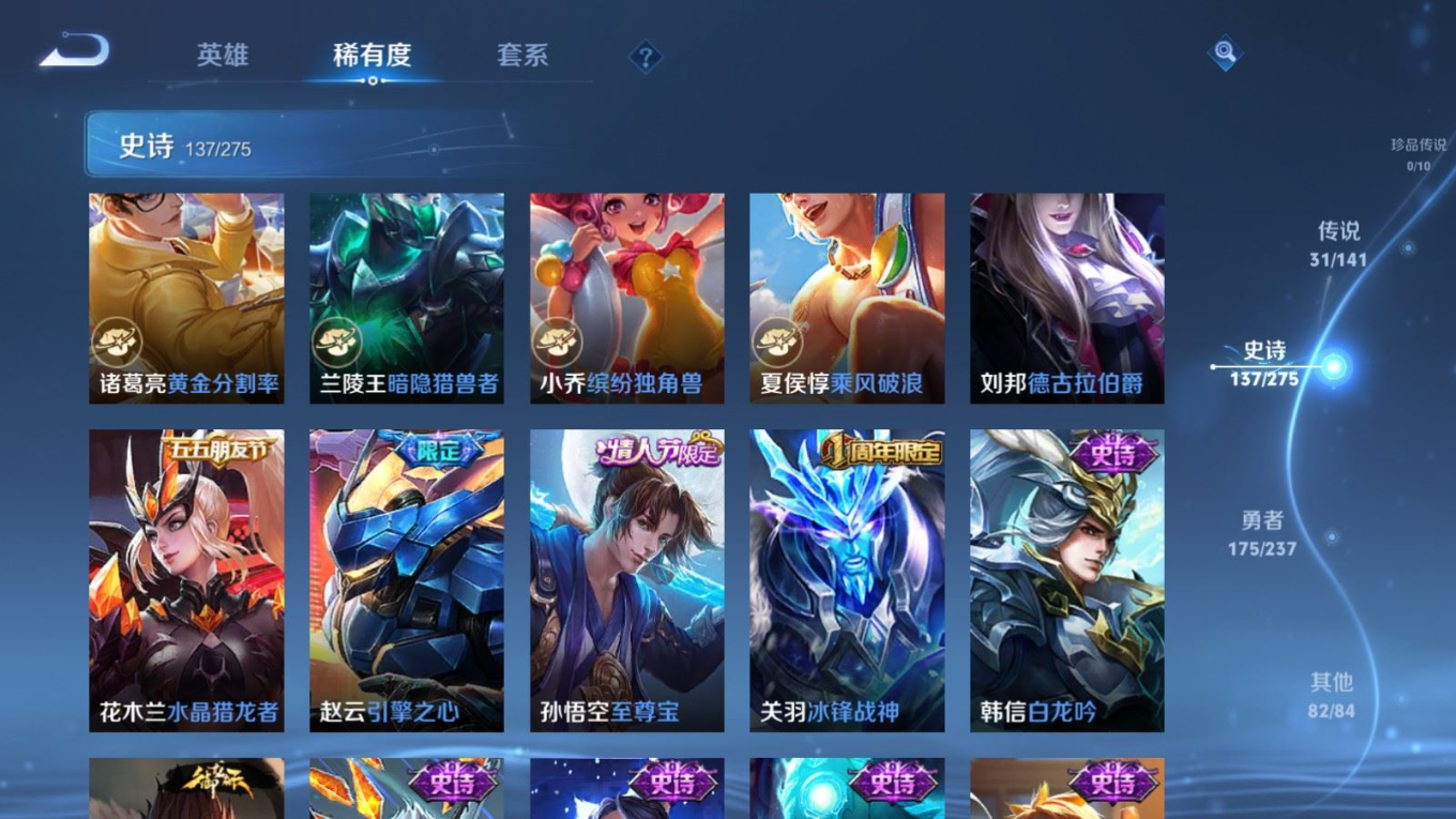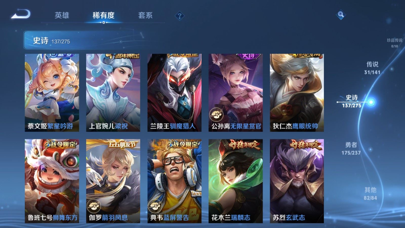 传说品质_后羿_黄金射手座传说品质_后羿_无尽星芒传说品质_后羿_神树通天传说品质_关羽_神骥·镇沧海传说品质_诸葛亮_时雨天司传说品质_孙悟空_地狱火传说品质_马超_无双飞将传说品质_武则天_海洋之心传说品质_干将莫邪_久胜战神传说品质_宫本武藏_地狱之眼传说品质_西施_游龙清影传说品质_貂蝉_遇见胡旋传说品质_貂蝉_猫影幻舞传说品质_貂蝉_仲夏夜之梦传说品质_李信_一念神魔传说品质_孙尚香_末日机甲传说品质_孙尚香_异界灵契传说品质_梦奇_胖达荣荣传说品质_桑启_鸣野蒿传说品质_云缨_神骥·越千峰传说品质_李白_凤求凰传说品质_曜_李逍遥 传说品质_孙策_挚爱之约传说品质_狄仁杰_超时空战士传说品质_狄仁杰_神骥·赴朔漠传说品质_达摩_黄金狮子座传说品质_铠_绛天战甲传说品质_虞姬_云霓雀翎传说品质_虞姬_启明星使传说品质_赵云_淬星耀世传说品质_裴擒虎_寅虎·赤拳