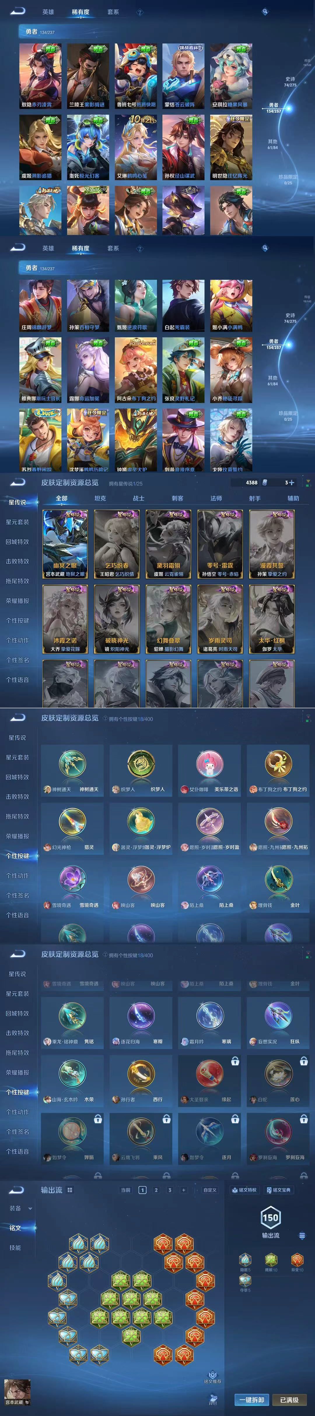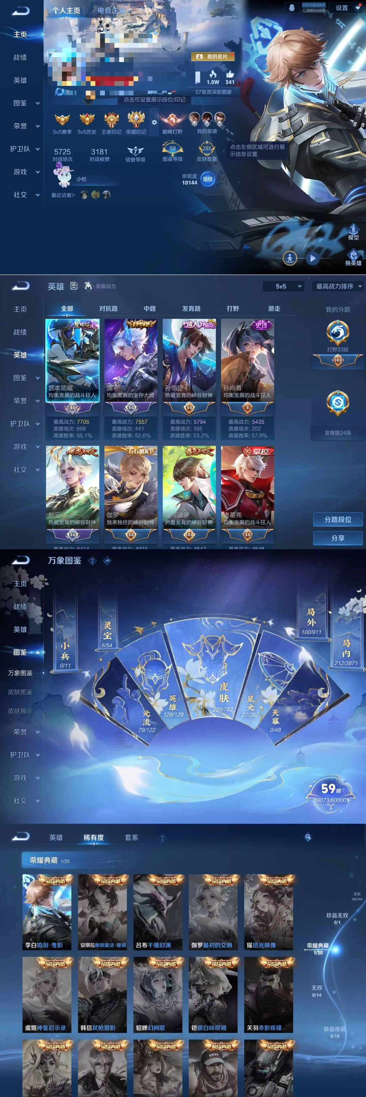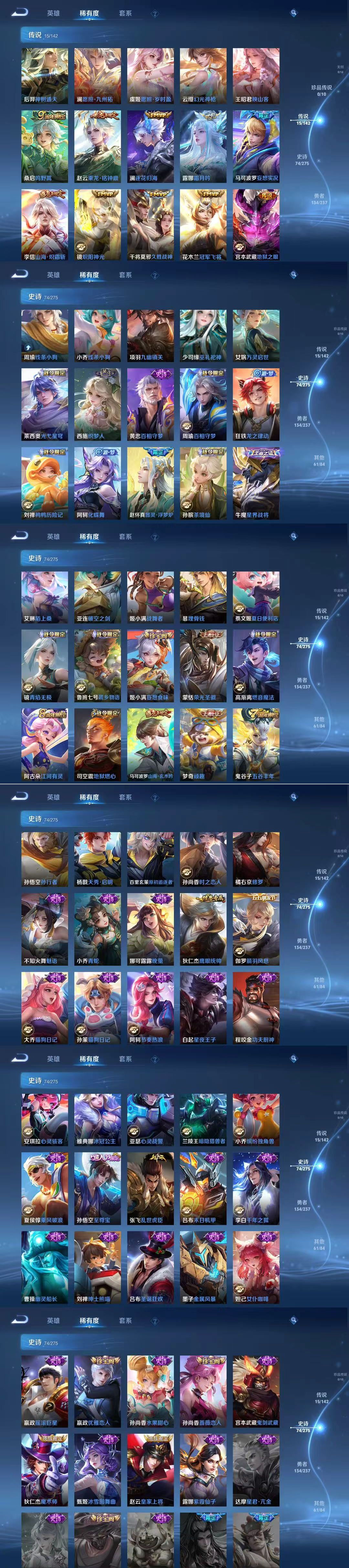贵族等级:v7皮肤数:285传说品质15 生肖限定5 情人节限定1 荣耀典藏1 英雄数:128