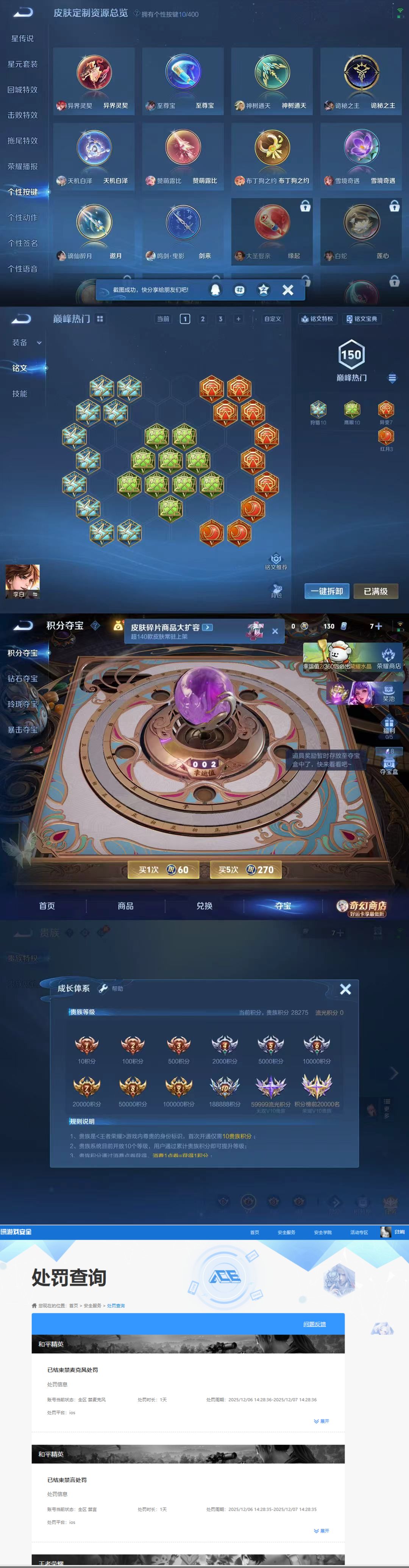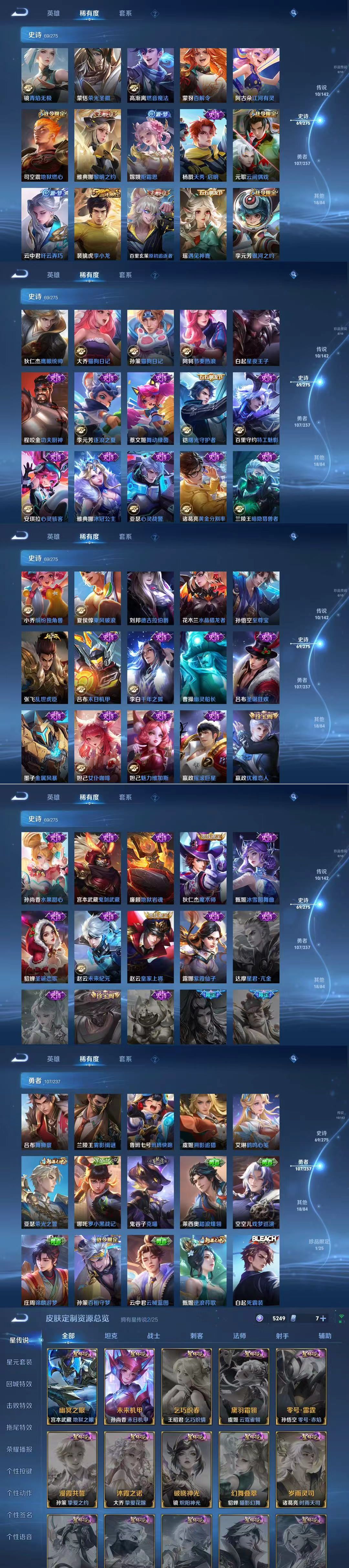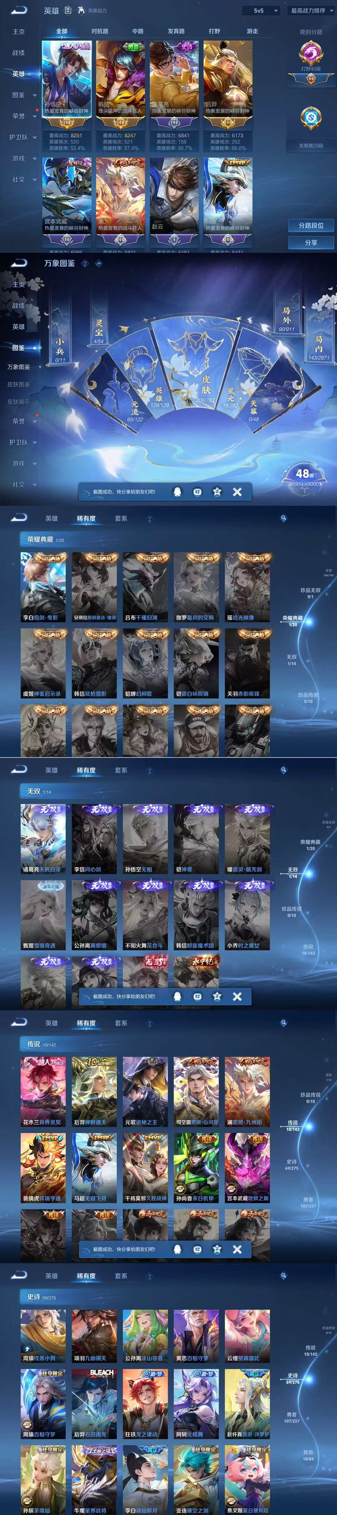 贵族等级:v7皮肤数:206传说品质10 生肖限定3 无双1 情人节限定2 荣耀典藏1 英雄数:128