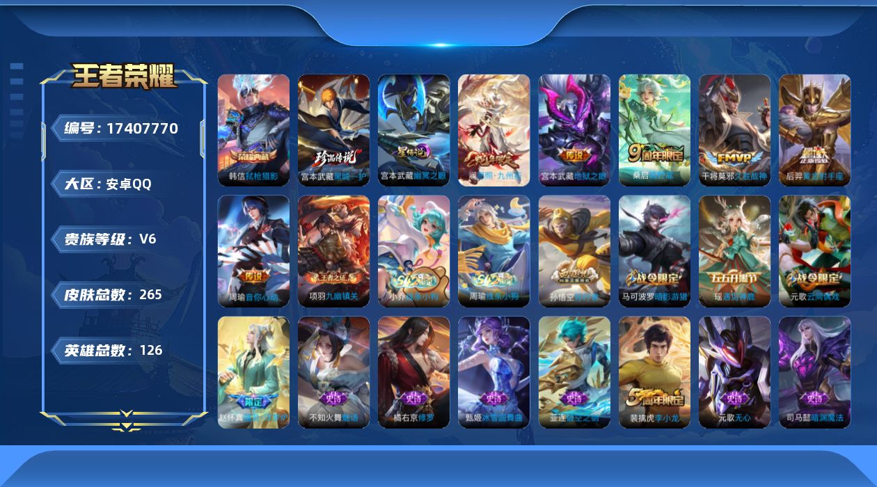 贵族等级:v6皮肤数:265传说品质6 生肖限定1 珍品传说1 荣耀典藏1 英雄数:126