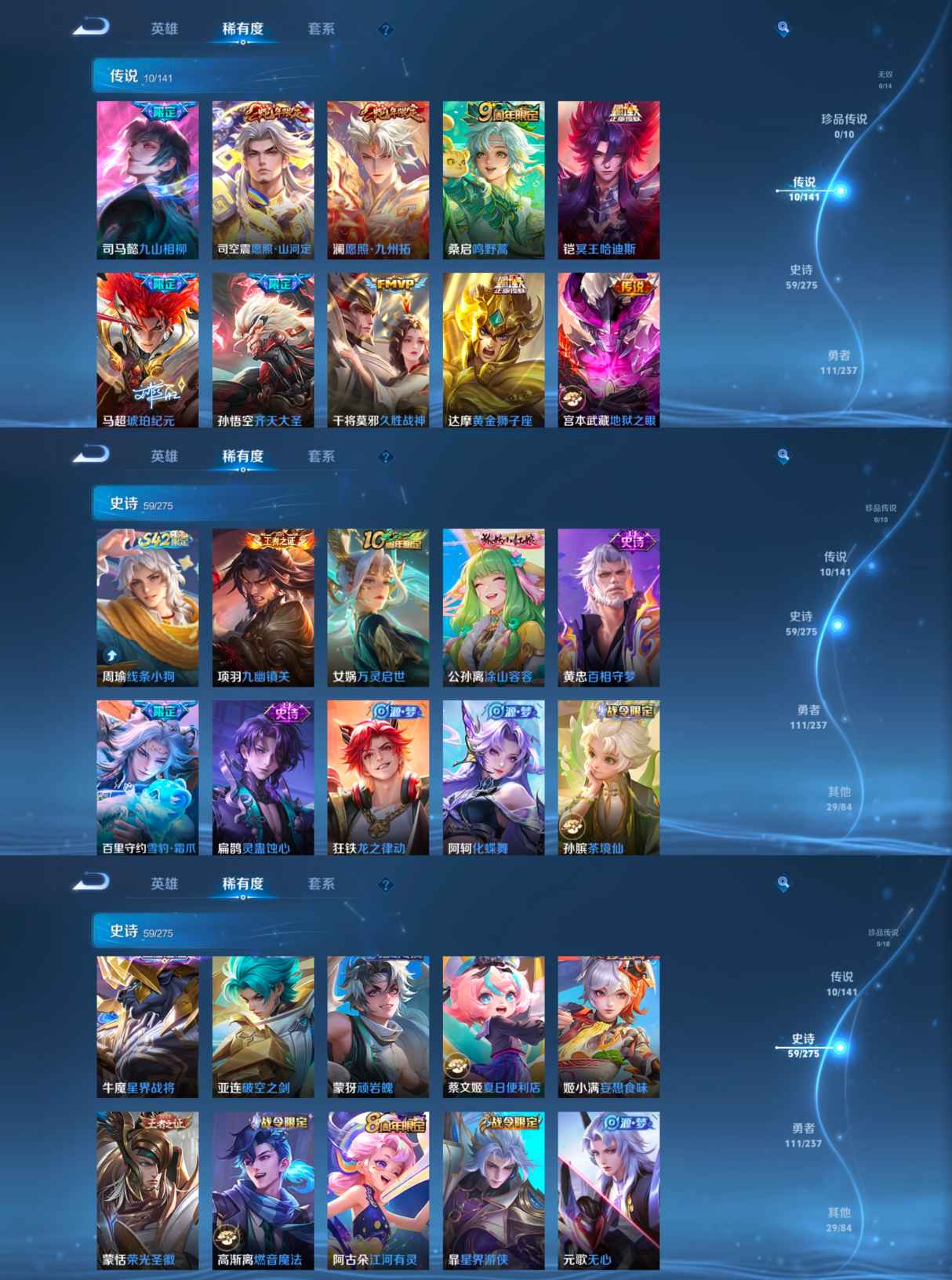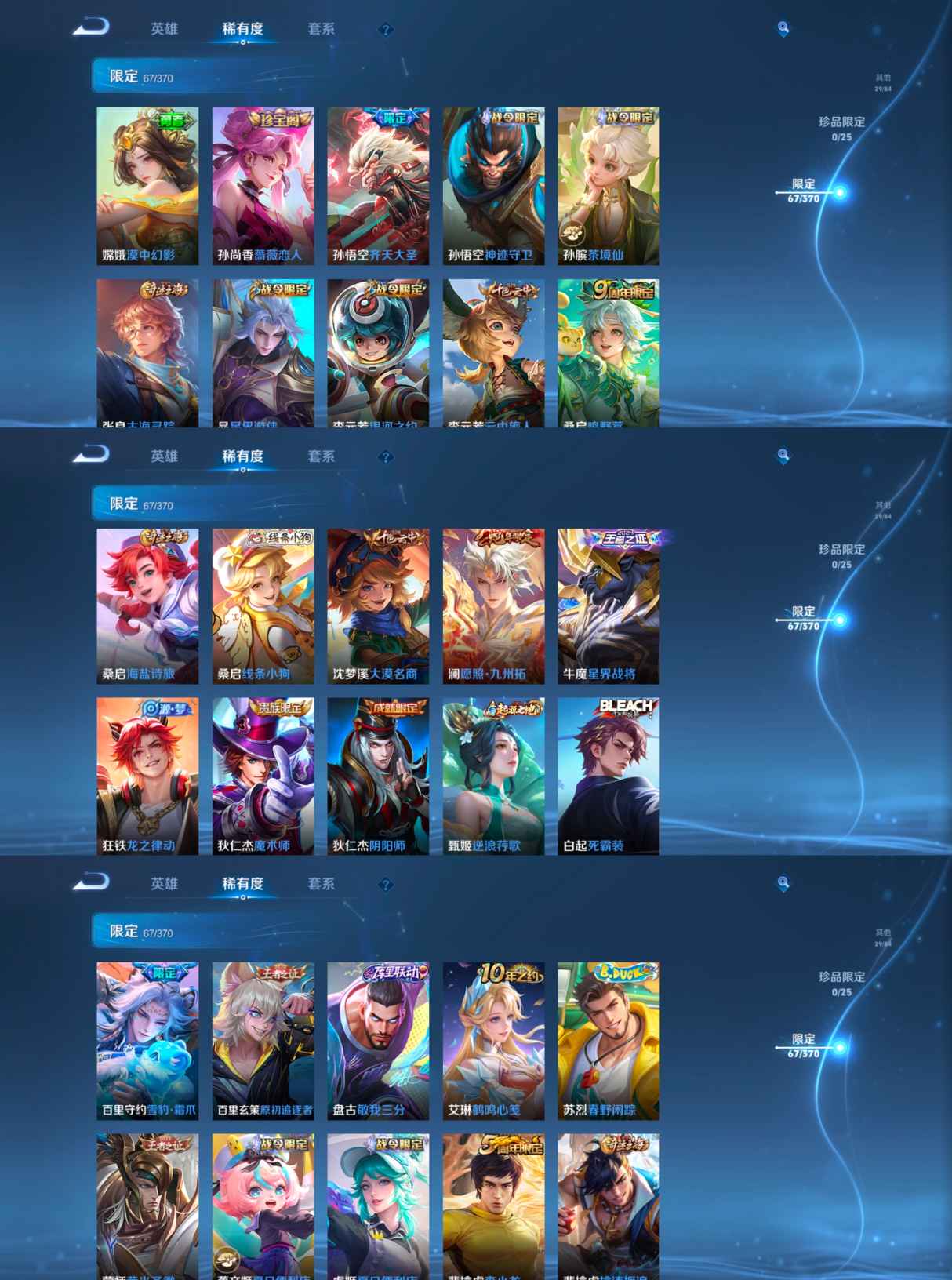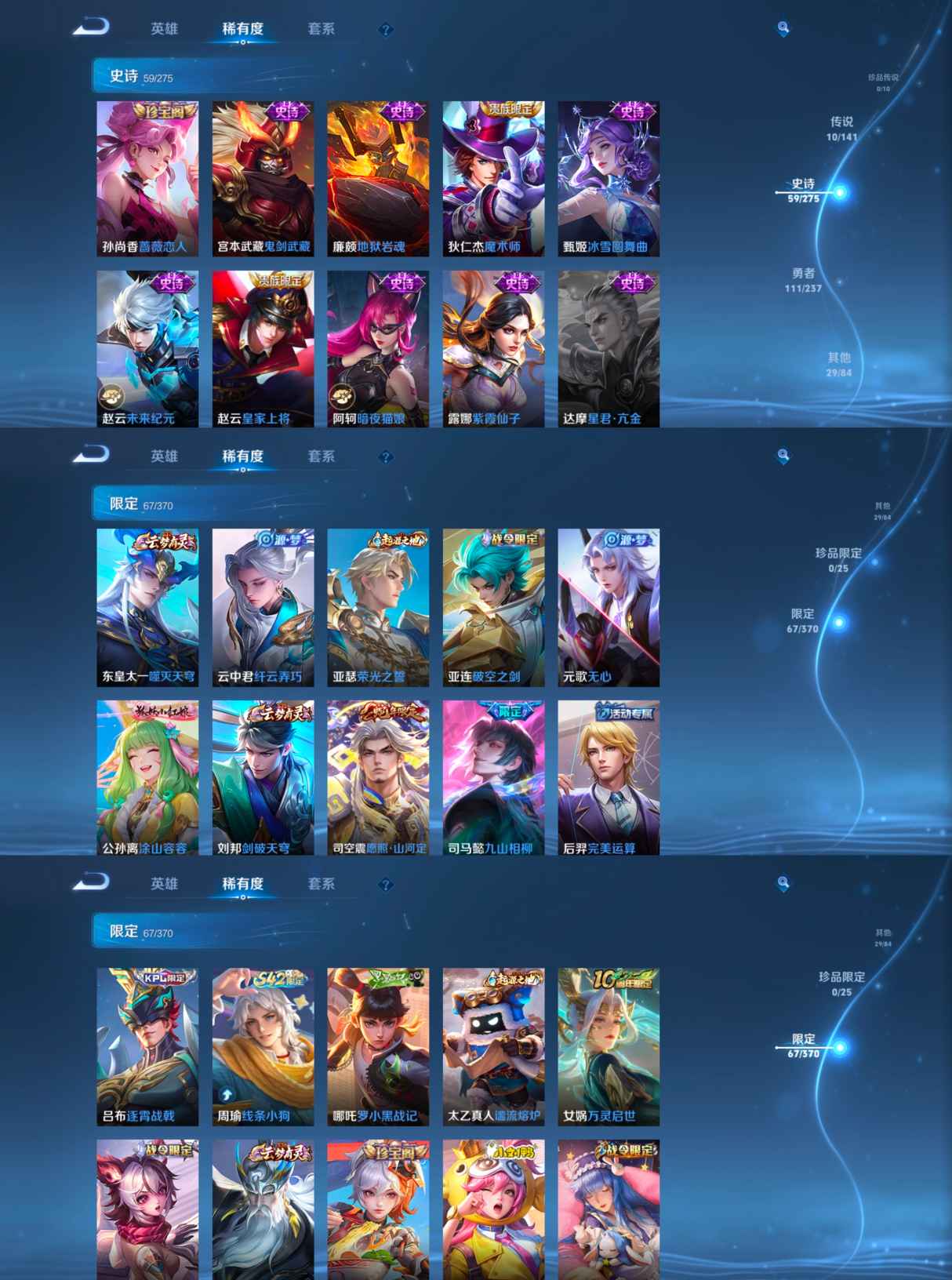 贵族等级:v6皮肤数:209传说品质10 生肖限定2 英雄数:126