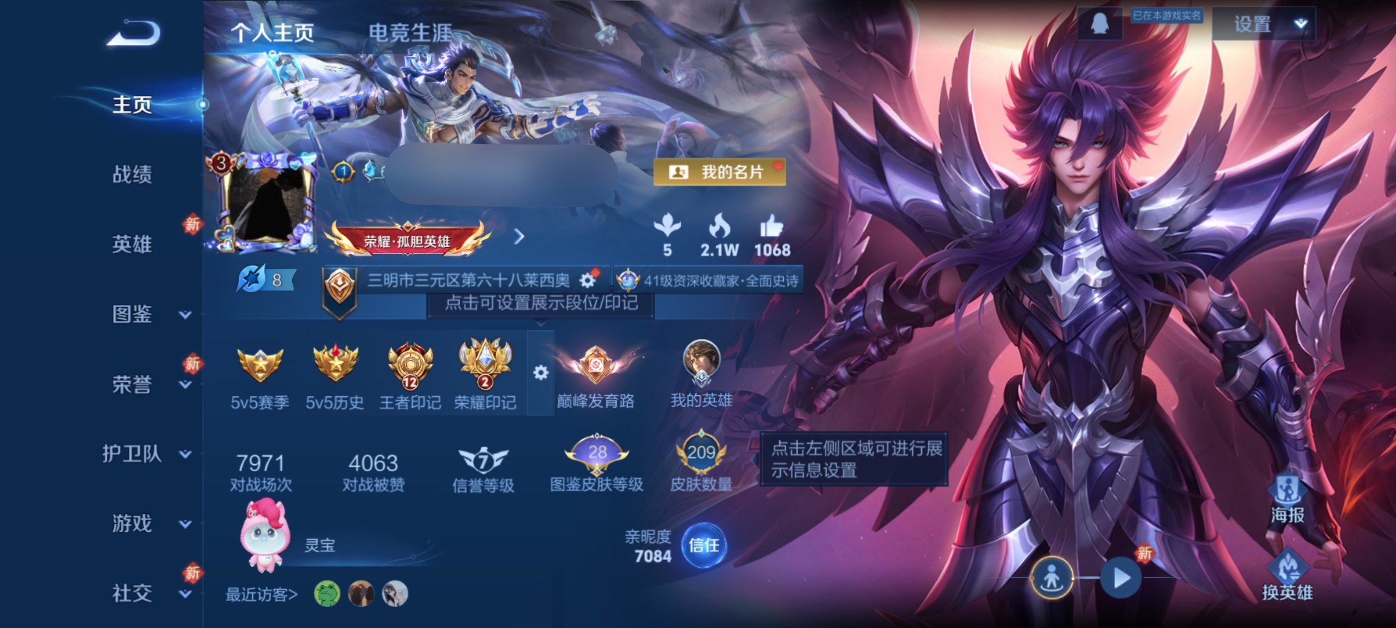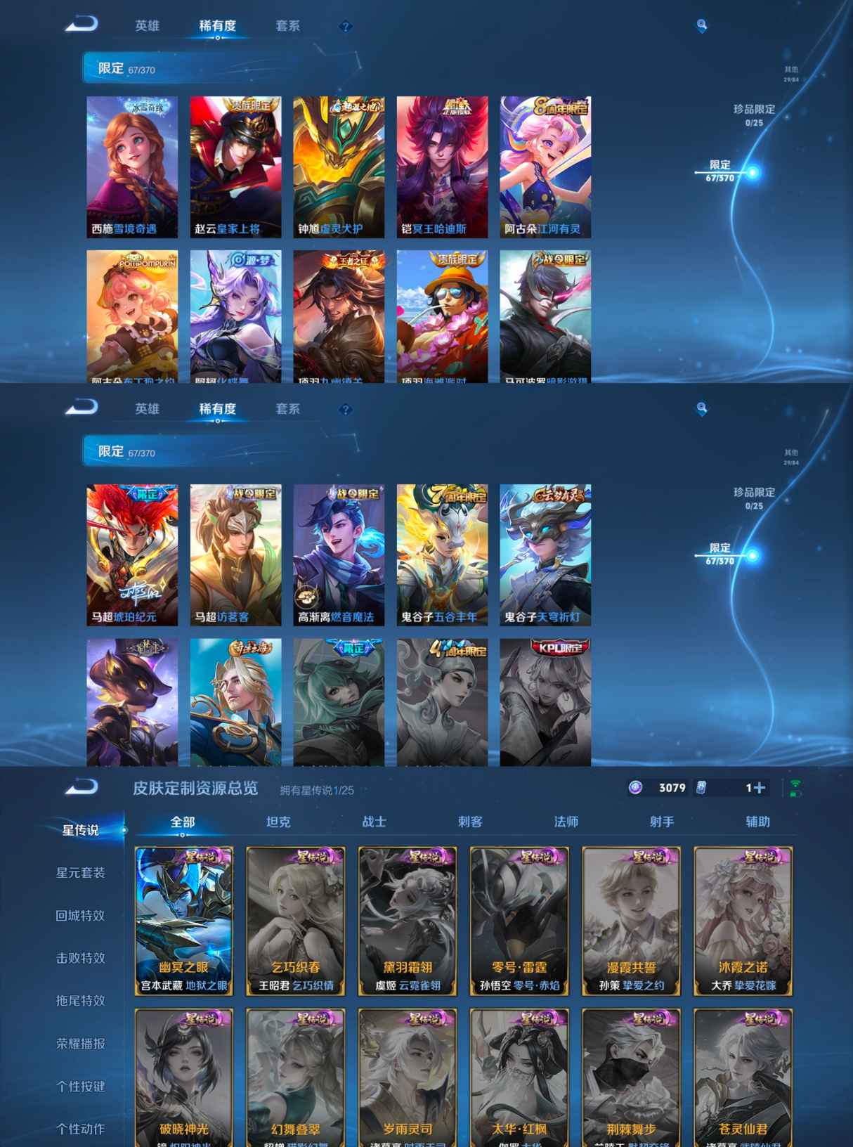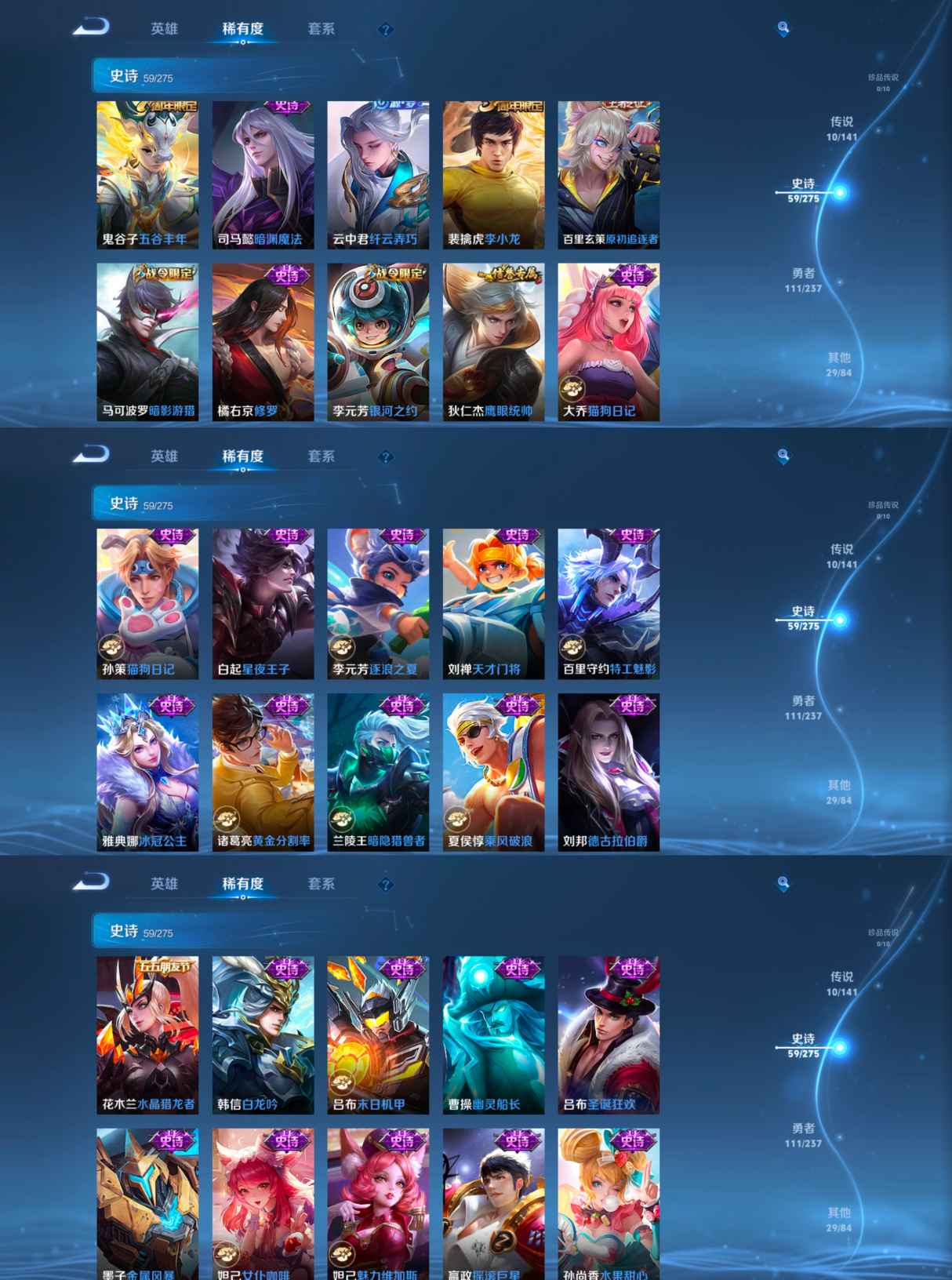 贵族等级:v6皮肤数:209传说品质10 生肖限定2 英雄数:126
