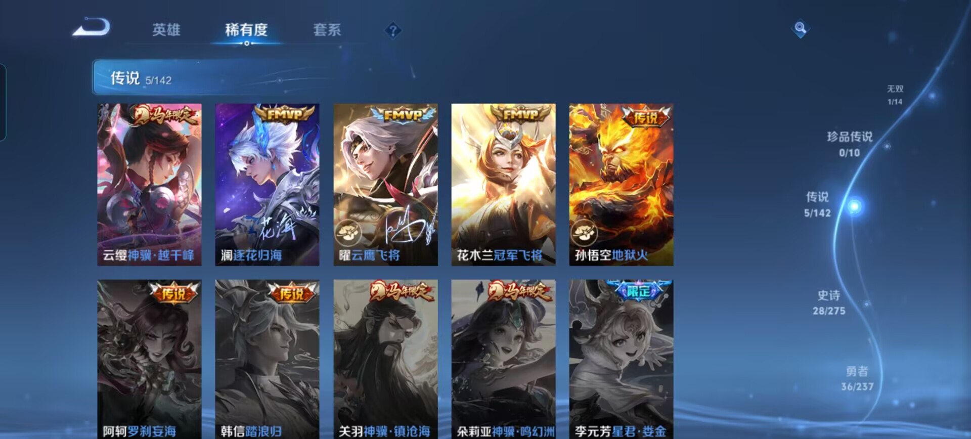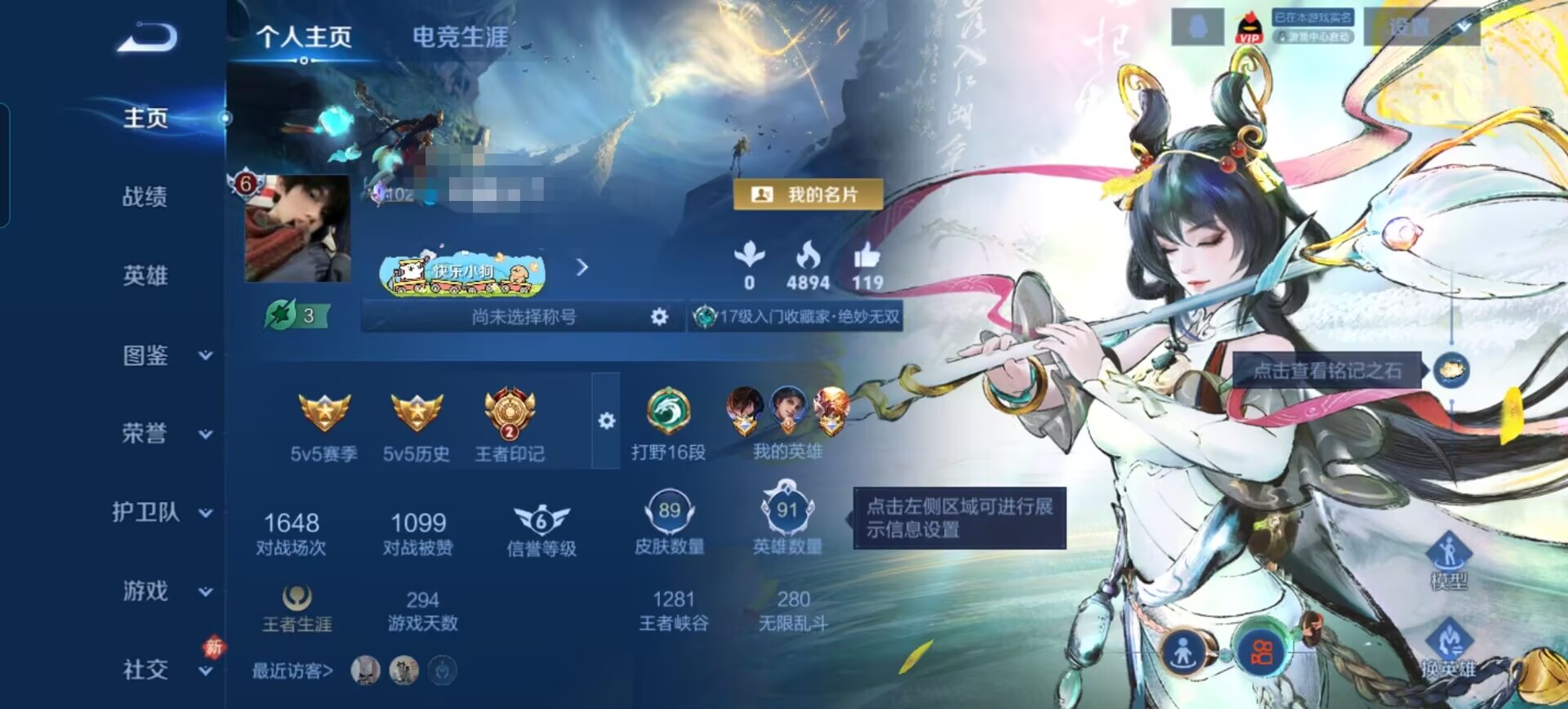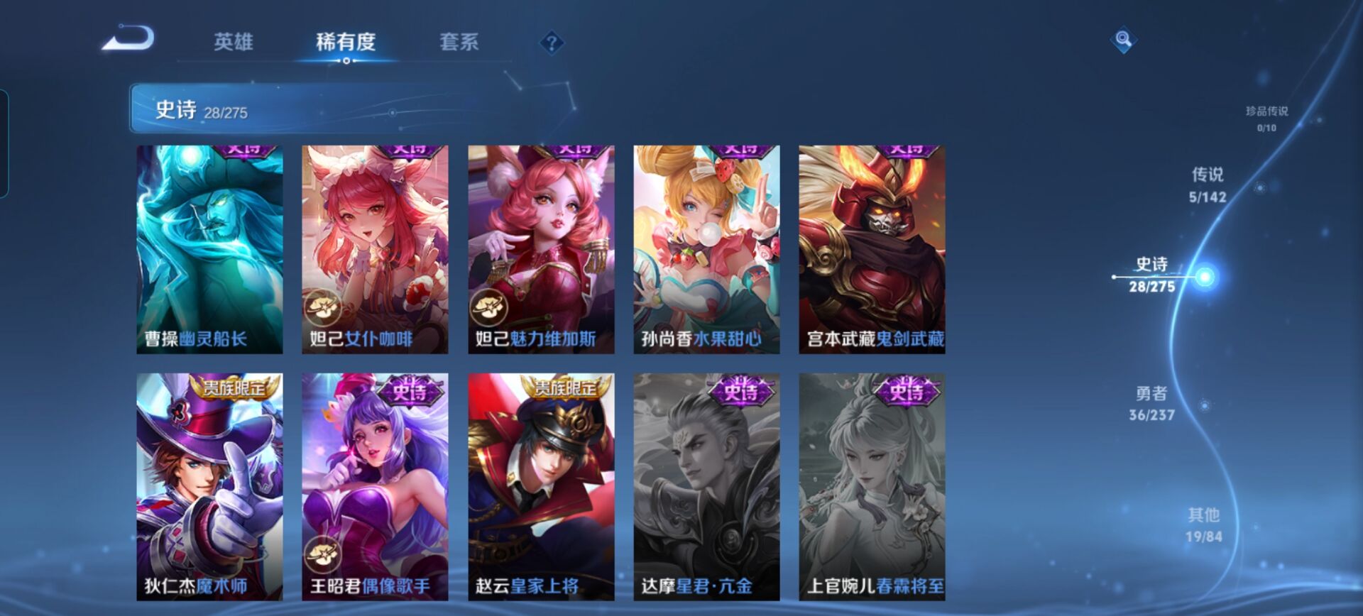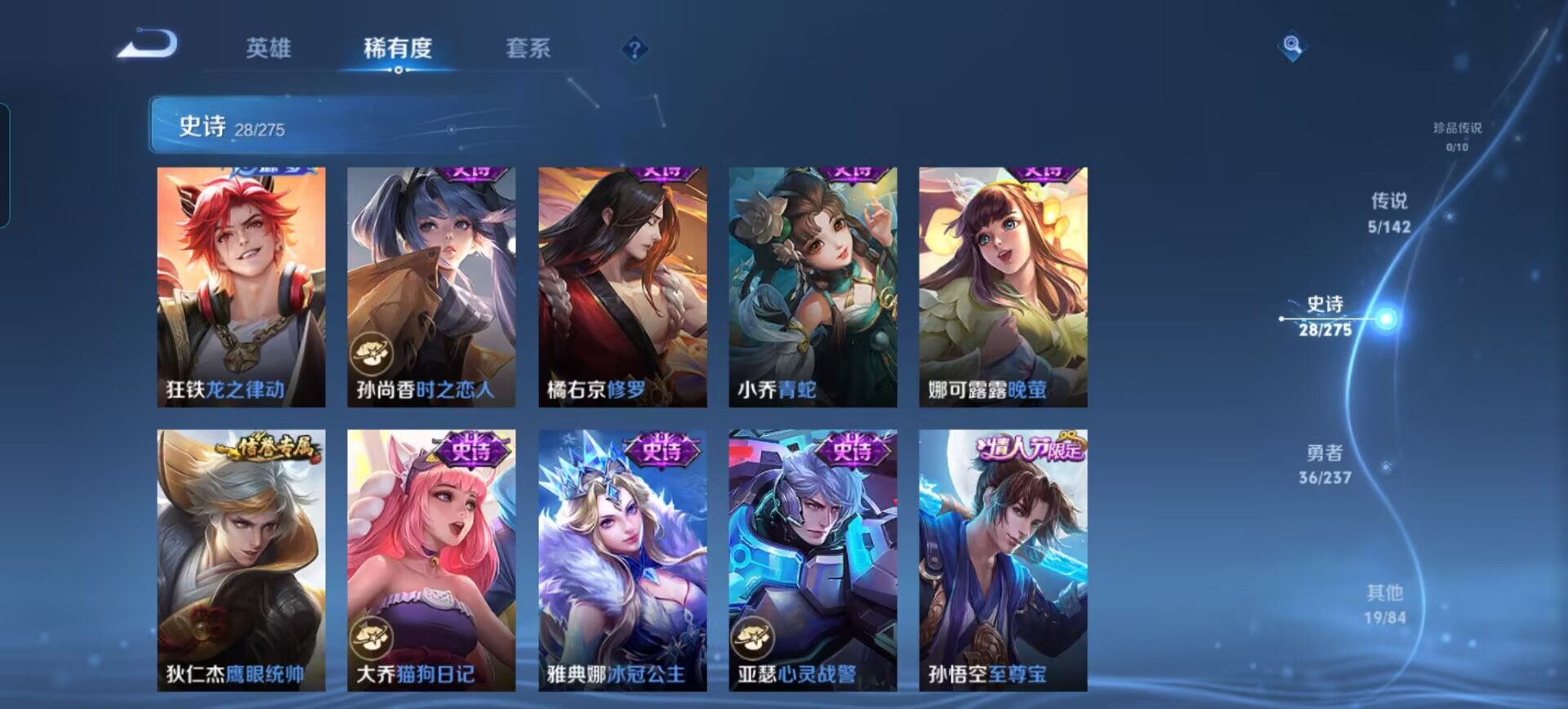 贵族等级:v6皮肤数:89传说品质5 情人节限定1 生肖限定1 无双1 英雄数:91