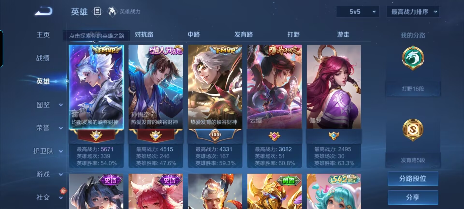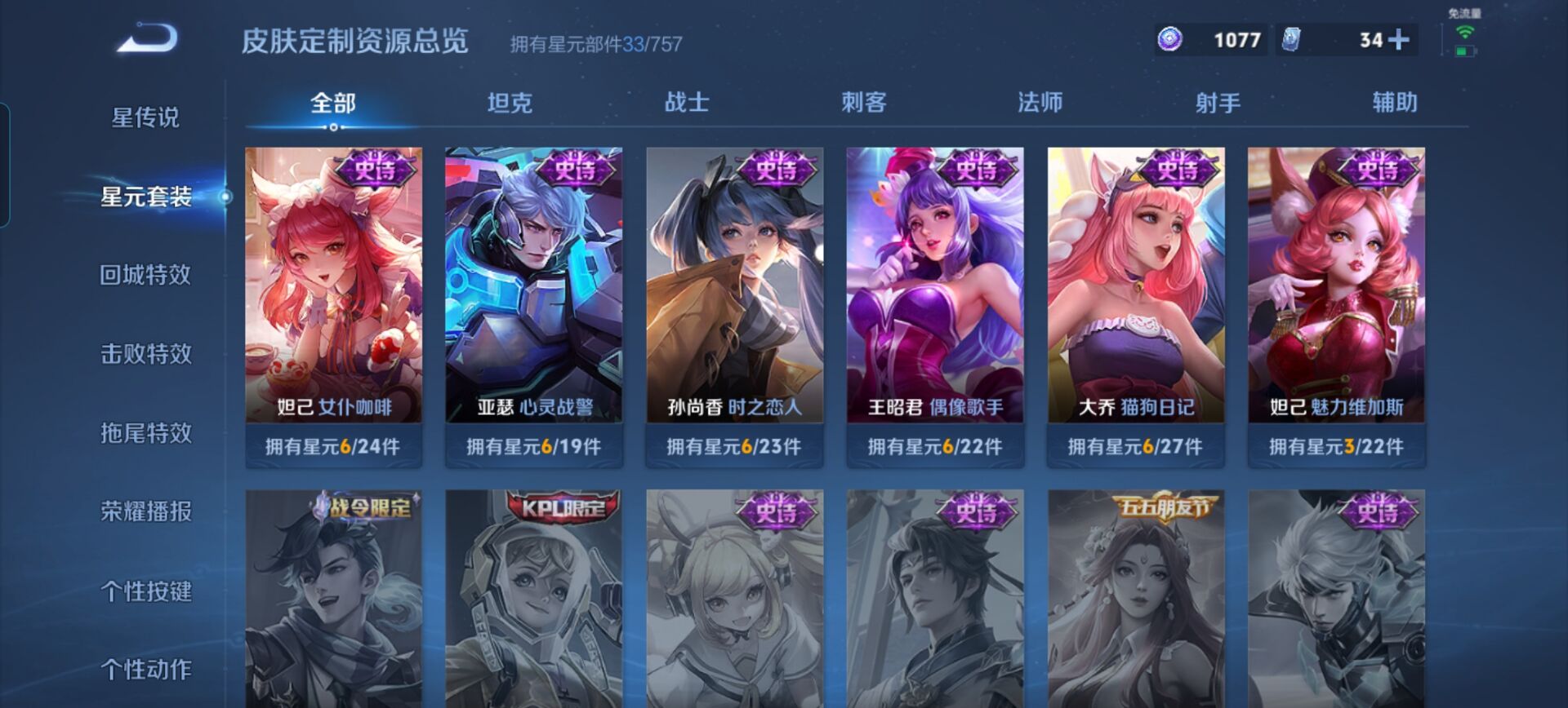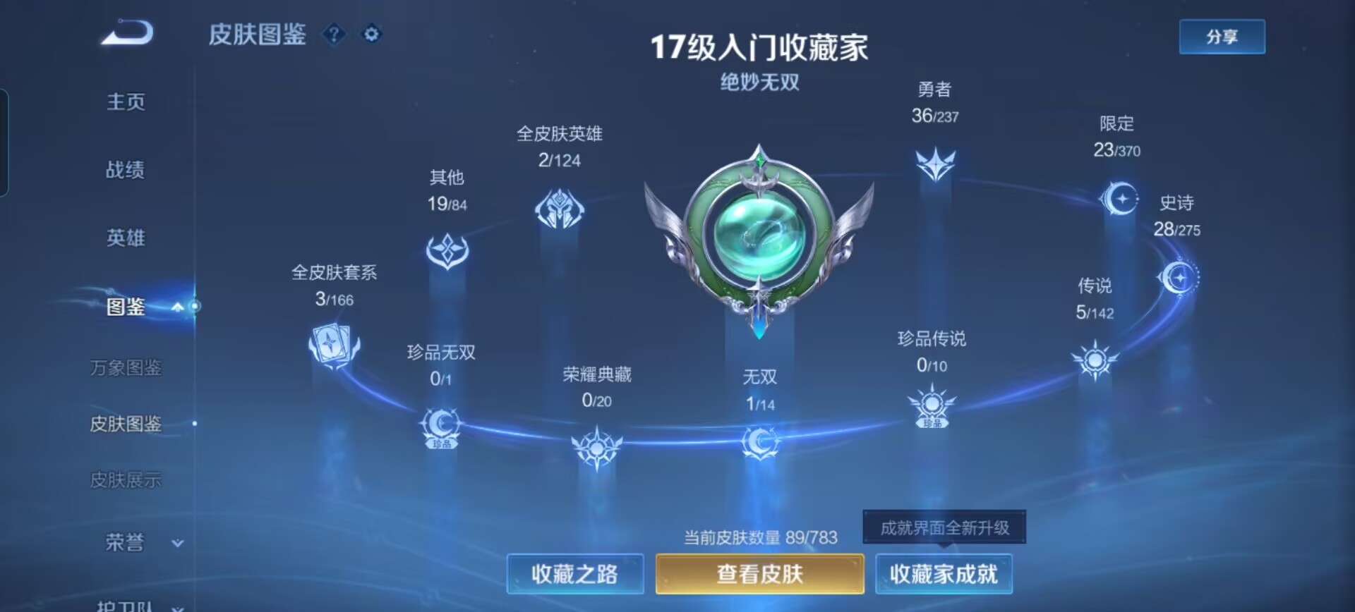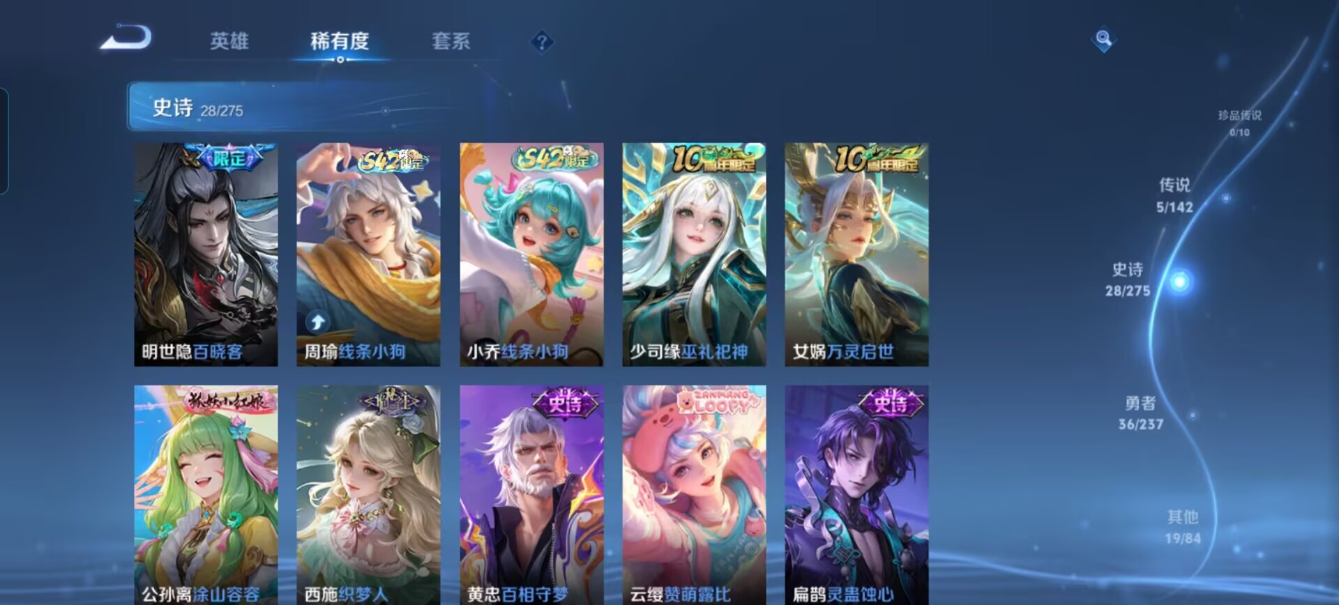 贵族等级:v6皮肤数:89传说品质5 情人节限定1 生肖限定1 无双1 英雄数:91