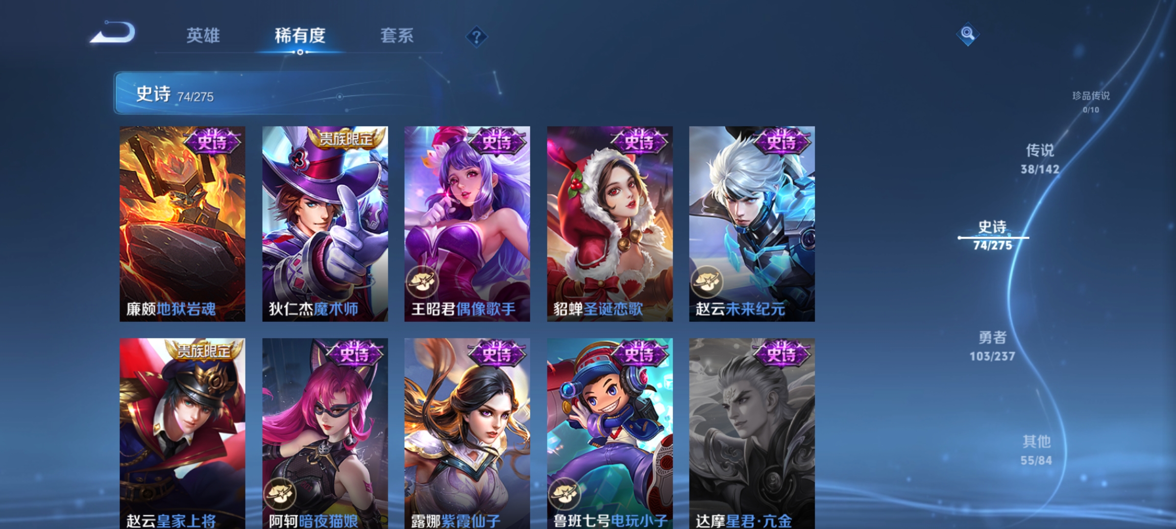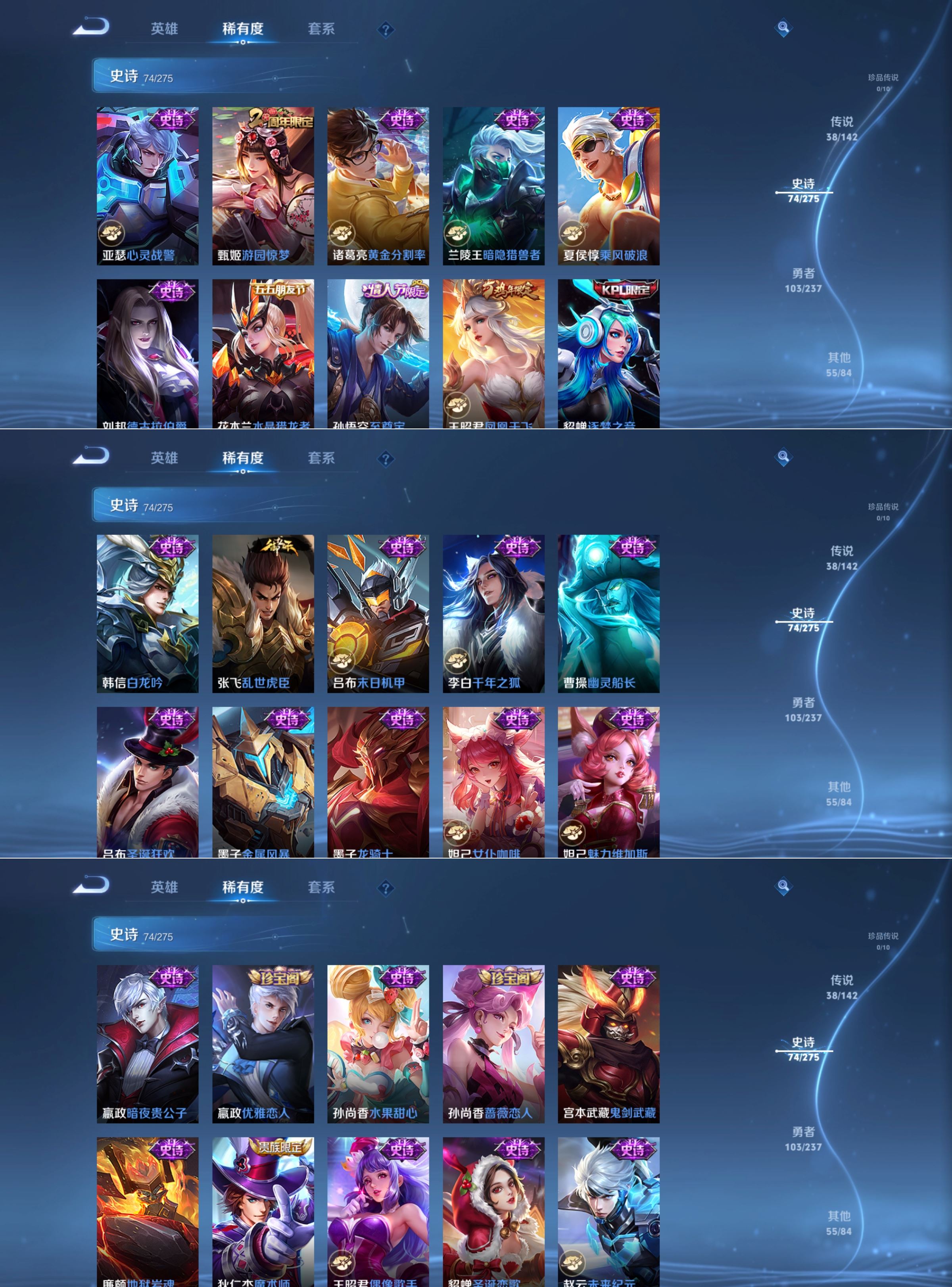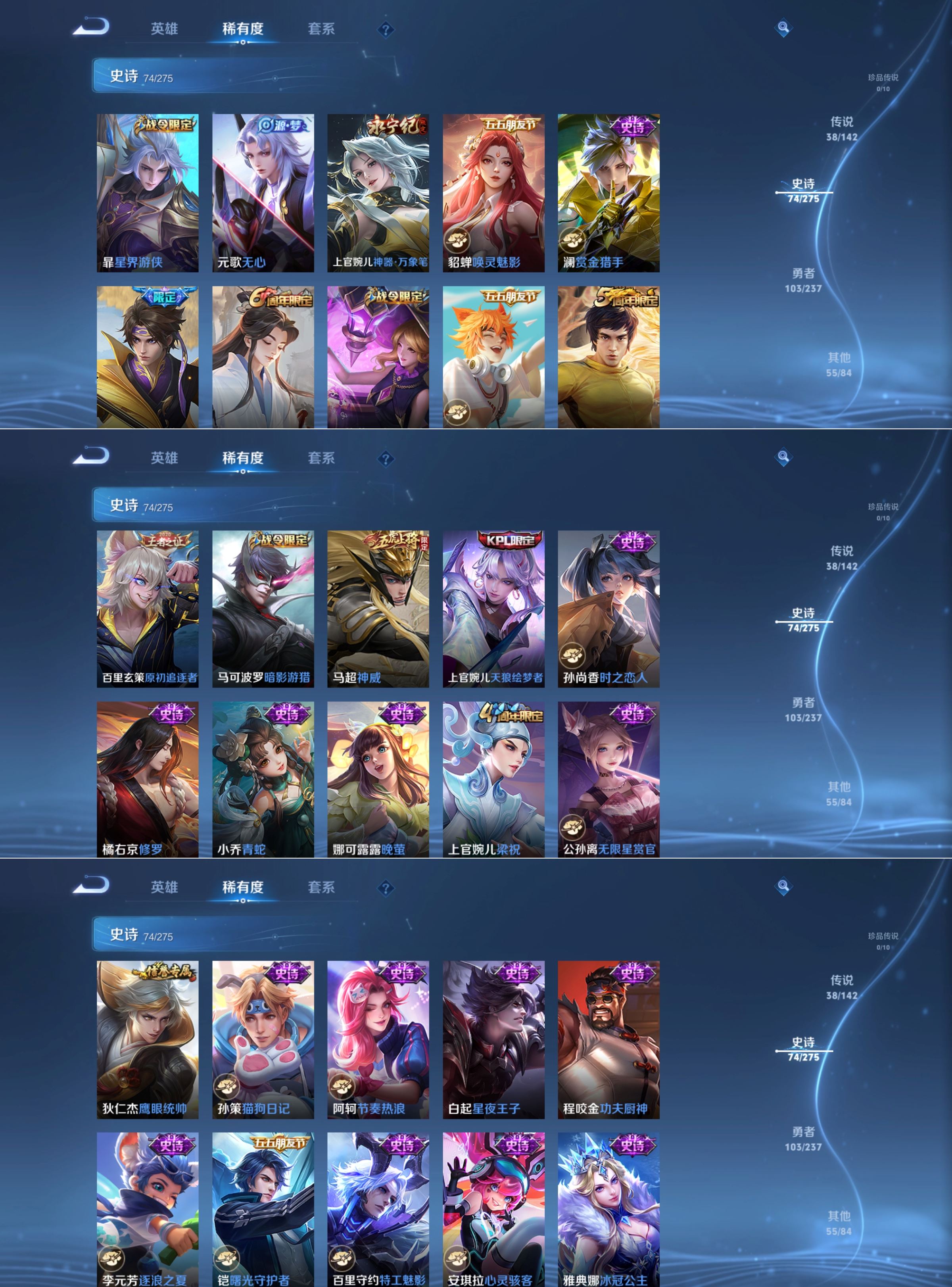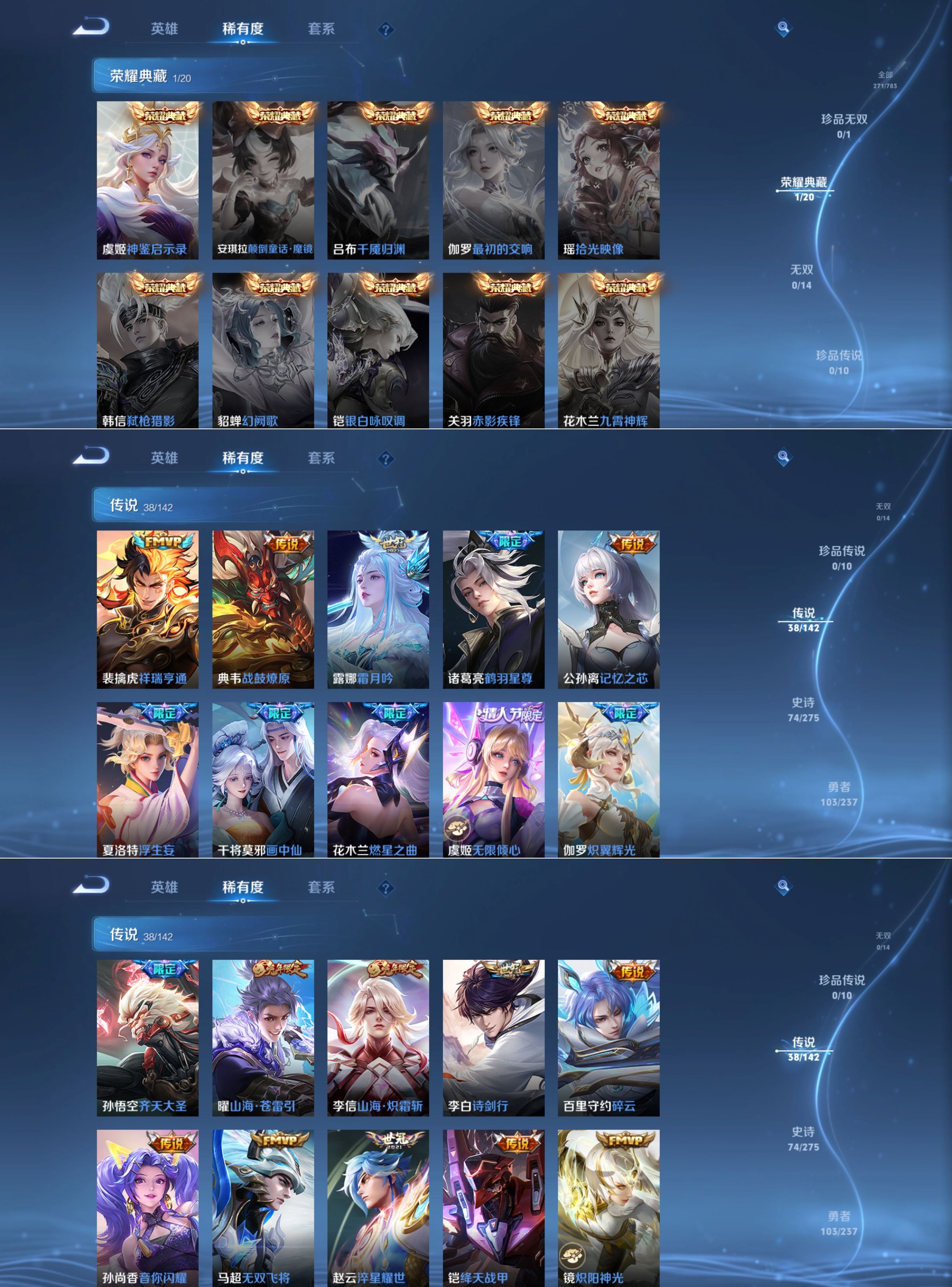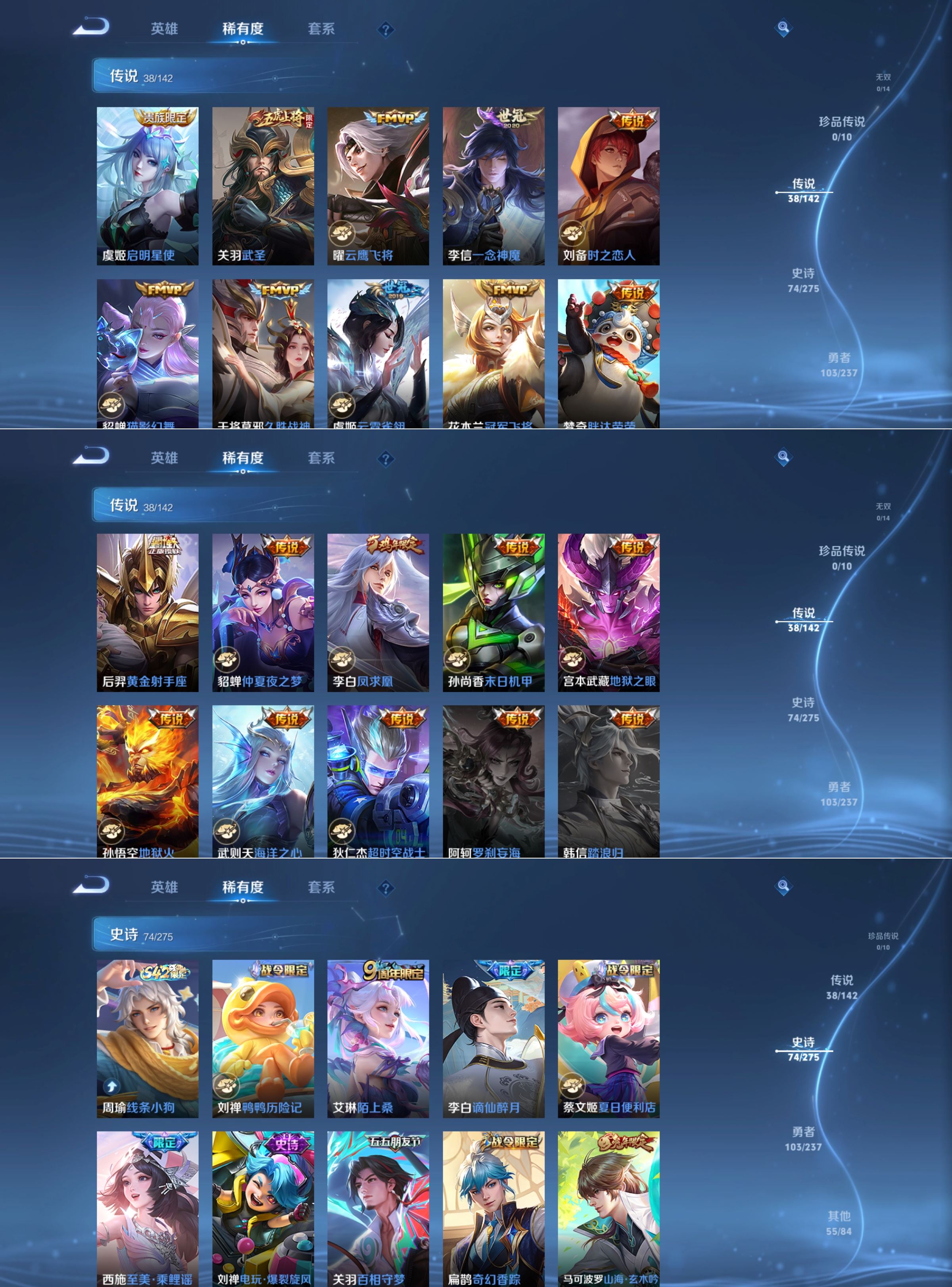 传说品质_后羿_黄金射手座传说品质_关羽_武圣传说品质_典韦_战鼓燎原传说品质_诸葛亮_鹤羽星尊传说品质_孙悟空_齐天大圣传说品质_孙悟空_地狱火传说品质_马超_无双飞将传说品质_武则天_海洋之心传说品质_干将莫邪_画中仙传说品质_干将莫邪_久胜战神传说品质_宫本武藏_地狱之眼传说品质_花木兰_冠军飞将传说品质_花木兰_燃星之曲传说品质_镜_炽阳神光传说品质_貂蝉_猫影幻舞传说品质_貂蝉_仲夏夜之梦传说品质_李信_一念神魔传说品质_李信_山海·炽霜斩传说品质_孙尚香_末日机甲传说品质_孙尚香_音你闪耀传说品质_梦奇_胖达荣荣传说品质_露娜_霜月吟传说品质_刘备_时之恋人传说品质_李白_凤求凰传说品质_李白_诗剑行传说品质_公孙离_记忆之芯传说品质_百里守约_碎云传说品质_伽罗_炽翼辉光传说品质_夏洛特_浮生妄传说品质_曜_云鹰飞将传说品质_曜_山海·苍雷引传说品质_狄仁杰_超时空战士传说品质_铠_绛天战甲传说品质_虞姬_无限倾心传说品质_虞姬_云霓雀翎传说品质_虞姬_启明星使传说品质_赵云_淬星耀世传说品质_裴擒虎_祥瑞亨通