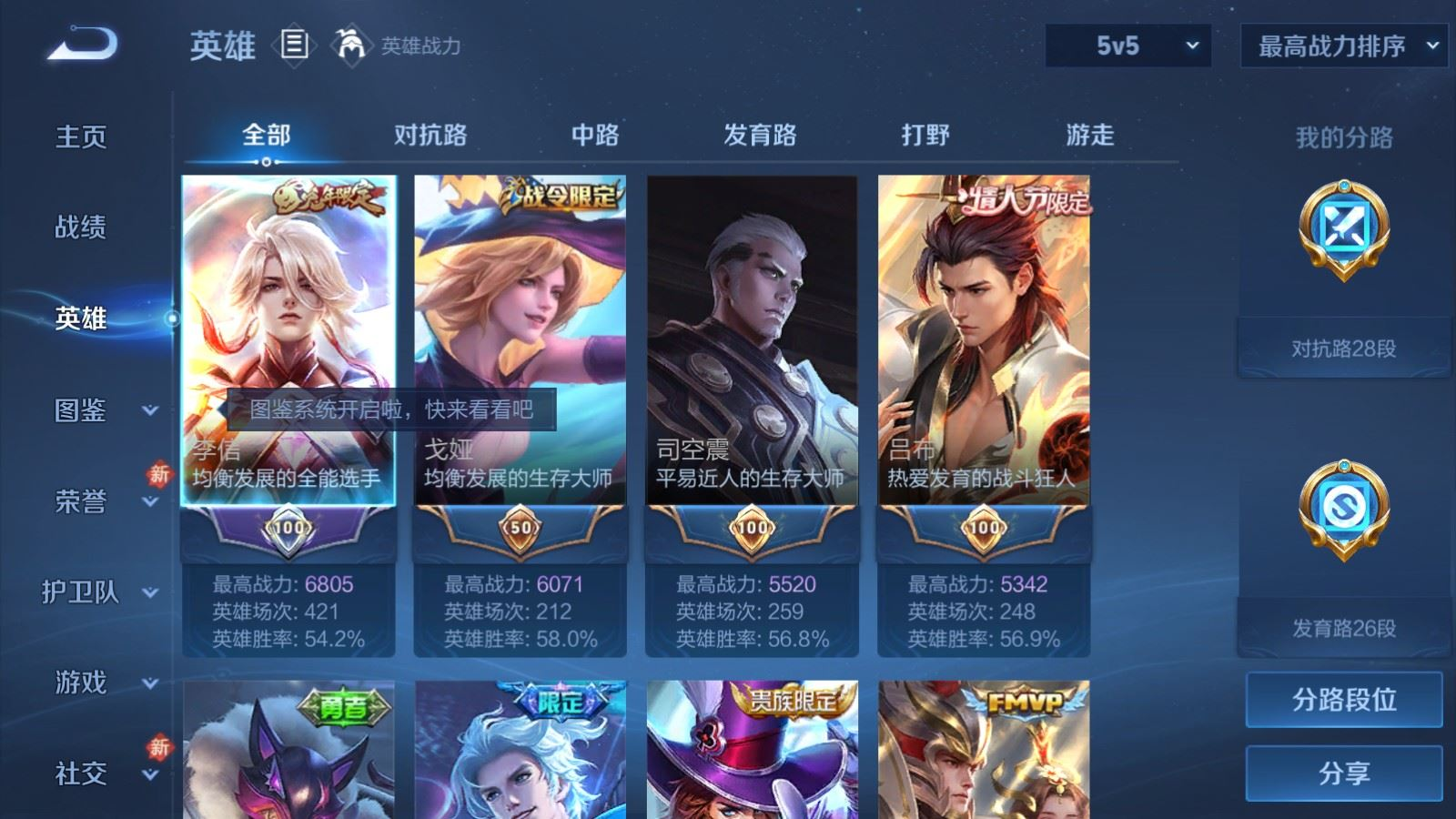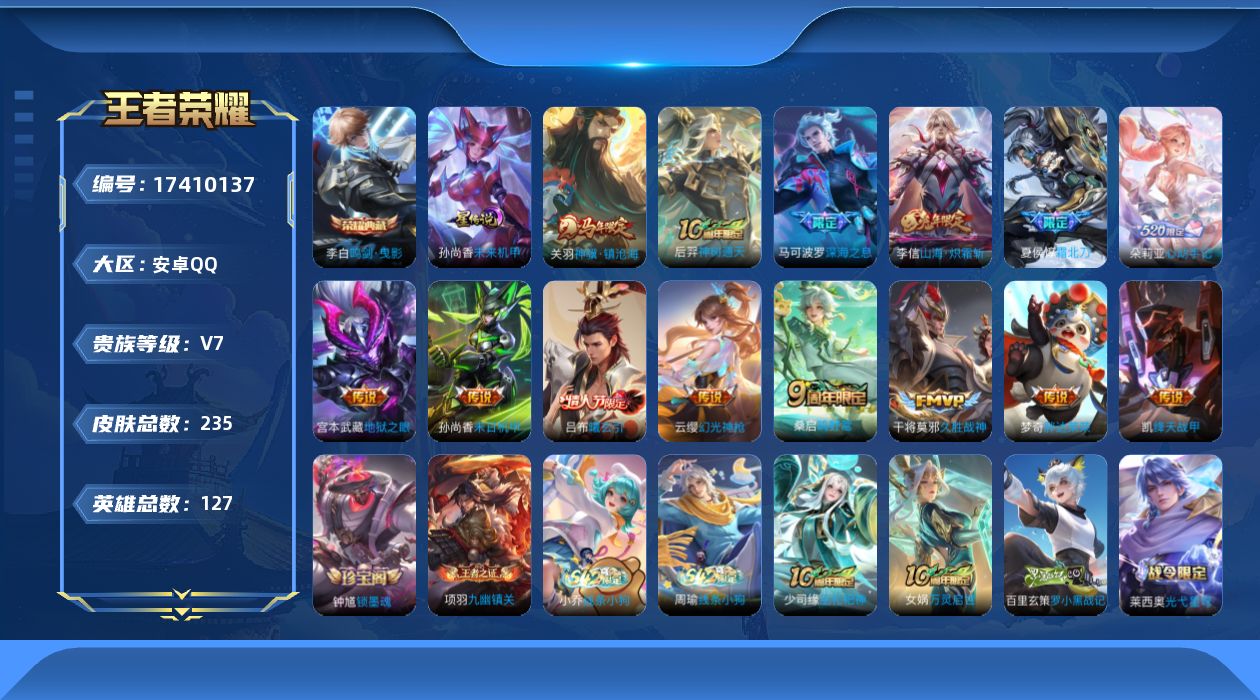 贵族等级:v7皮肤数:235传说品质14 生肖限定2 情人节限定1 荣耀典藏1 英雄数:127