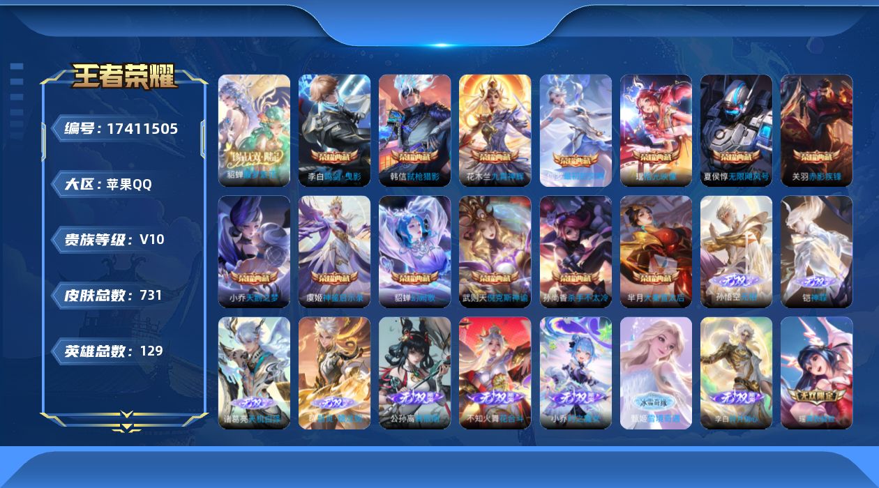 贵族等级:v10皮肤数:731生肖限定40 传说品质127 情人节限定17 荣耀典藏13 无双13 珍品传说9 珍品无双1 英雄数:129