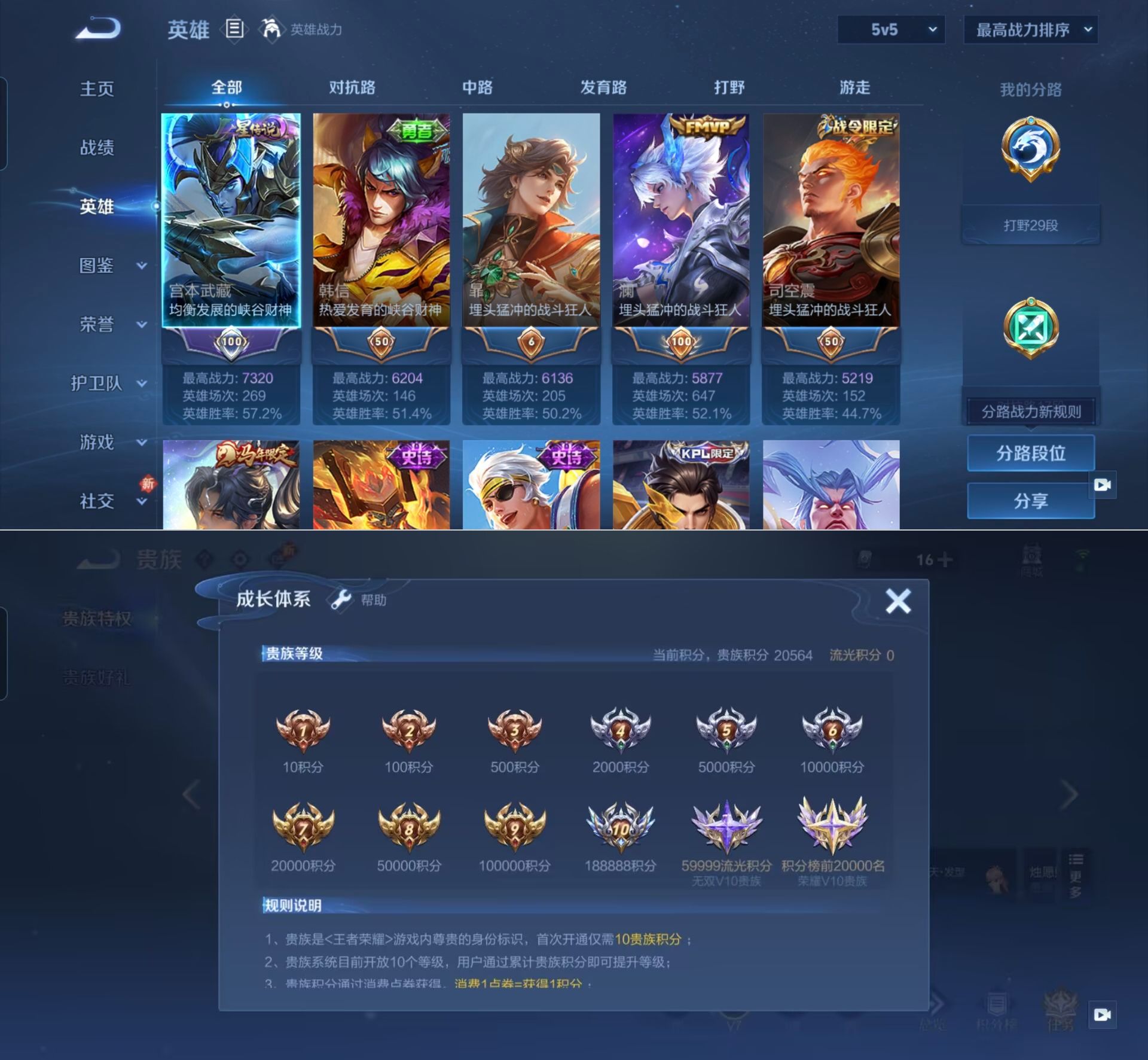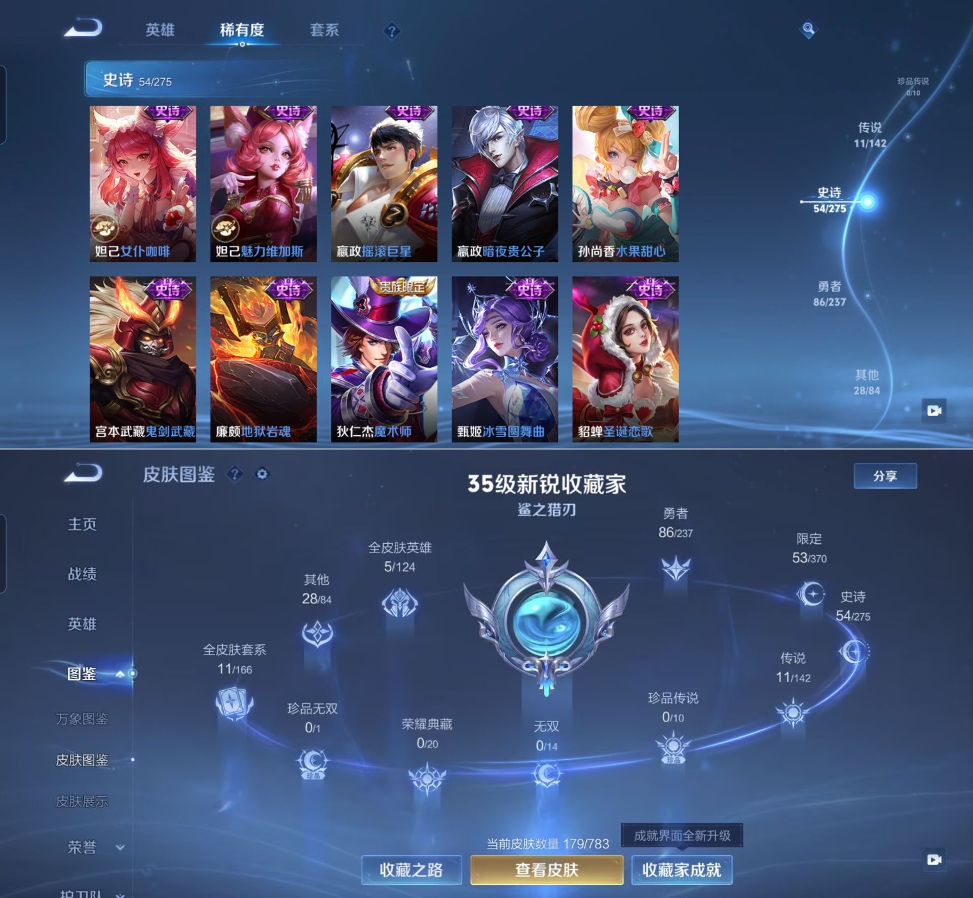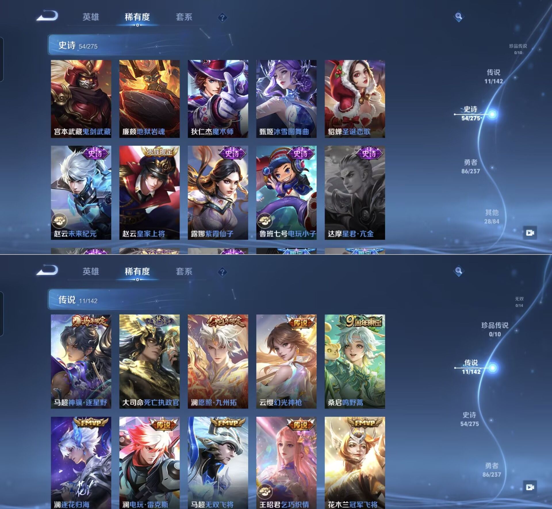 贵族等级:v7皮肤数:179传说品质11 生肖限定2 英雄数:127
