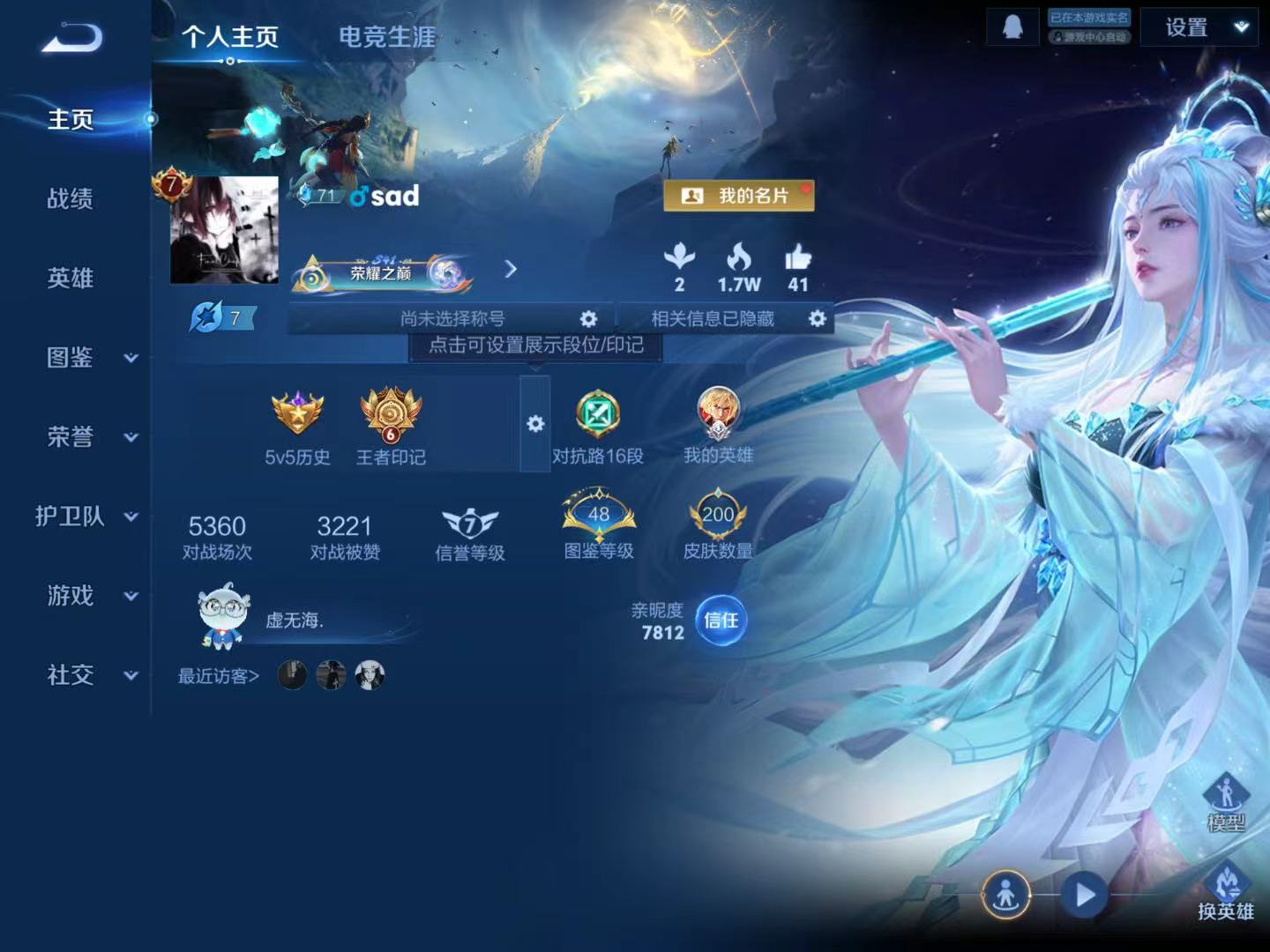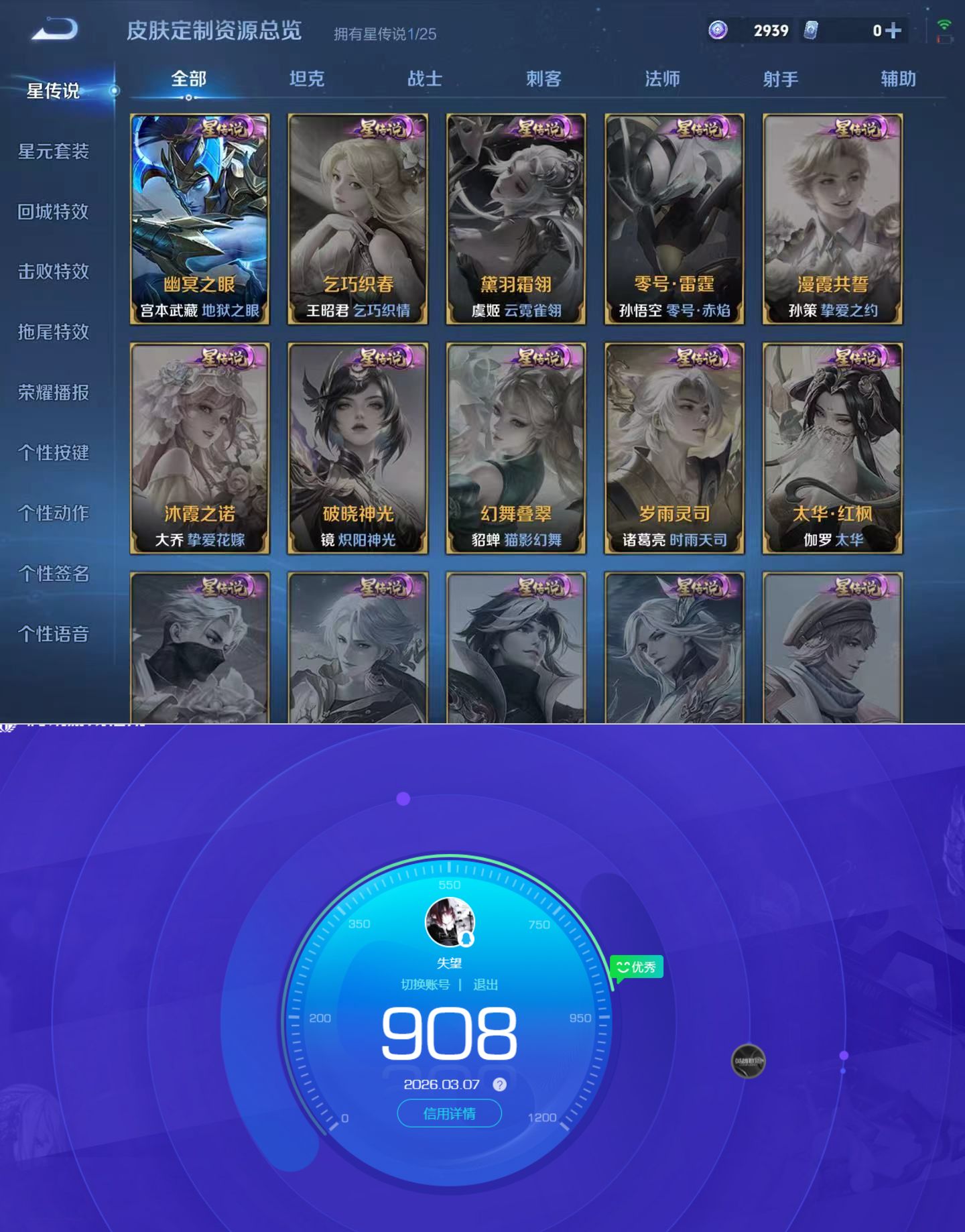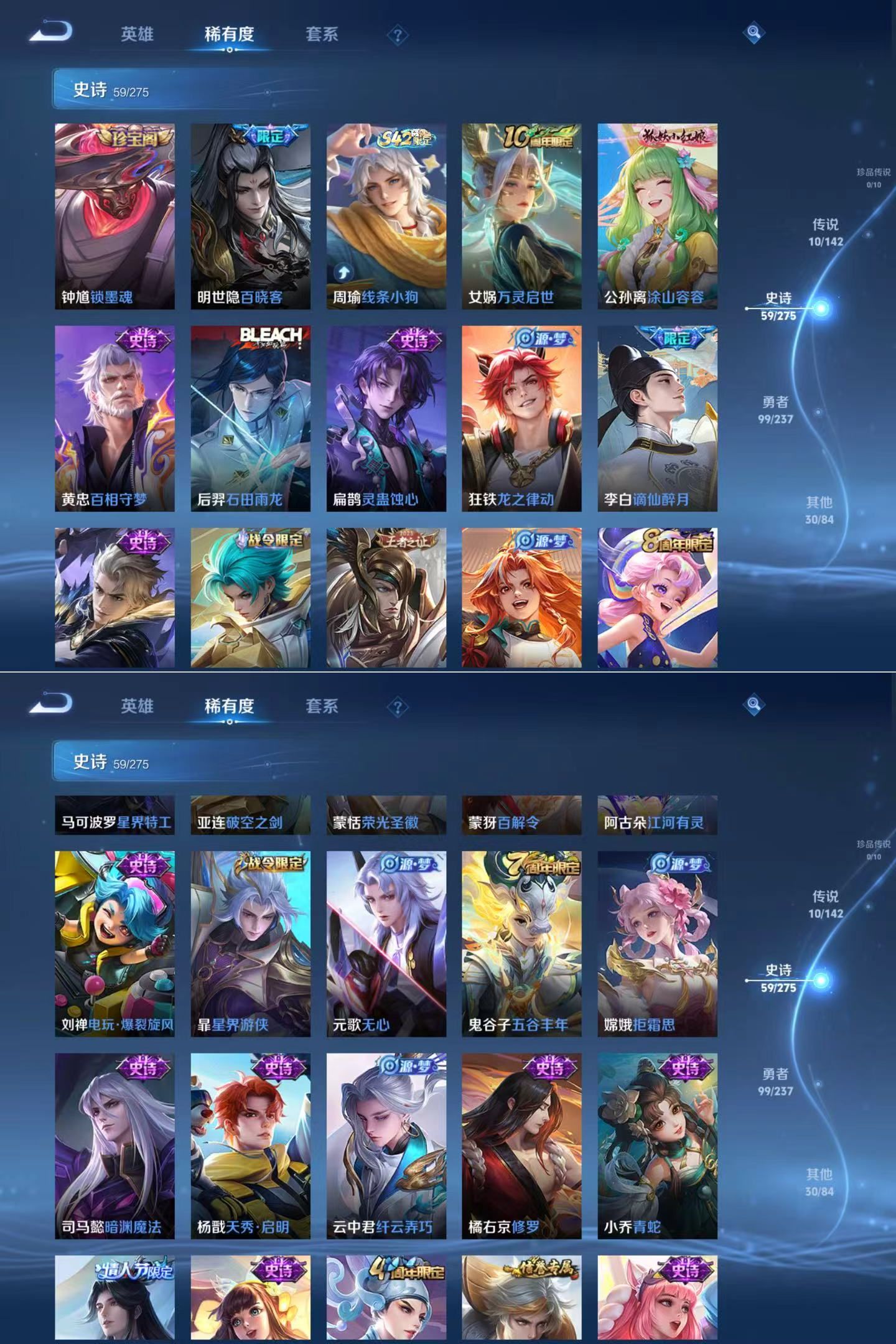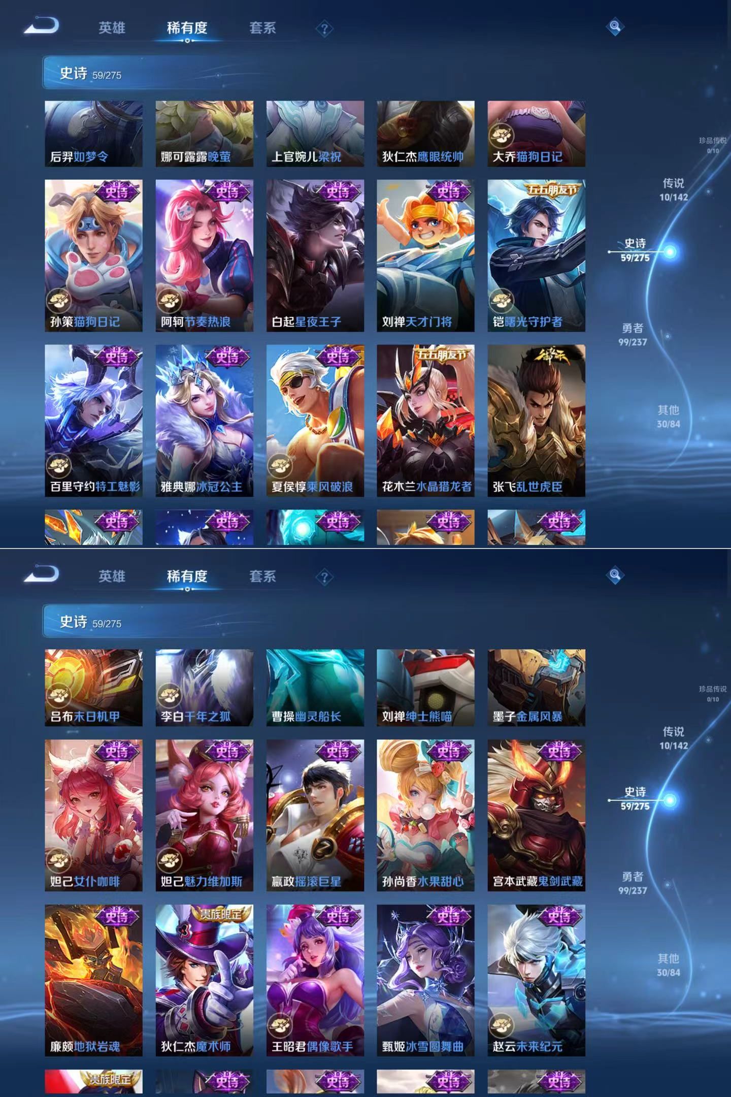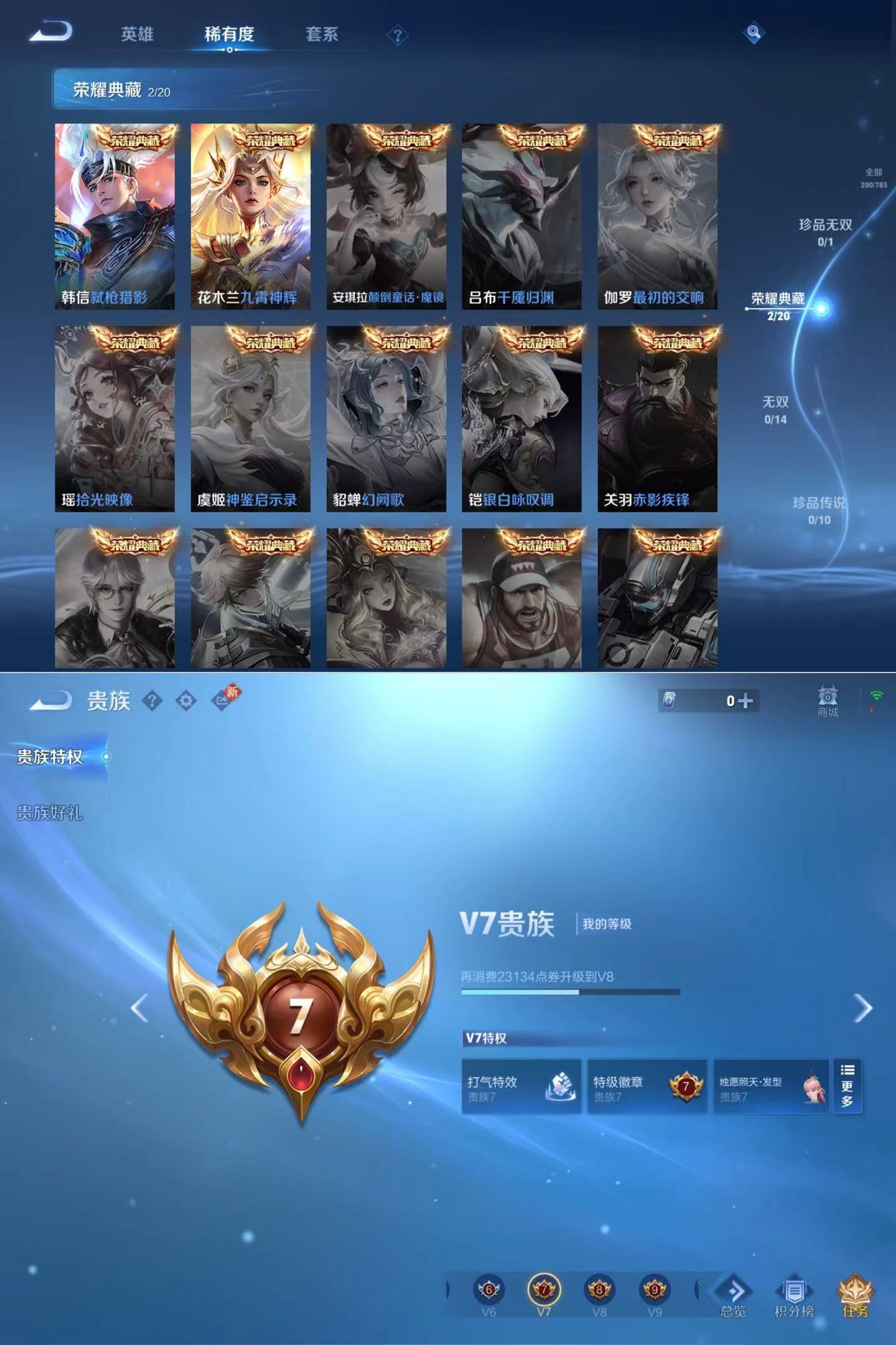 贵族等级:v7皮肤数:200情人节限定1 传说品质10 生肖限定3 荣耀典藏2 英雄数:128