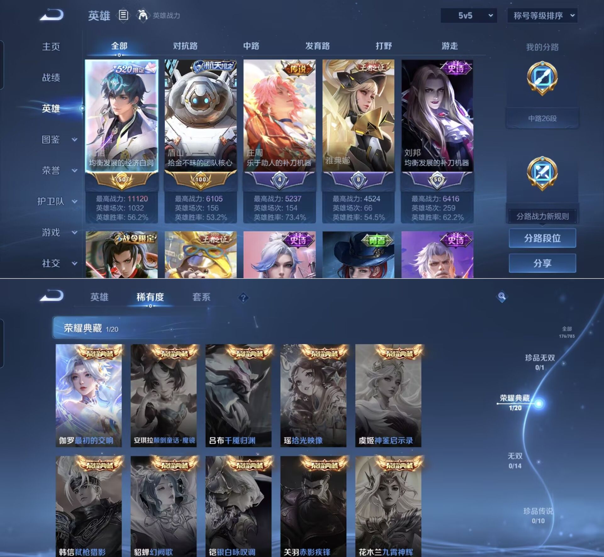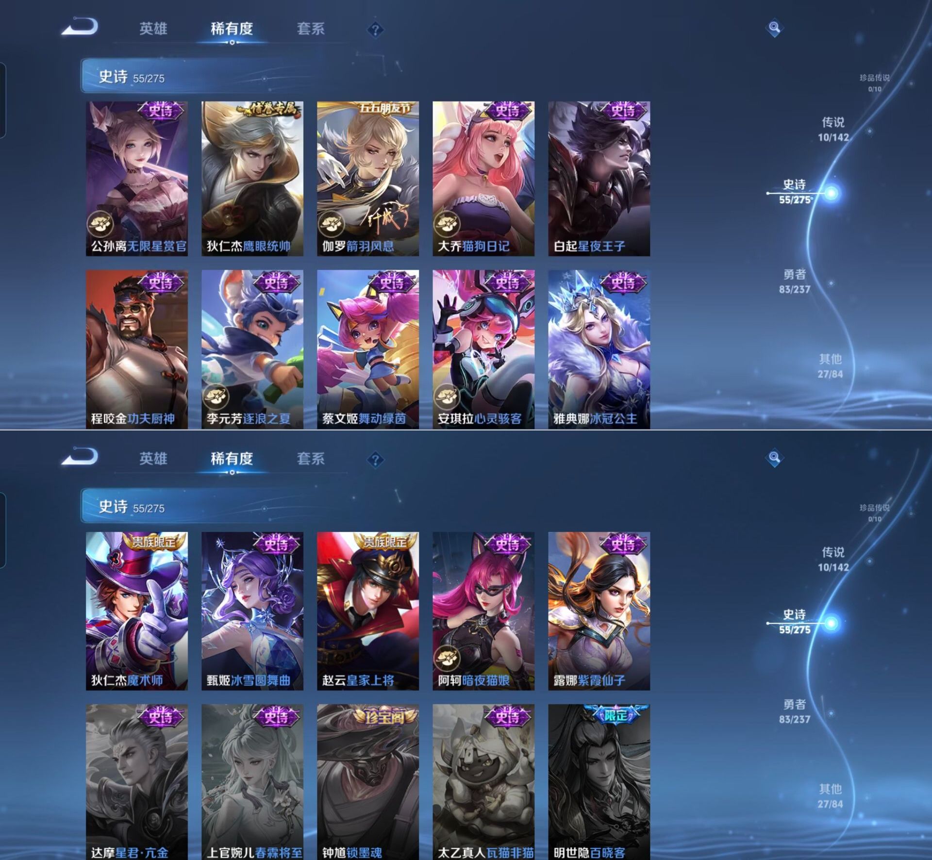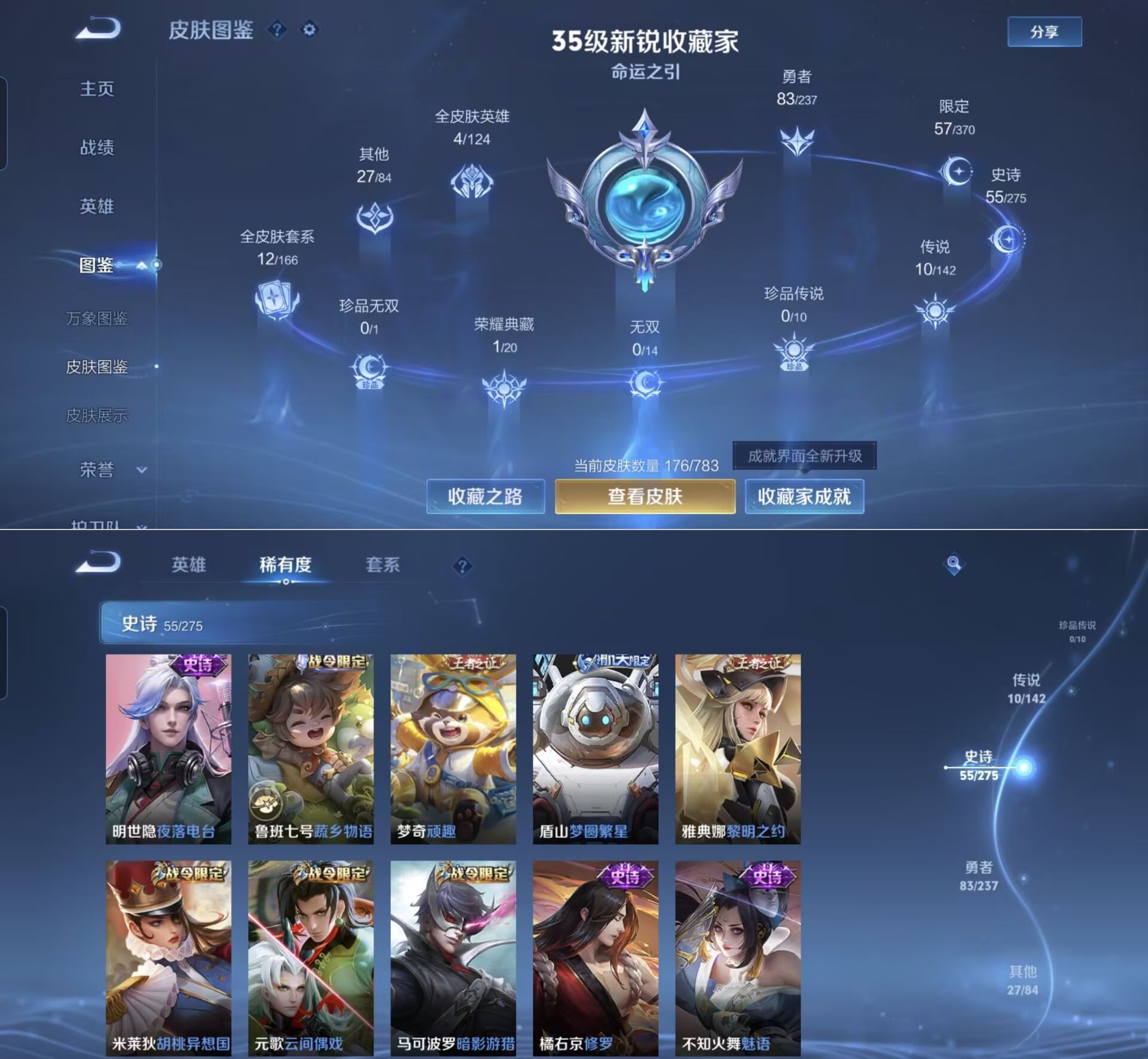贵族等级:v6皮肤数:176传说品质10 荣耀典藏1 生肖限定1 英雄数:124