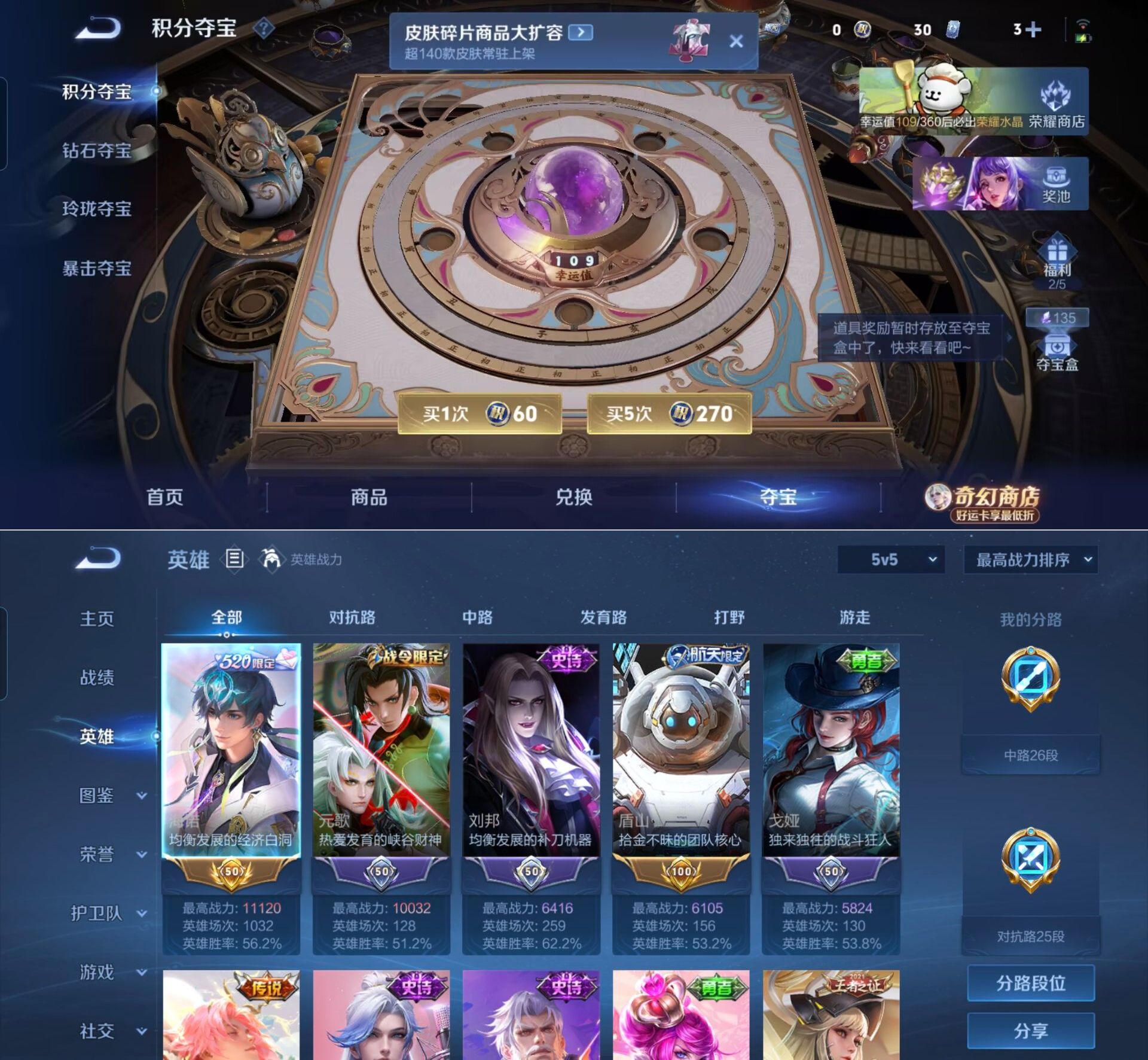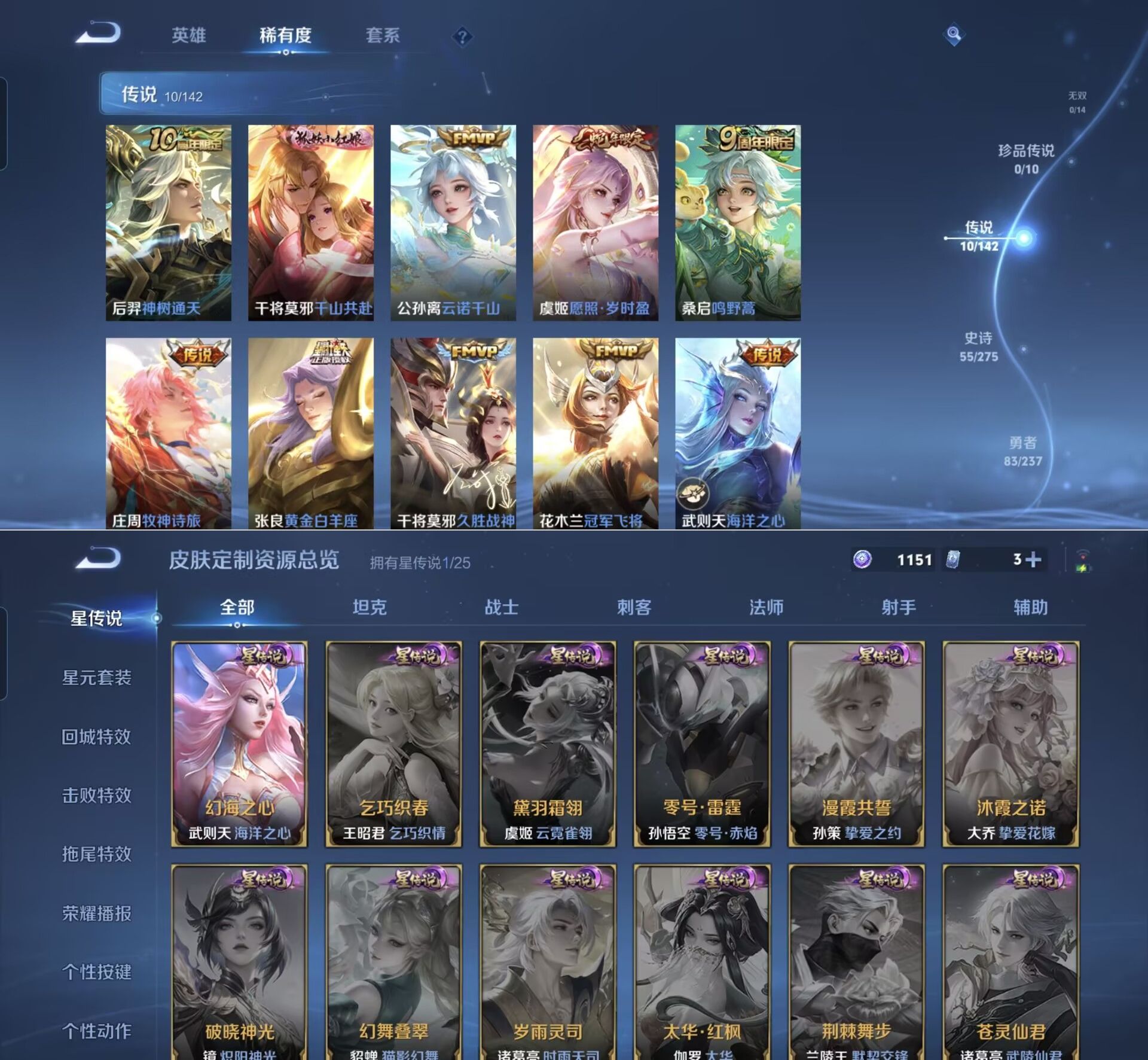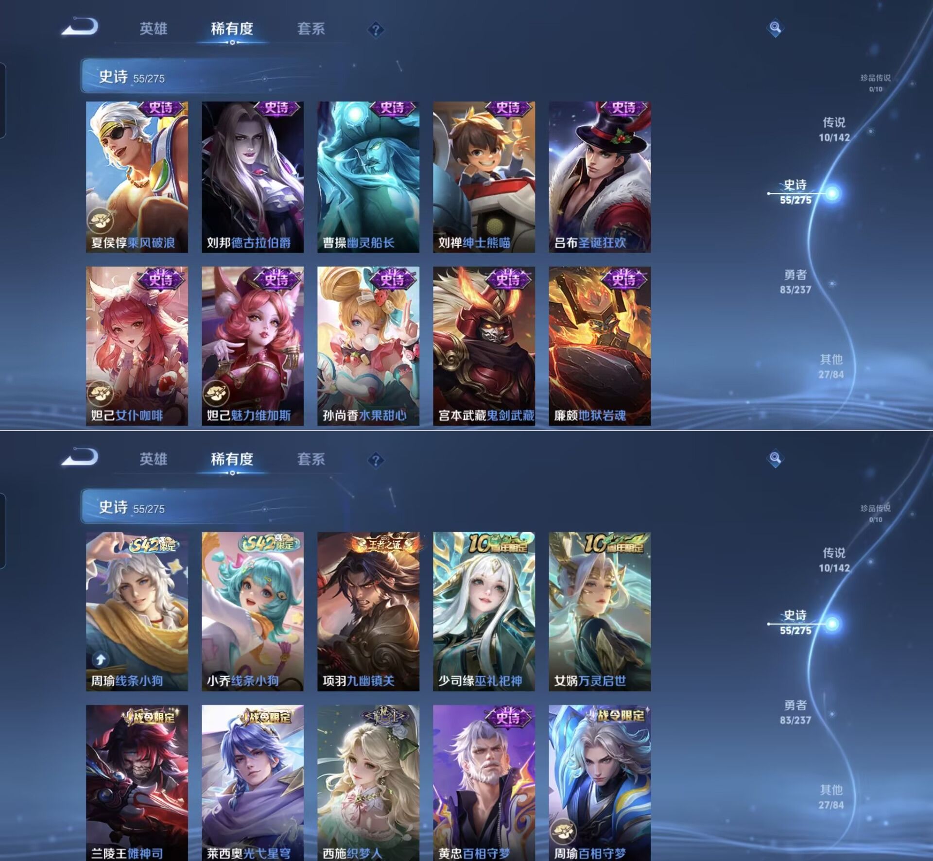 贵族等级:v6皮肤数:176传说品质10 荣耀典藏1 生肖限定1 英雄数:124