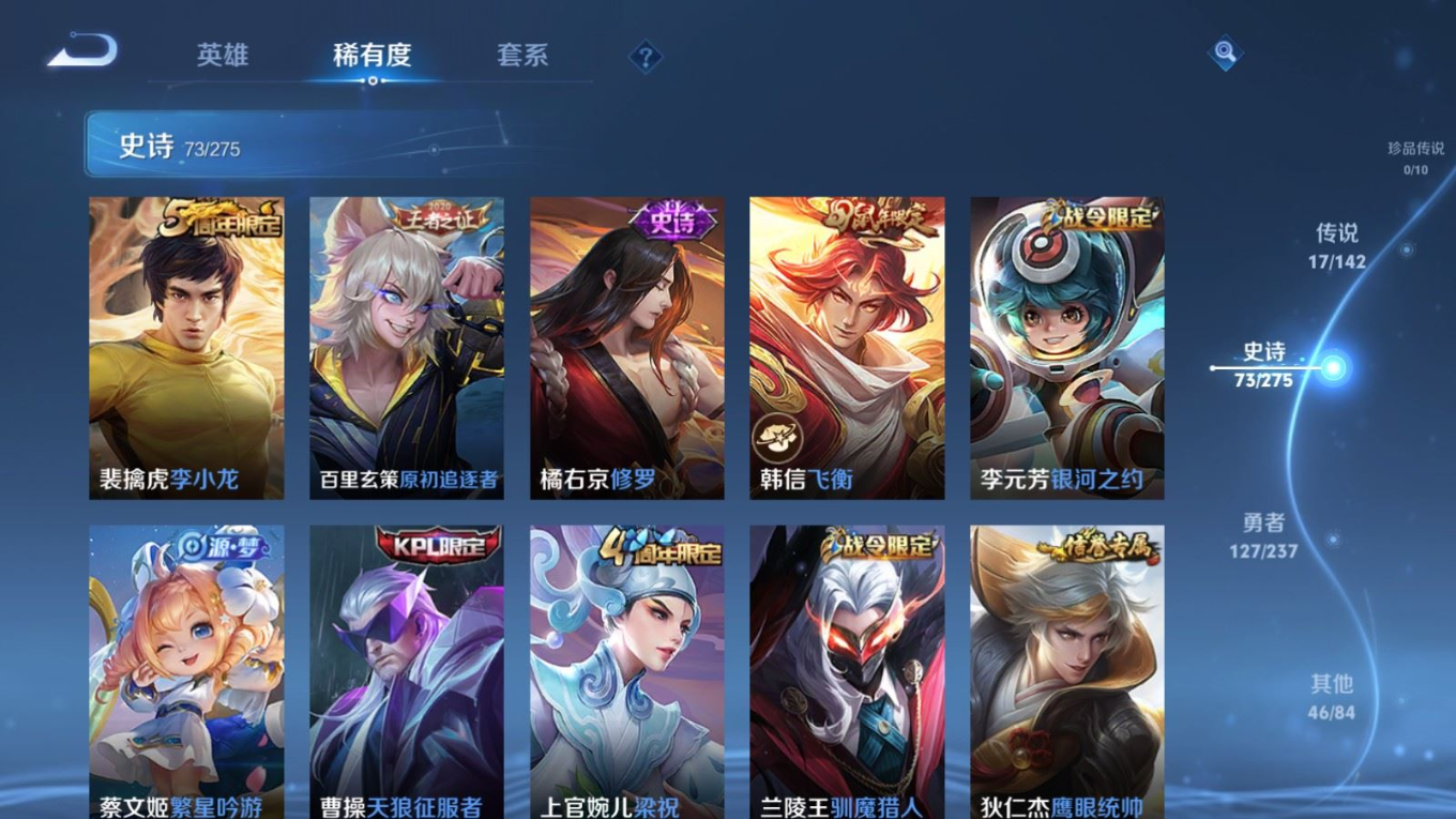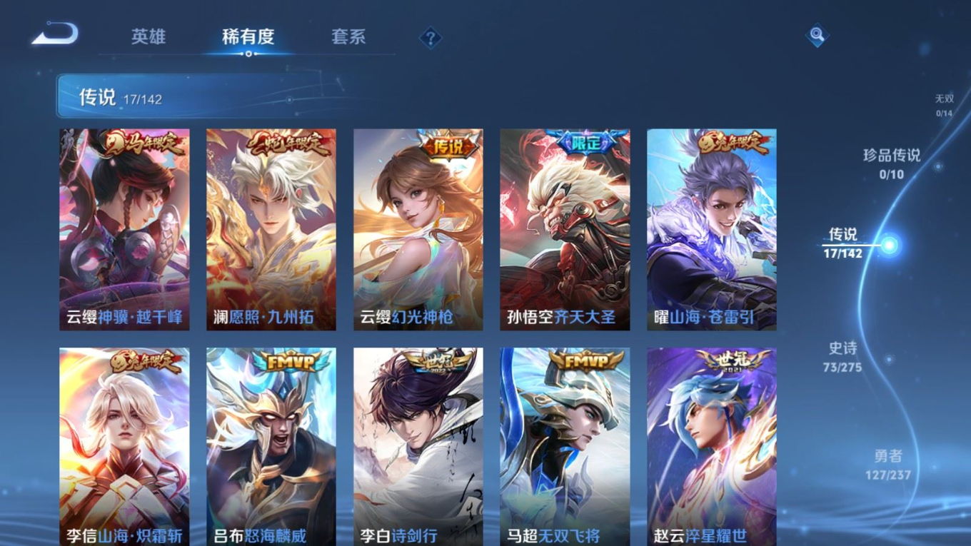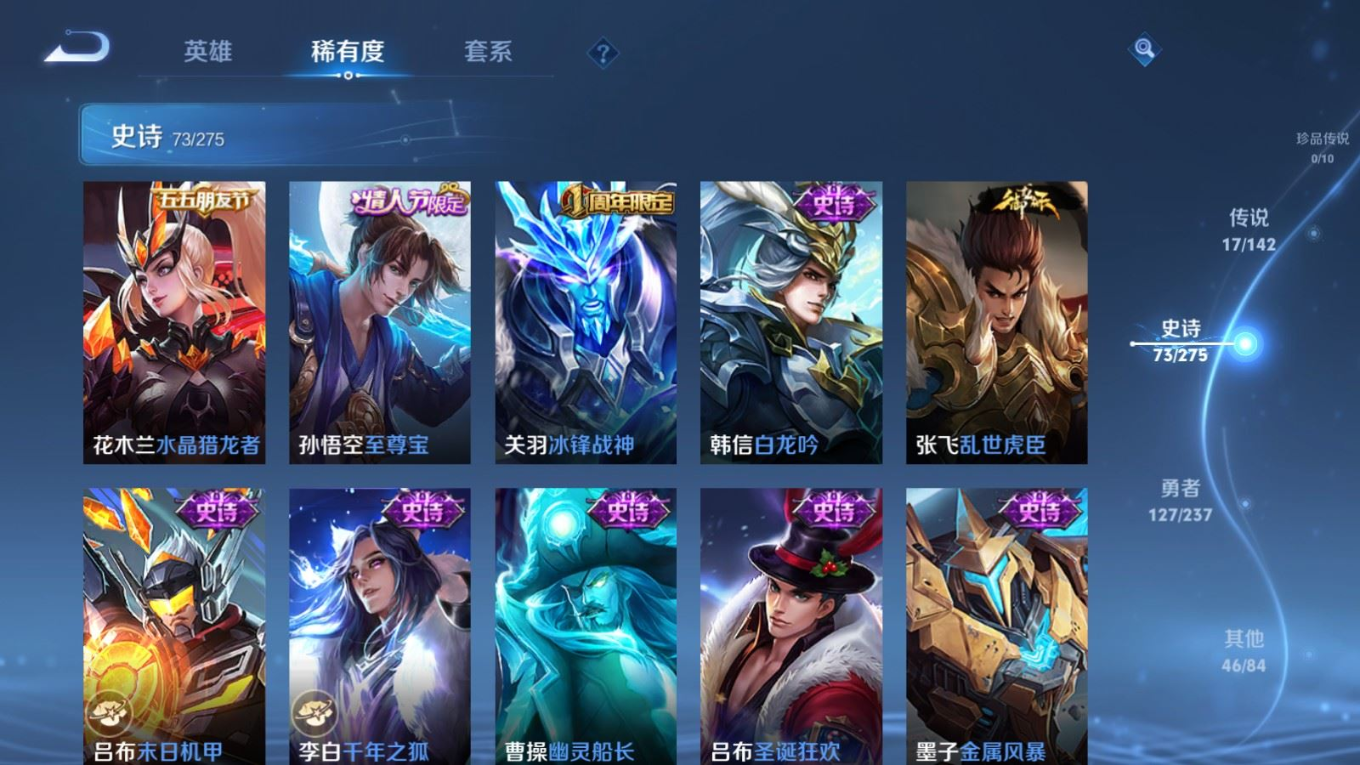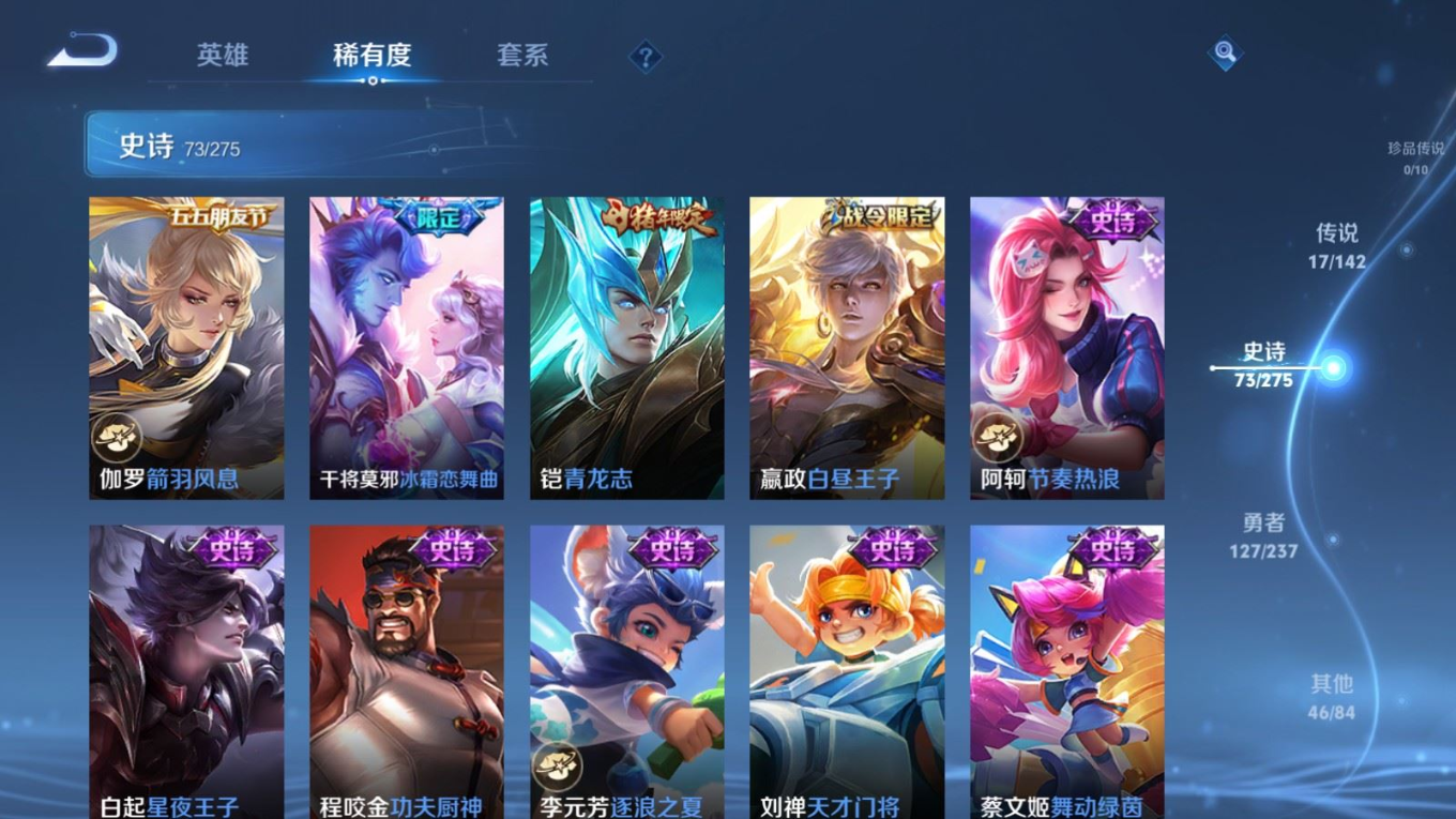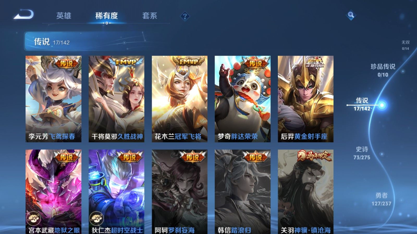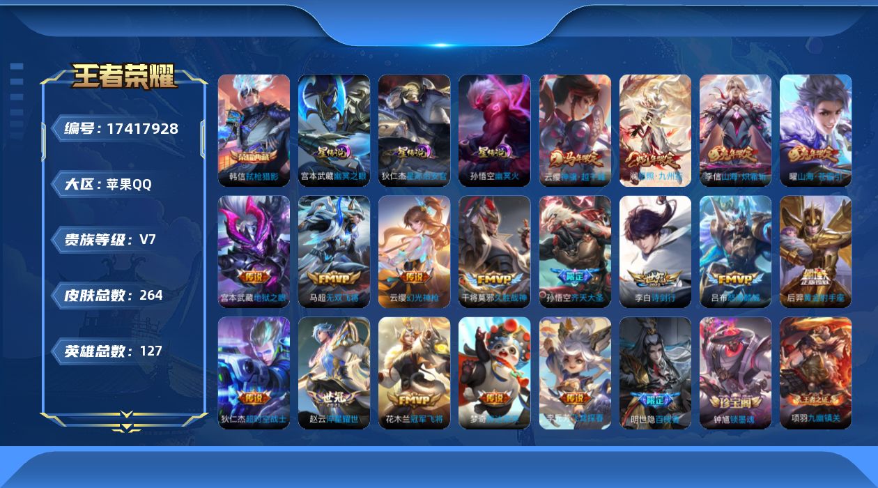 贵族等级:v7皮肤数:264生肖限定7 传说品质17 情人节限定1 荣耀典藏1 英雄数:127
