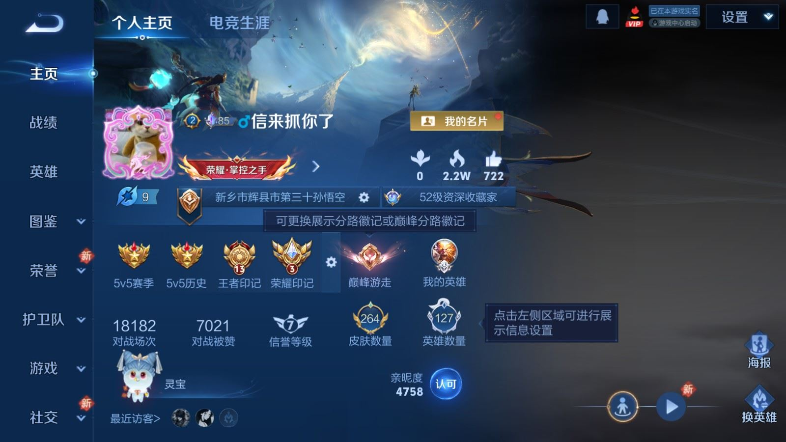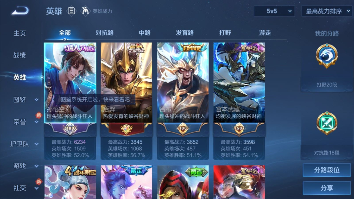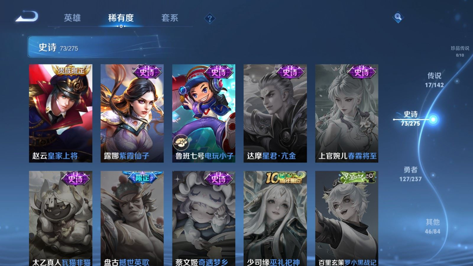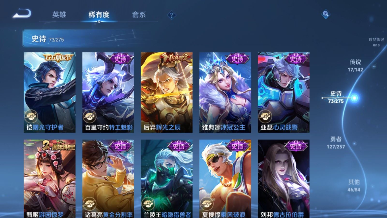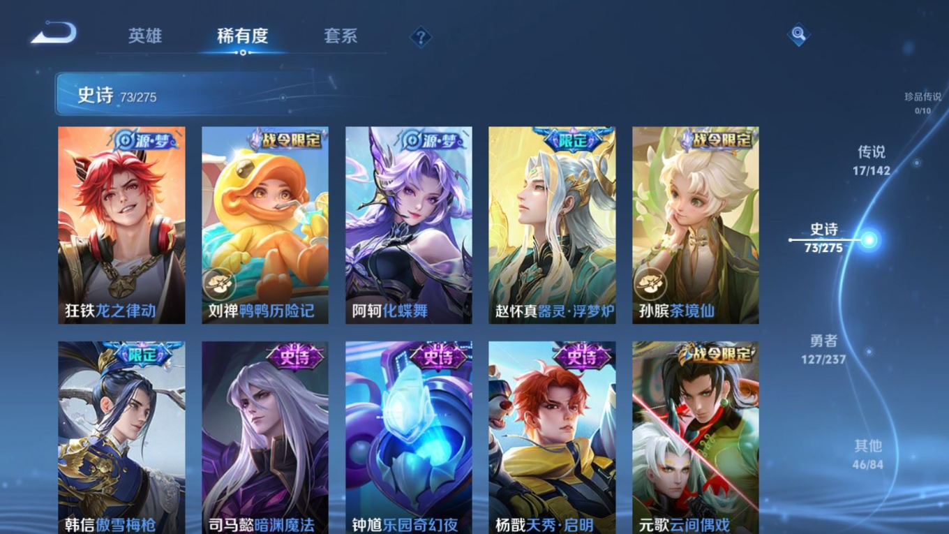 贵族等级:v7皮肤数:264生肖限定7 传说品质17 情人节限定1 荣耀典藏1 英雄数:127