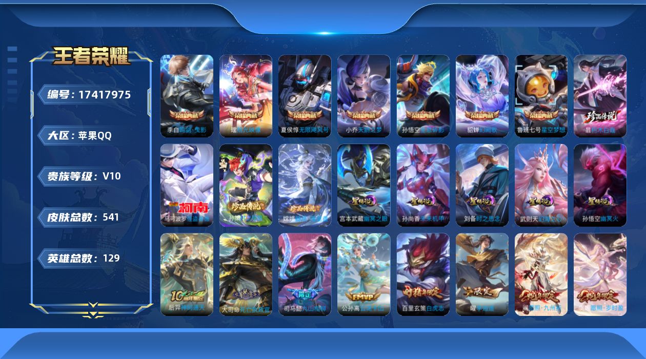 贵族等级:v10皮肤数:541生肖限定33 传说品质71 情人节限定6 荣耀典藏7 珍品传说4 英雄数:129