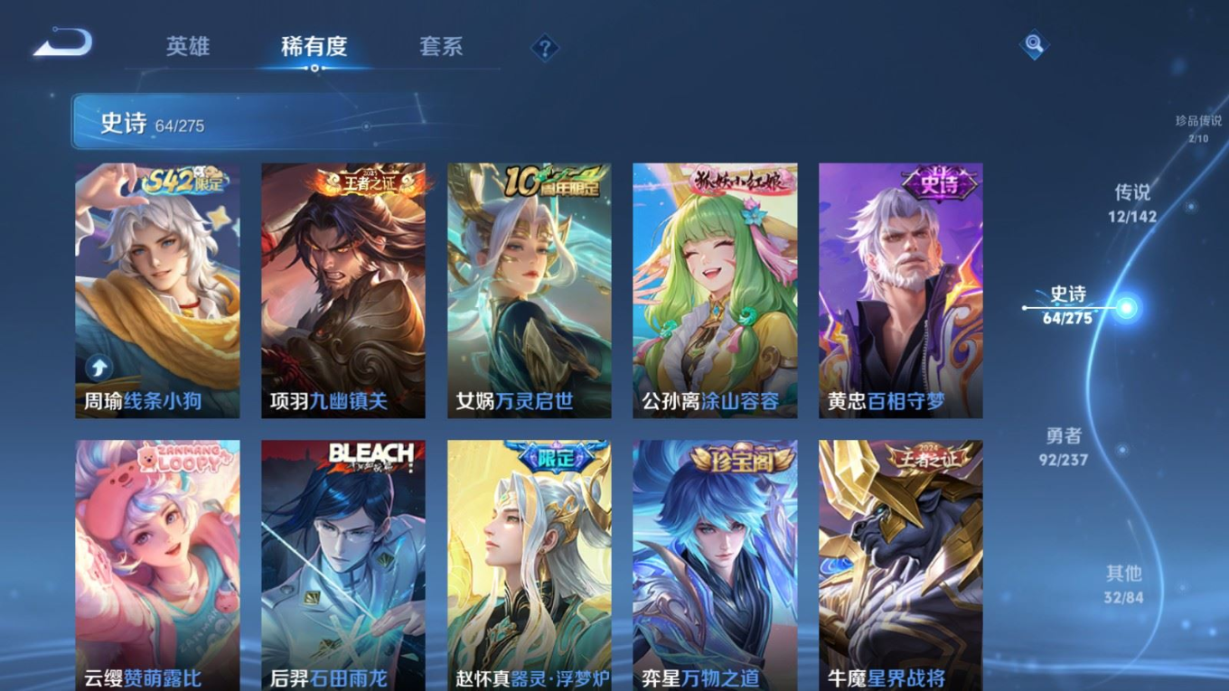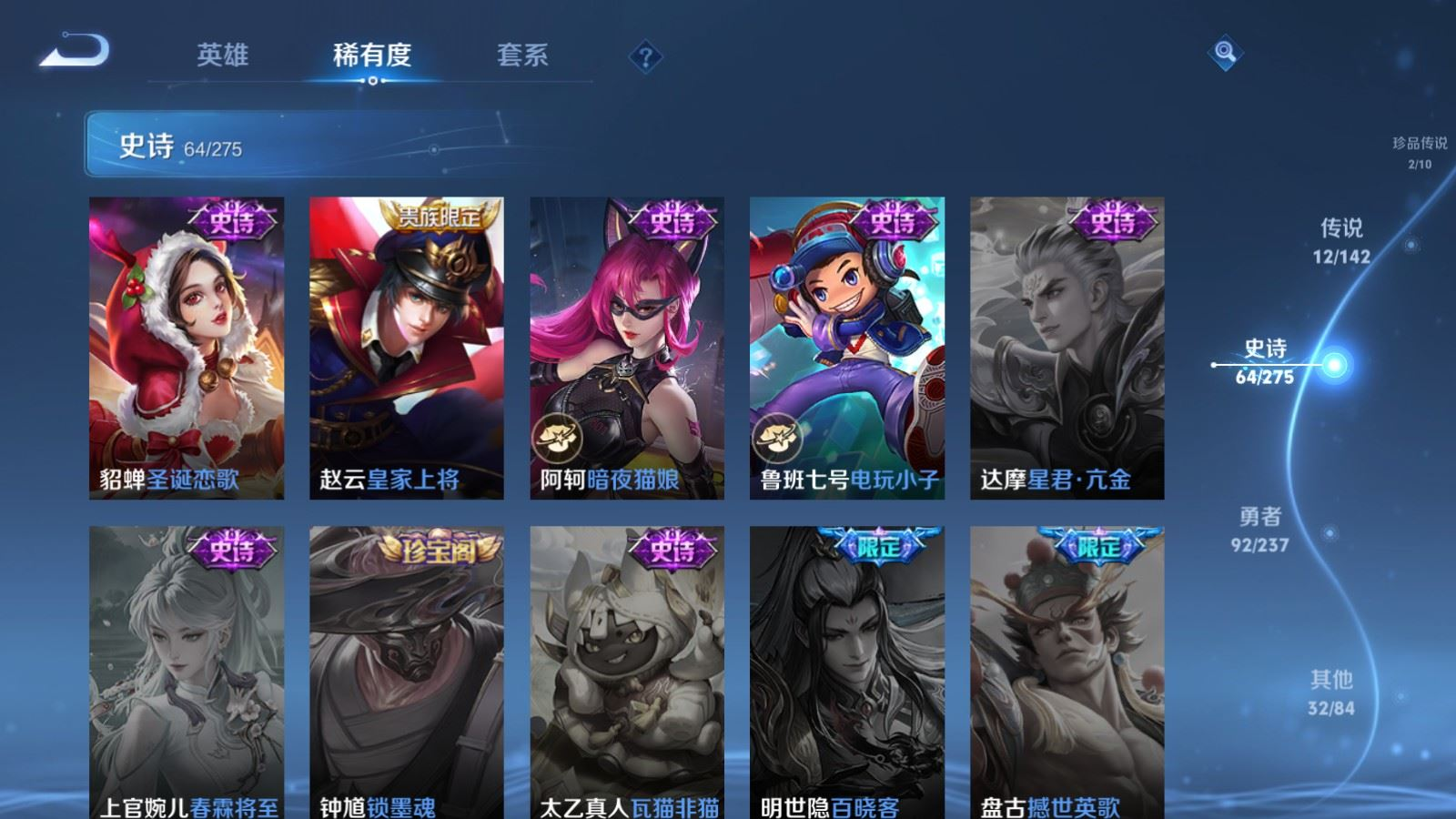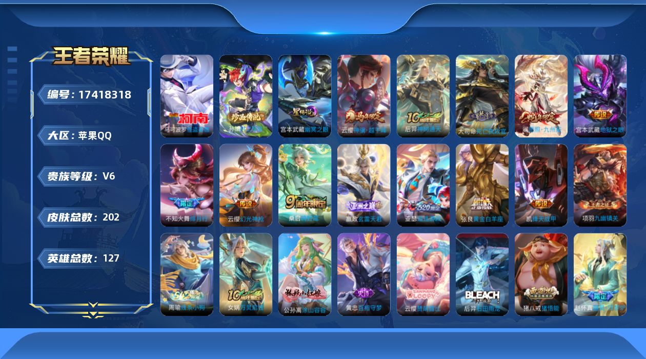 贵族等级:v6皮肤数:202传说品质12 生肖限定2 珍品传说2 英雄数:127