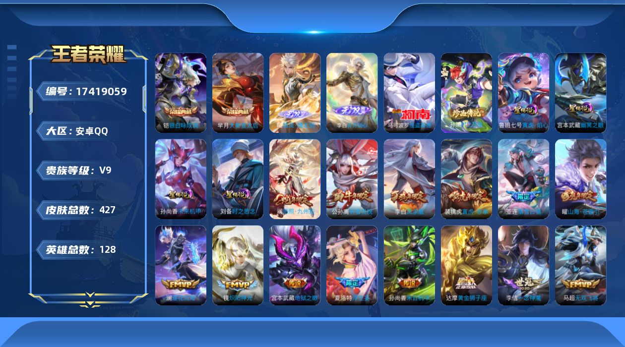贵族等级:v9皮肤数:427传说品质48 生肖限定14 情人节限定4 荣耀典藏2 珍品传说2 无双2 英雄数:128