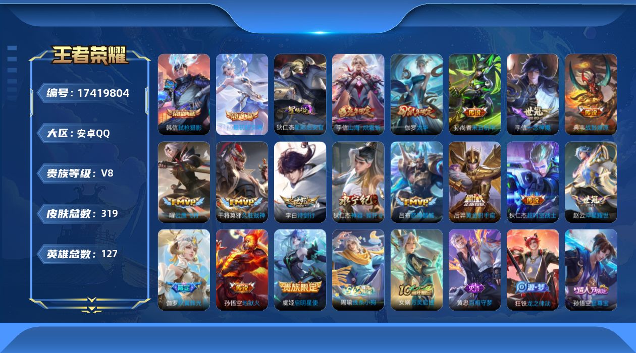 贵族等级:v8皮肤数:319传说品质16 情人节限定2 生肖限定4 荣耀典藏2 英雄数:127
