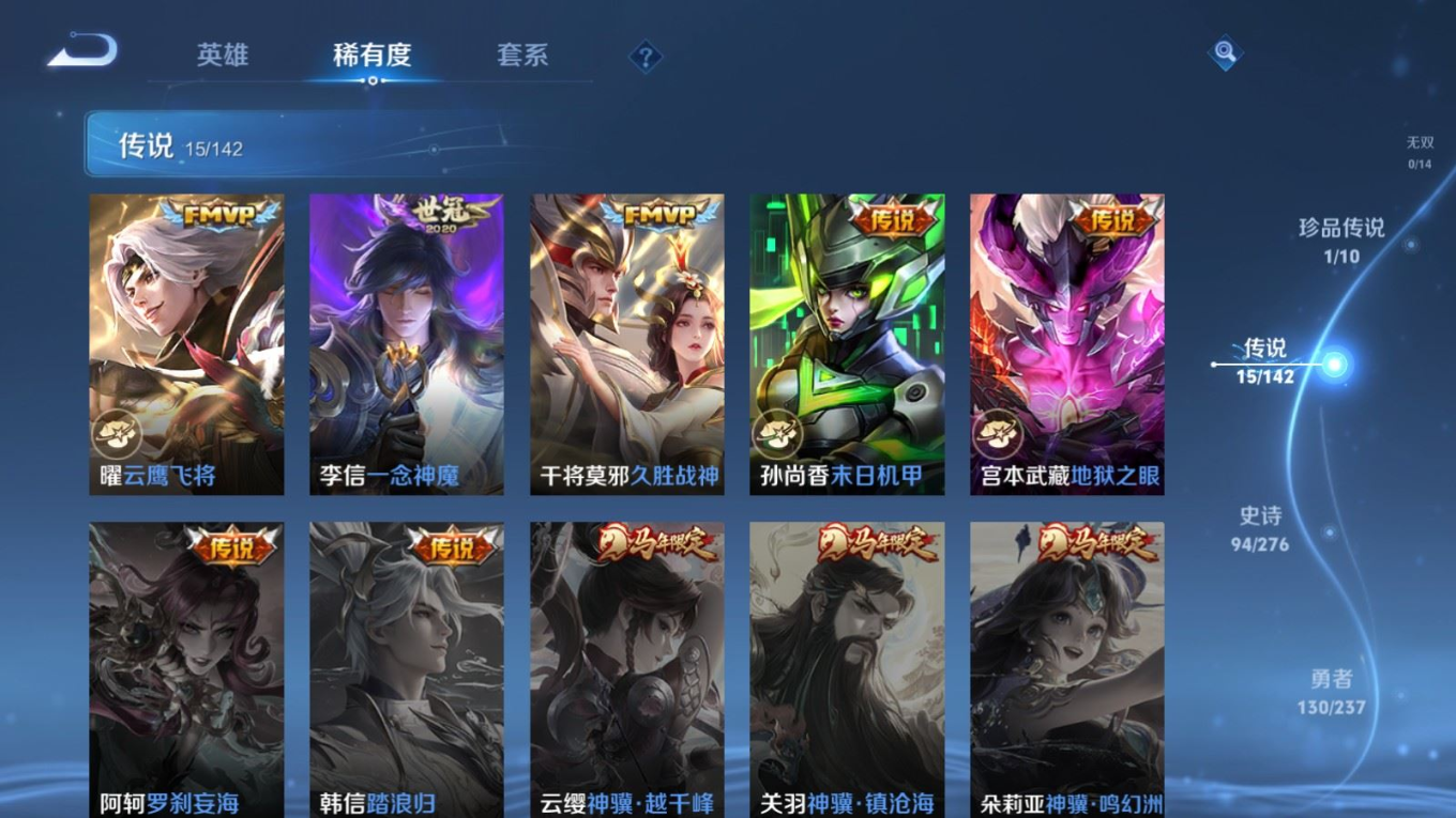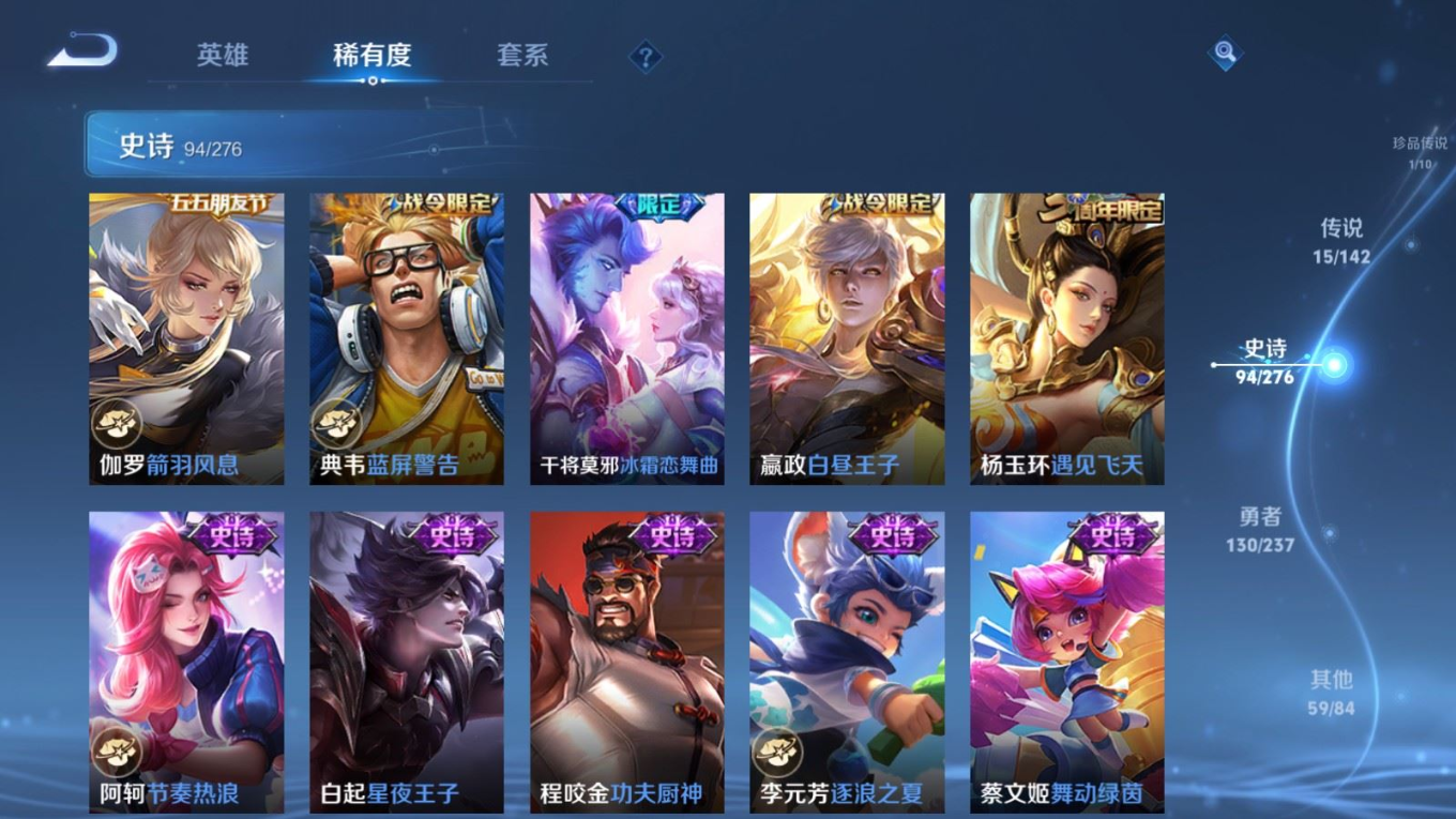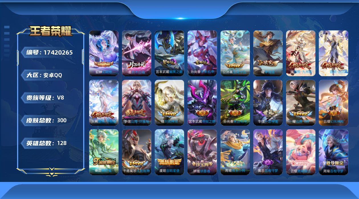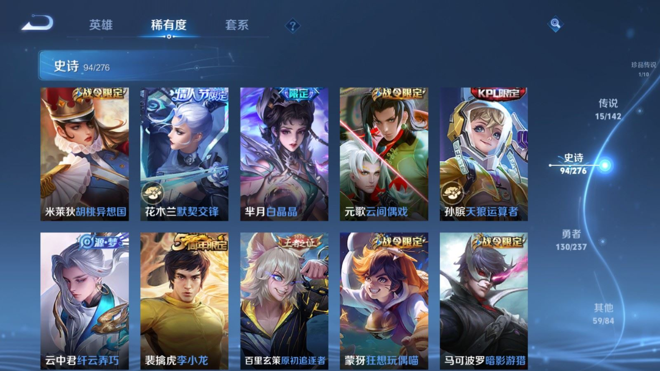 贵族等级:v8皮肤数:300情人节限定3 传说品质15 生肖限定6 珍品传说1 荣耀典藏1 英雄数:128