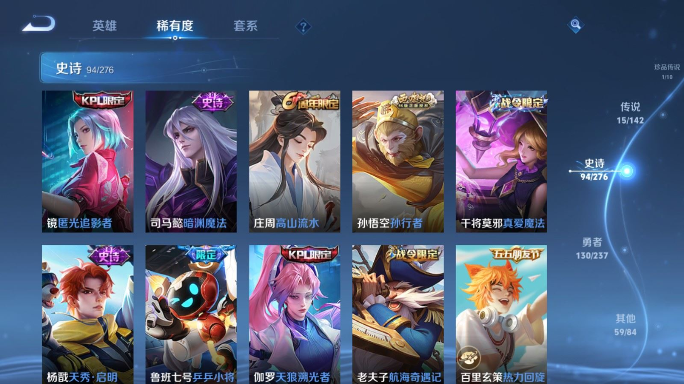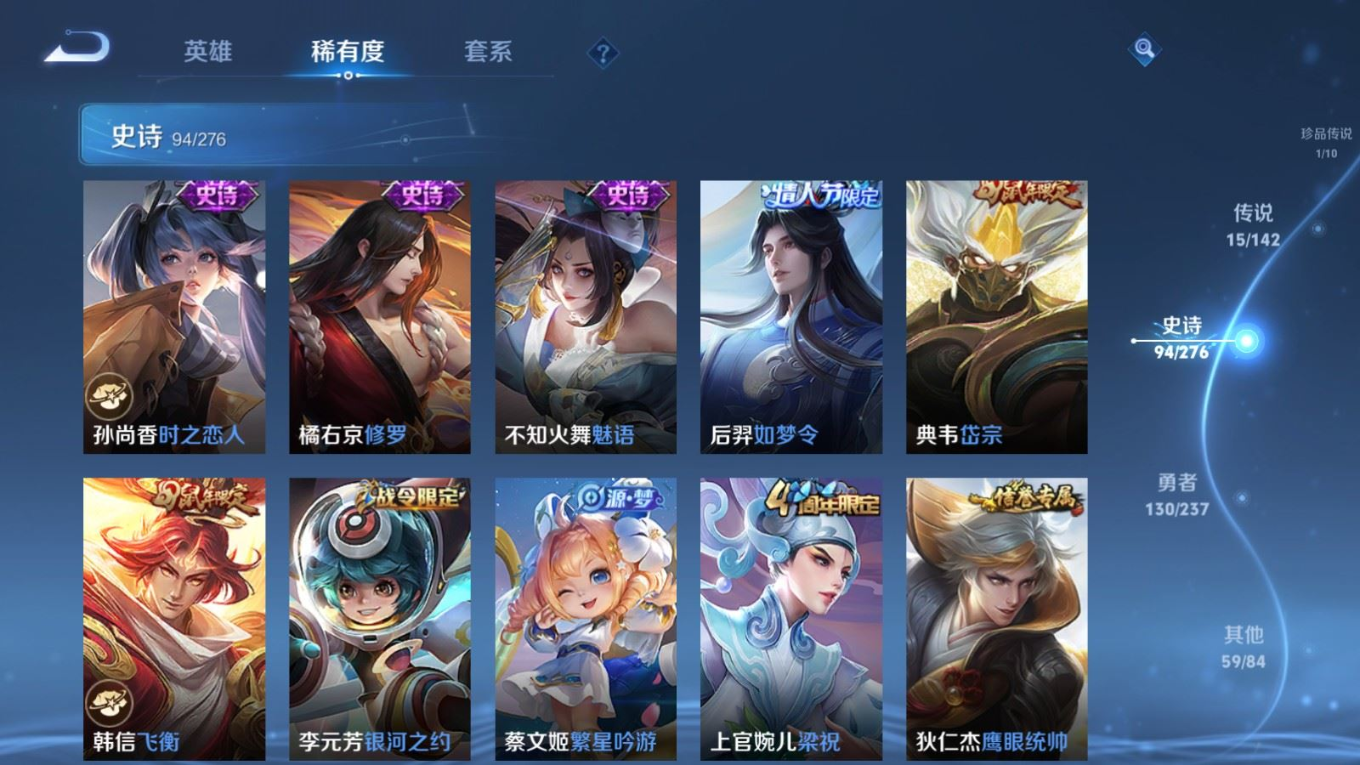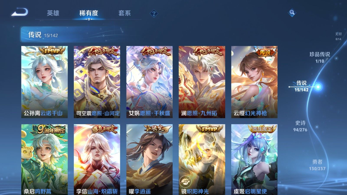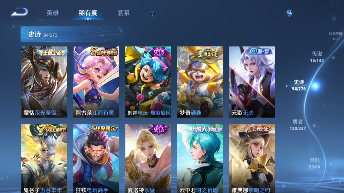 贵族等级:v8皮肤数:300情人节限定3 传说品质15 生肖限定6 珍品传说1 荣耀典藏1 英雄数:128