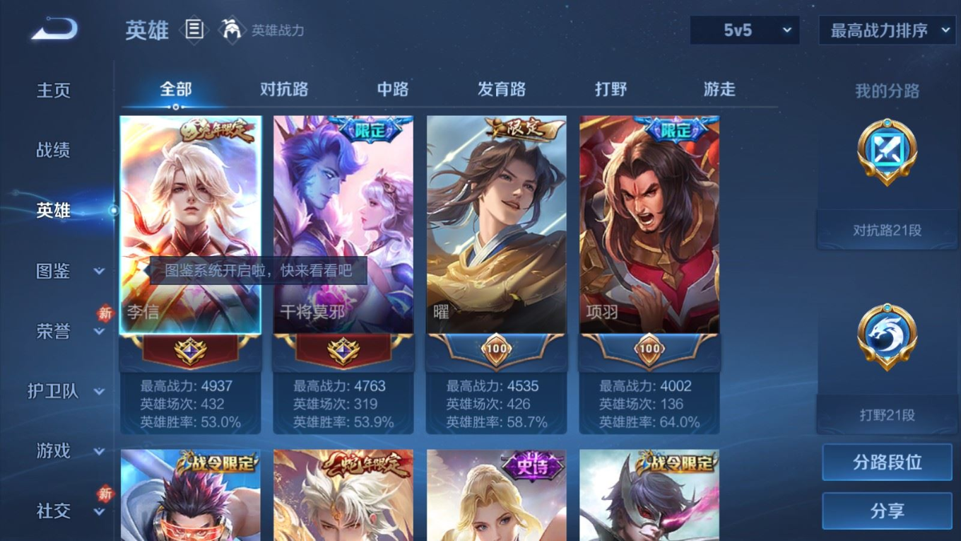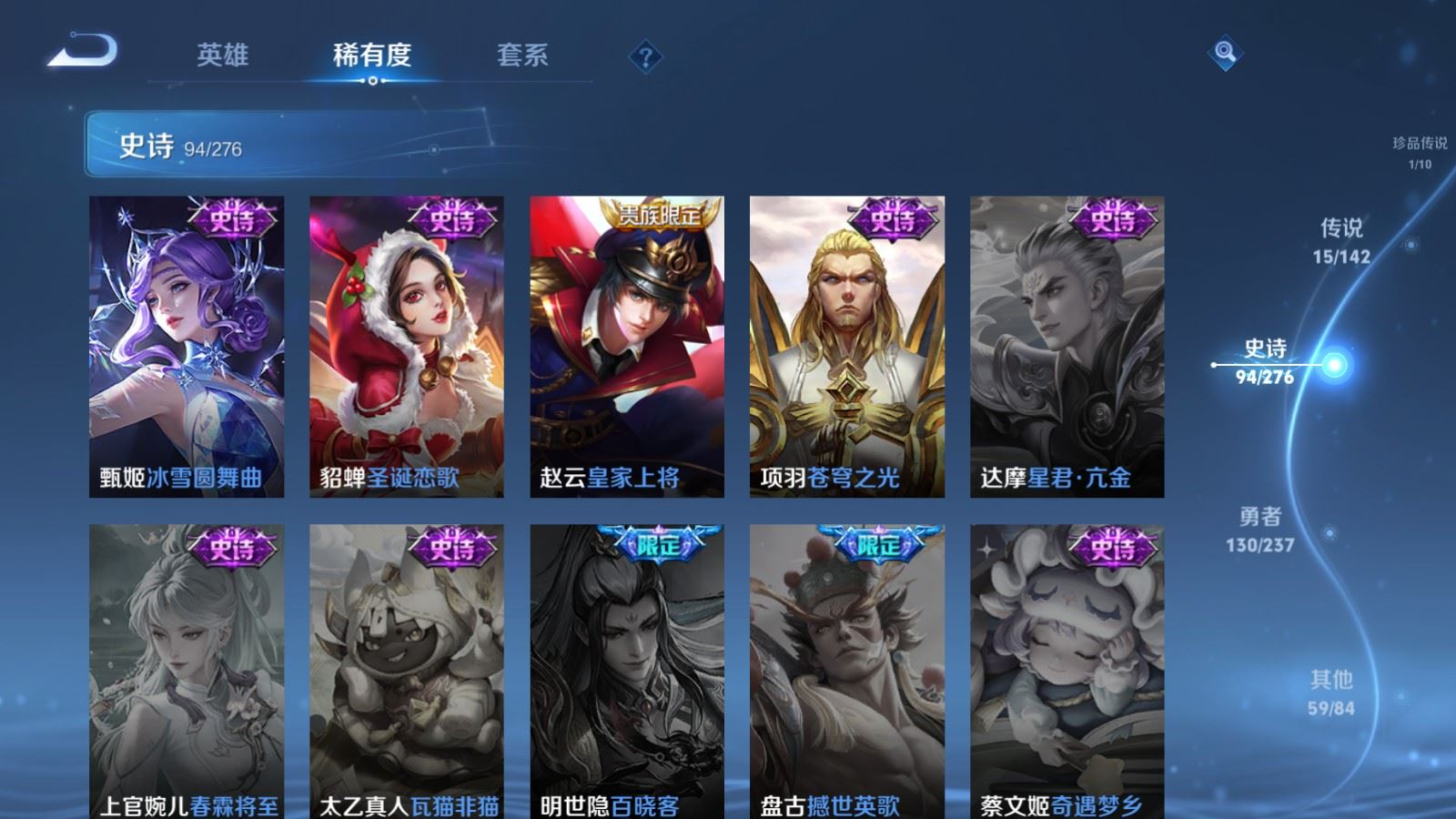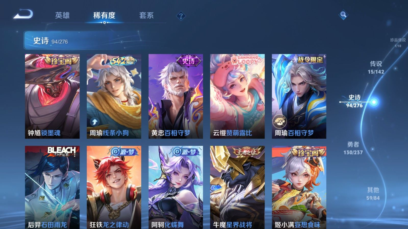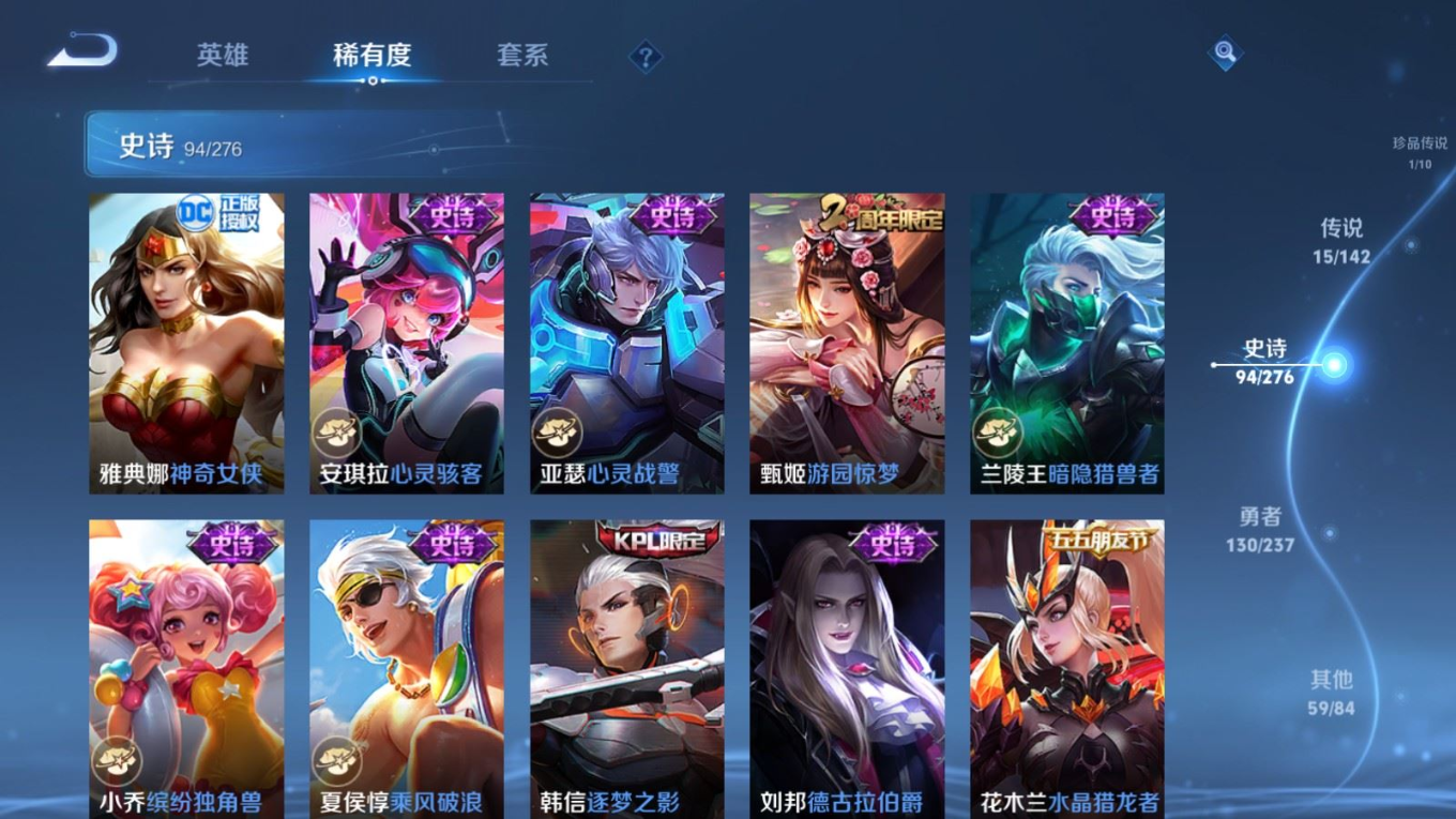 贵族等级:v8皮肤数:300情人节限定3 传说品质15 生肖限定6 珍品传说1 荣耀典藏1 英雄数:128