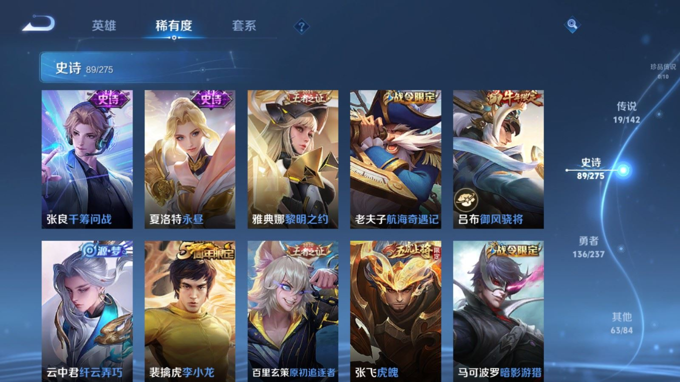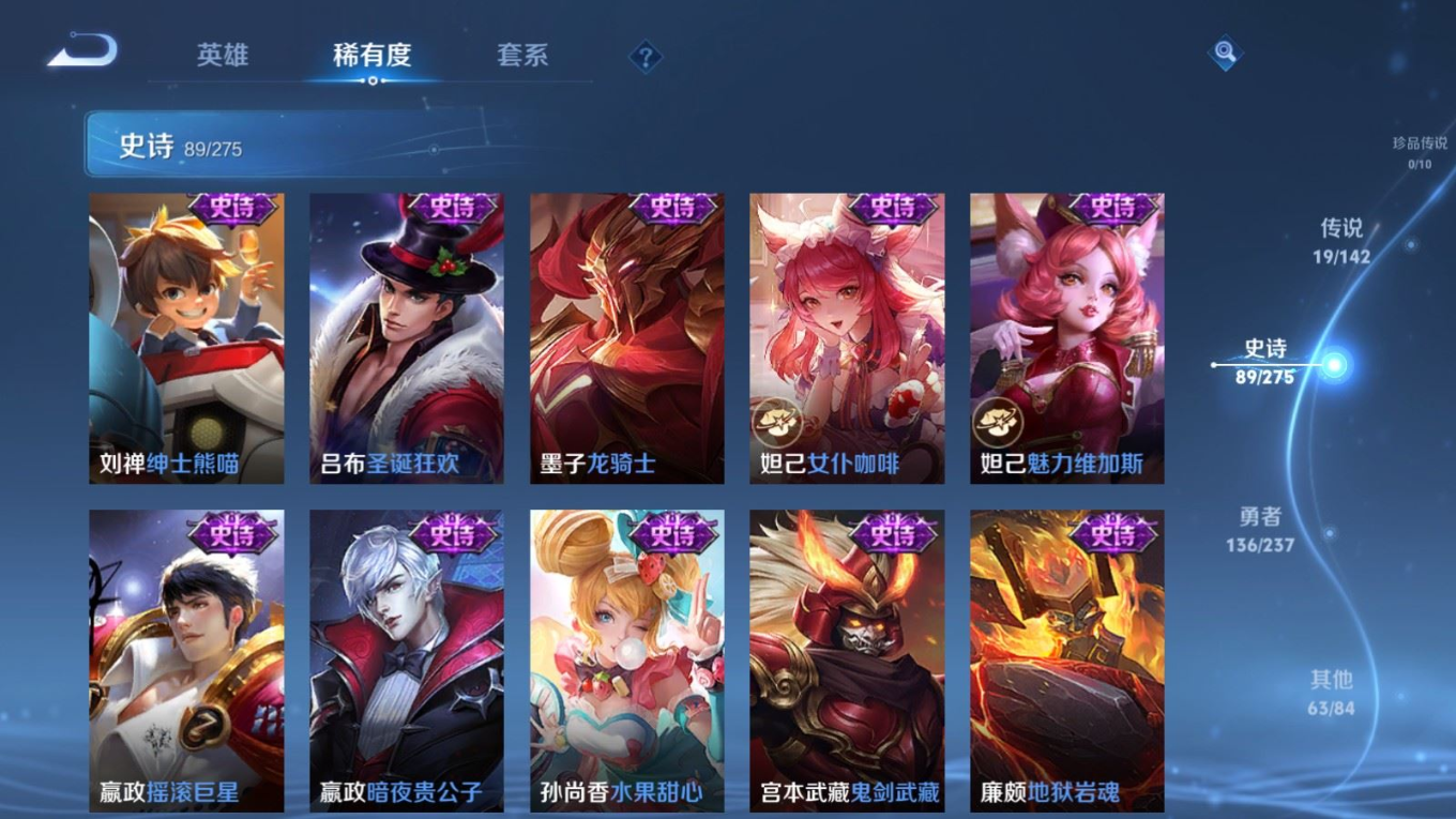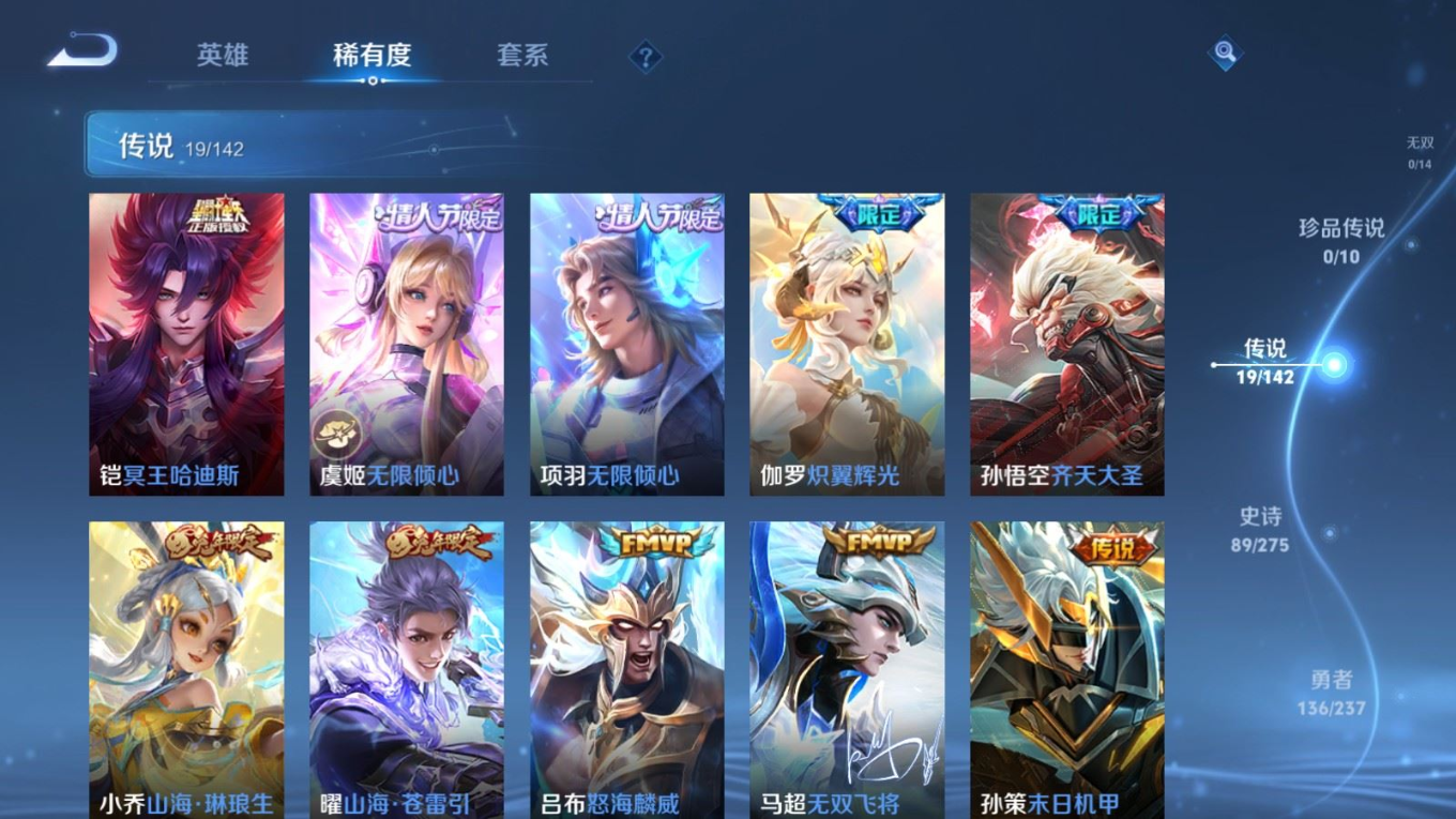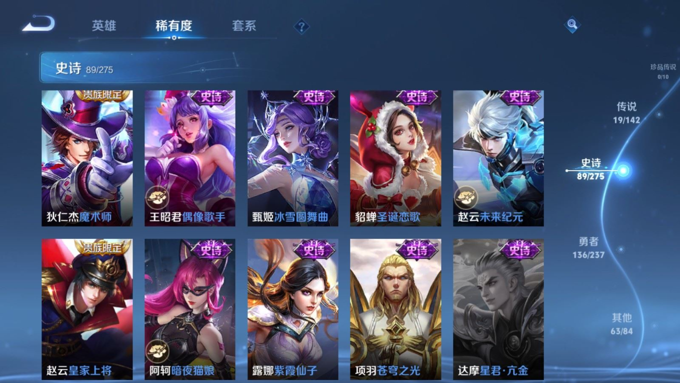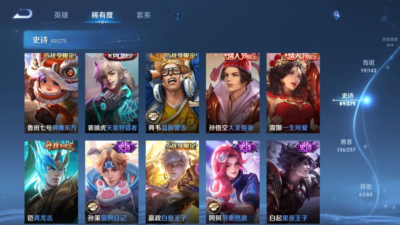 贵族等级:v8皮肤数:308传说品质19 情人节限定5 生肖限定6 荣耀典藏1 英雄数:128