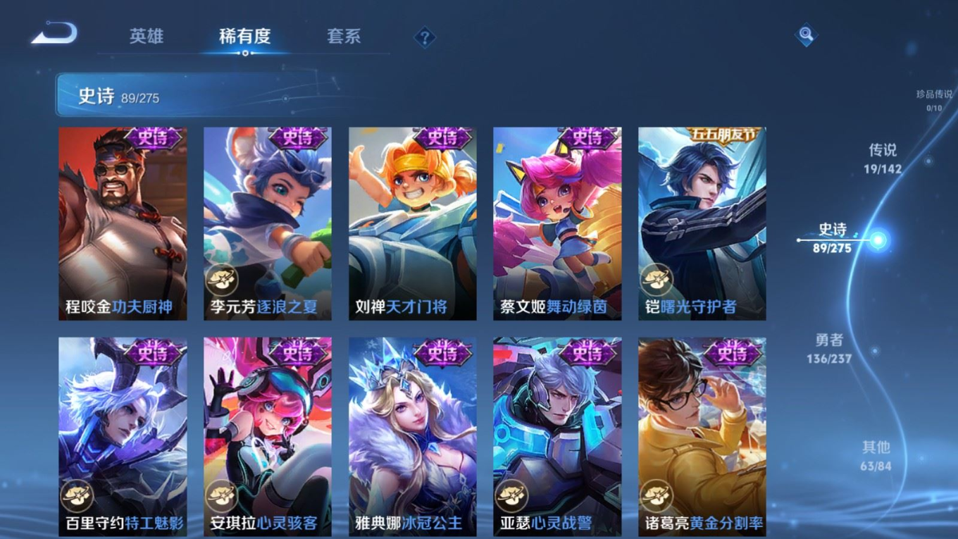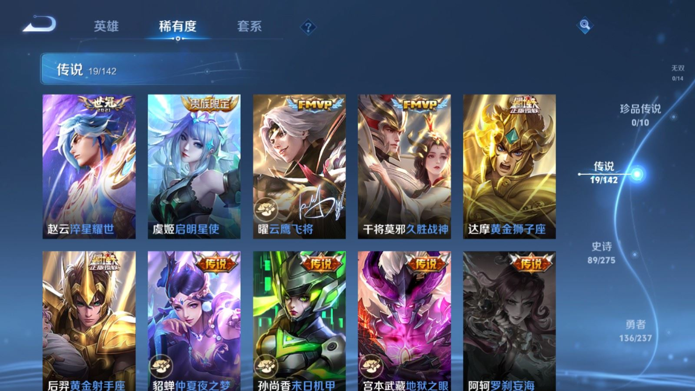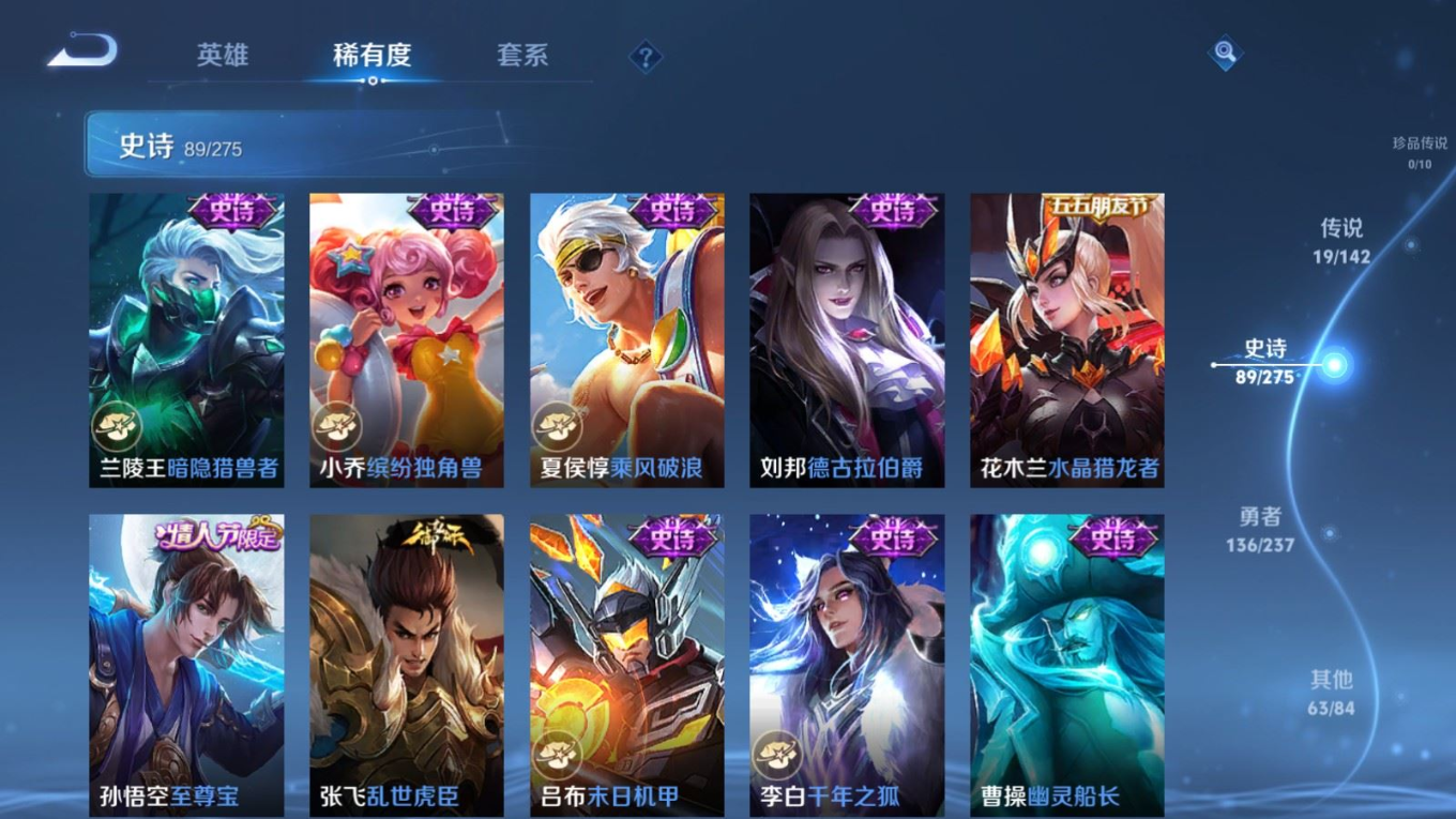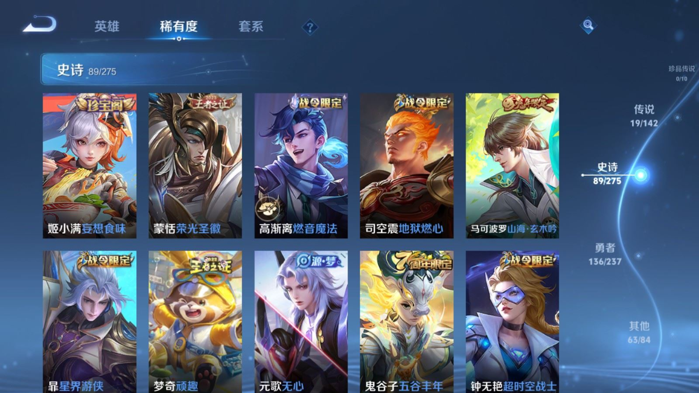 贵族等级:v8皮肤数:308传说品质19 情人节限定5 生肖限定6 荣耀典藏1 英雄数:128