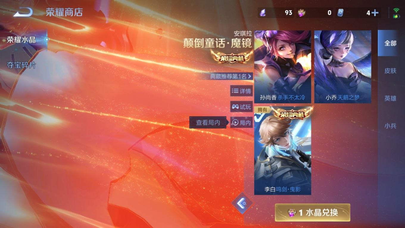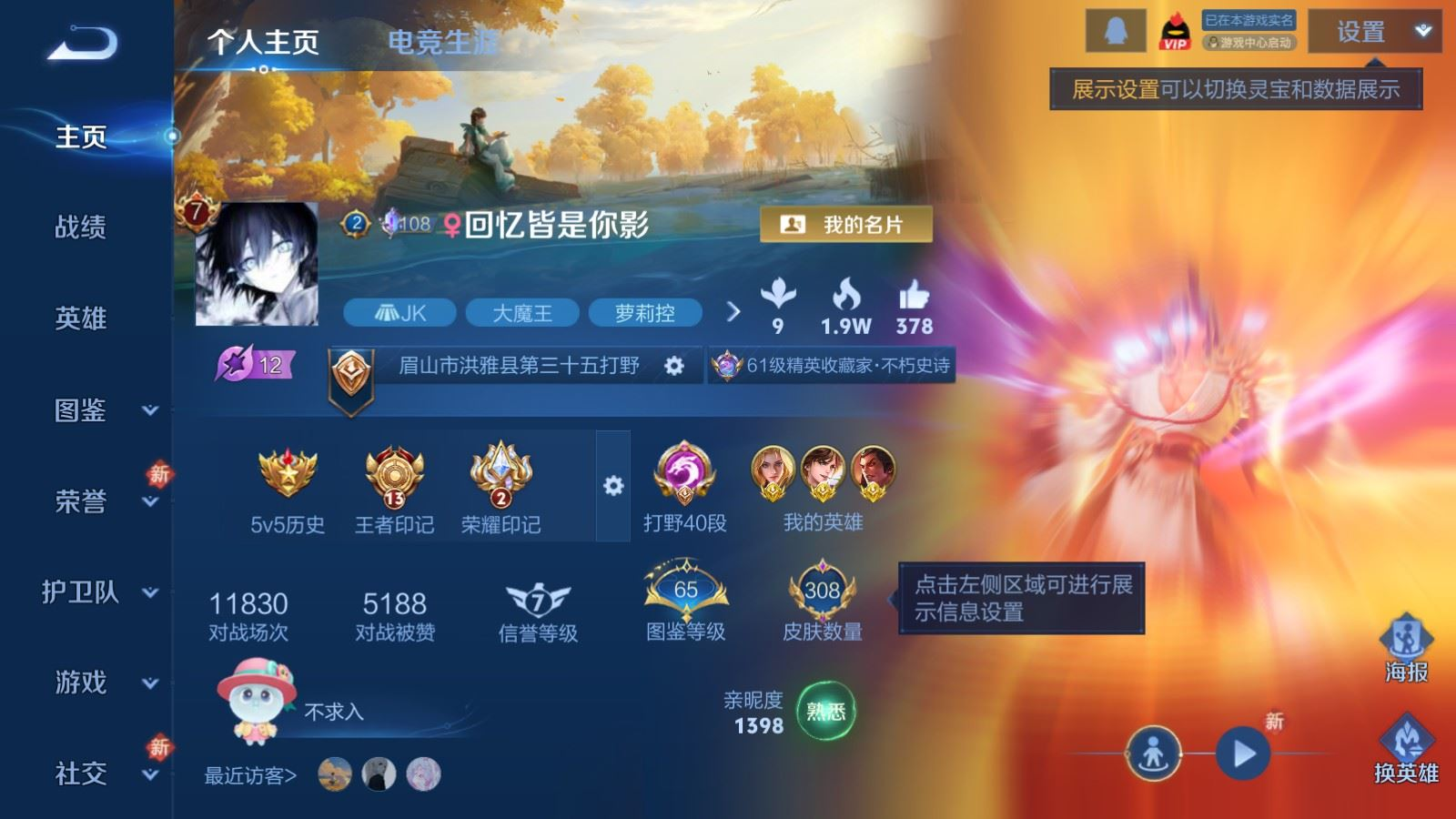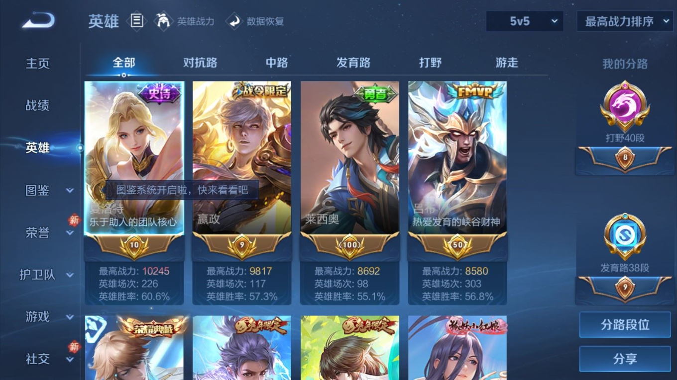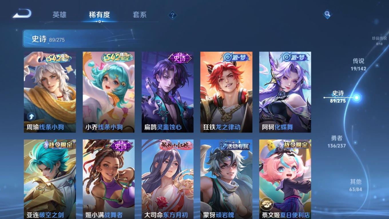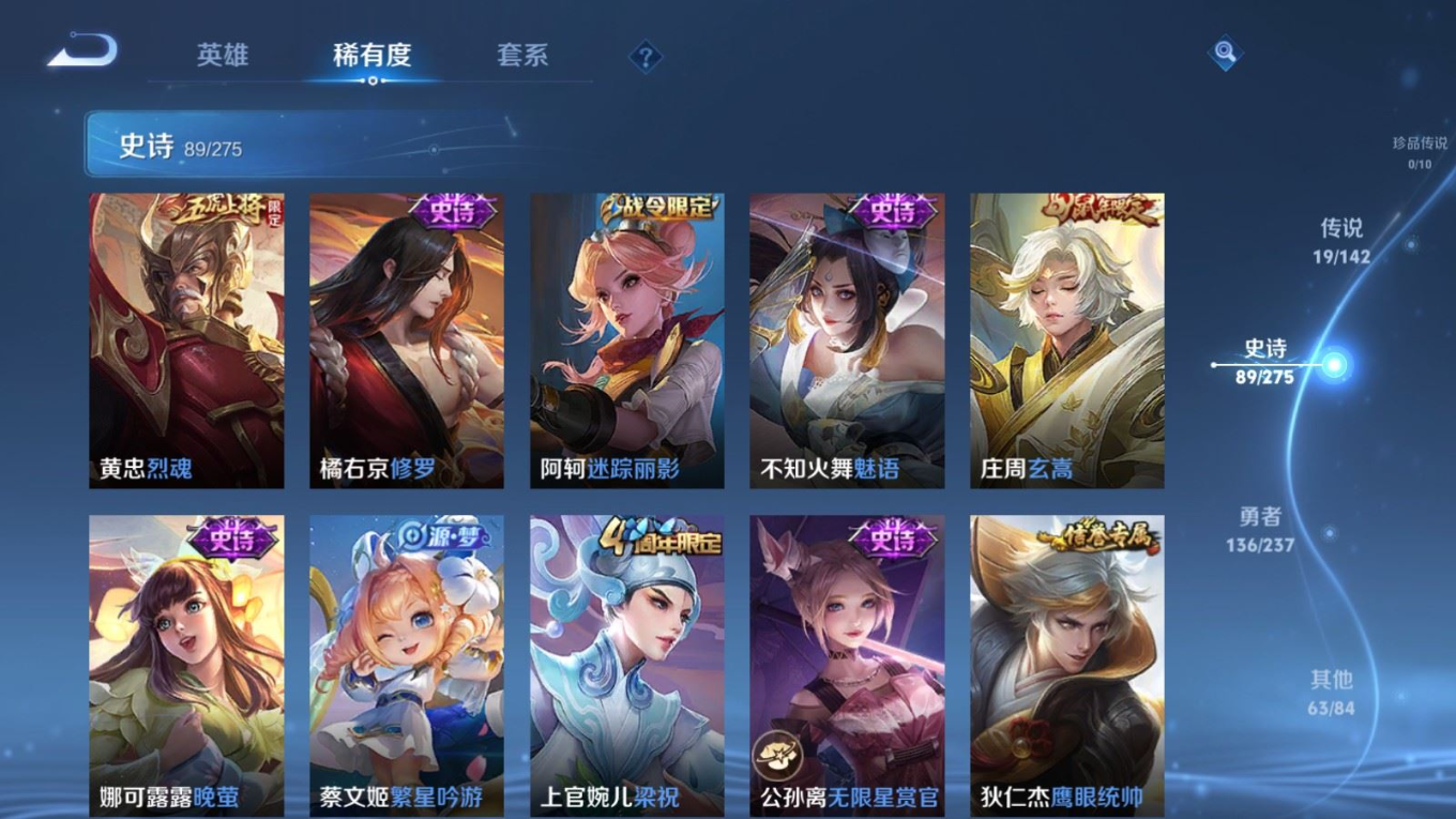 贵族等级:v8皮肤数:308传说品质19 情人节限定5 生肖限定6 荣耀典藏1 英雄数:128