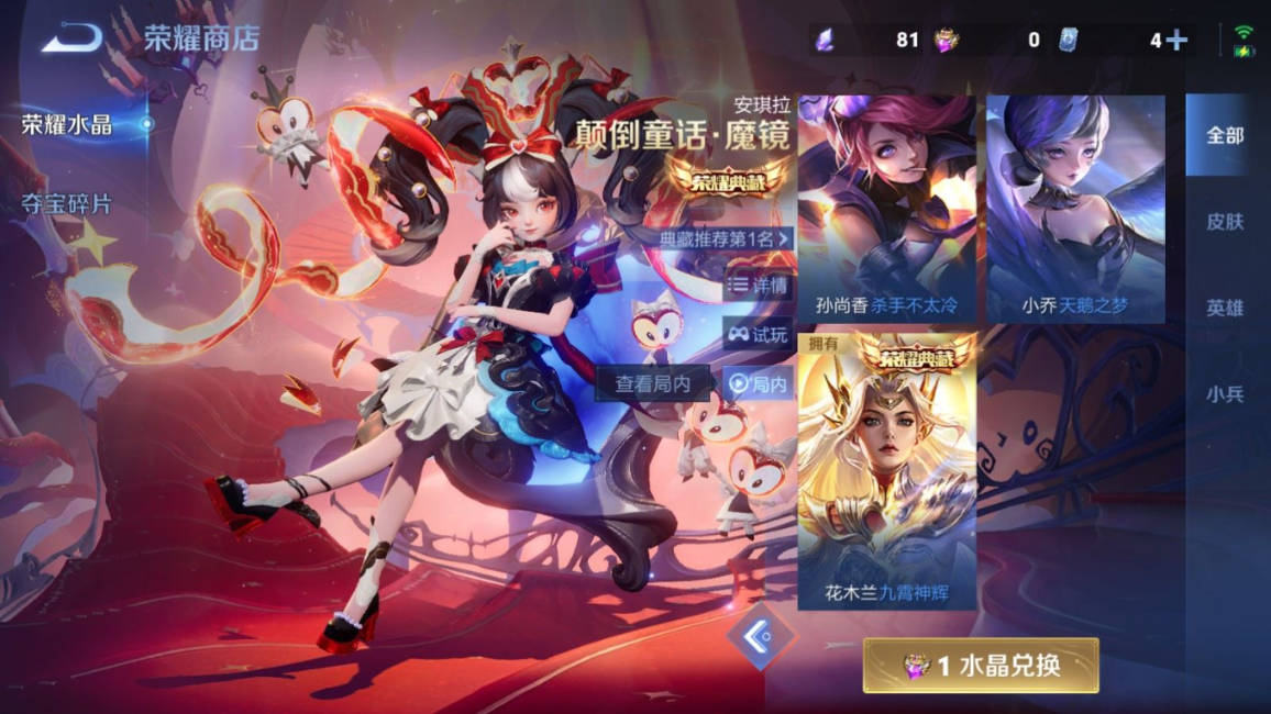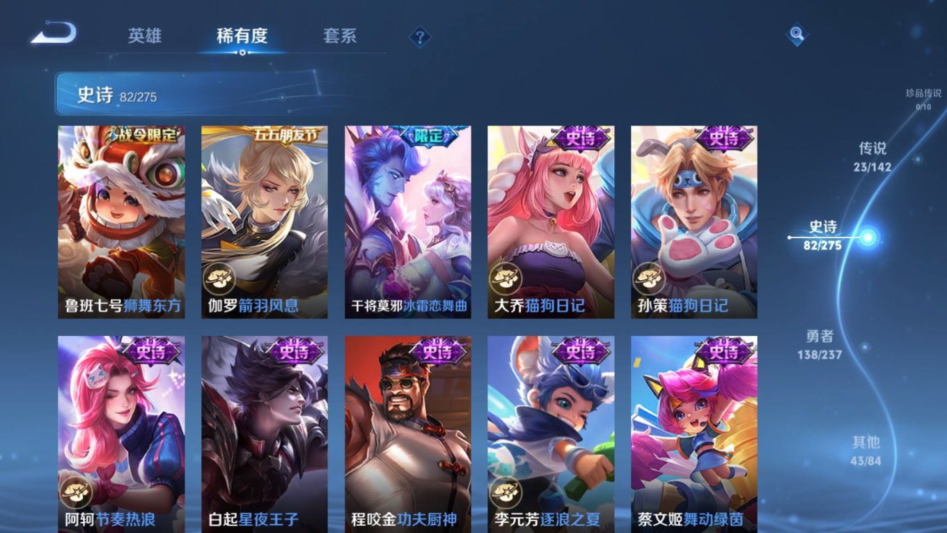 贵族等级:v8皮肤数:287传说品质23 生肖限定4 荣耀典藏1 情人节限定1 英雄数:127
