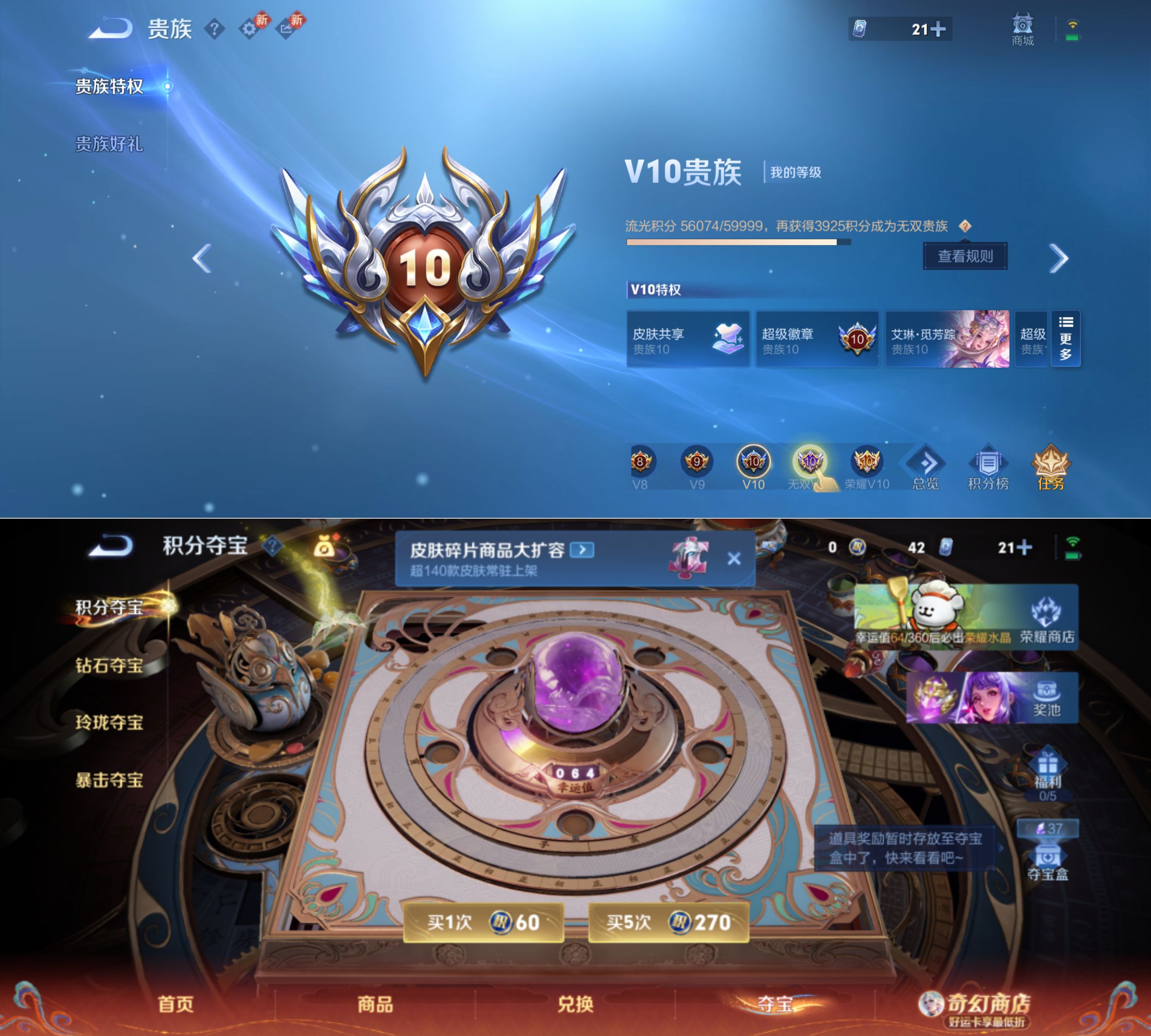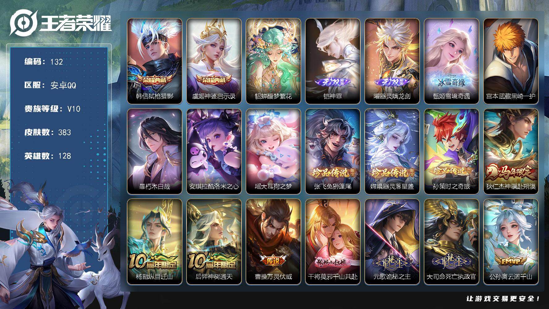 贵族等级:v10皮肤数:383传说品质41 情人节限定5 生肖限定14 珍品传说7 珍品无双1 无双3 荣耀典藏2 英雄数:128