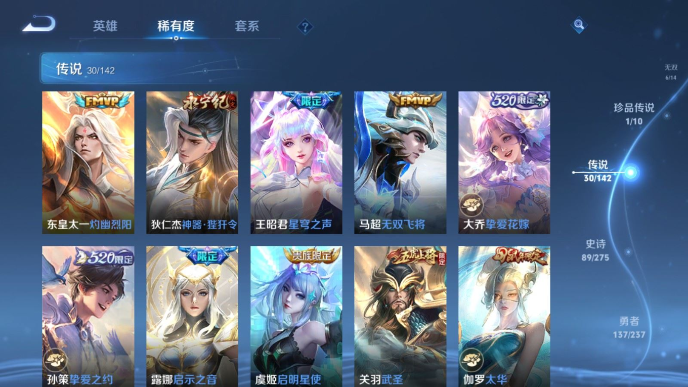 传说品质_后羿_黄金射手座传说品质_关羽_武圣传说品质_孙悟空_地狱火传说品质_吕布_天魔缭乱传说品质_马超_琥珀纪元传说品质_马超_无双飞将传说品质_大乔_挚爱花嫁传说品质_海月_金乌负日传说品质_干将莫邪_久胜战神传说品质_宫本武藏_地狱之眼传说品质_貂蝉_神骥·聚万邦传说品质_貂蝉_猫影幻舞传说品质_孙尚香_末日机甲传说品质_孙尚香_乘龙·问璇玑传说品质_梦奇_胖达荣荣传说品质_桑启_鸣野蒿传说品质_露娜_启示之音传说品质_东皇太一_灼幽烈阳传说品质_王昭君_星穹之声传说品质_张良_黄金白羊座传说品质_云中君_群星魔术团传说品质_女娲_愿照·千秋盛传说品质_云缨_神骥·越千峰传说品质_伽罗_太华传说品质_孙策_挚爱之约传说品质_狄仁杰_神器·狴犴令传说品质_狄仁杰_神骥·赴朔漠传说品质_虞姬_启明星使传说品质_百里玄策_白虎志传说品质_赵云_乘龙·铭钟鼎