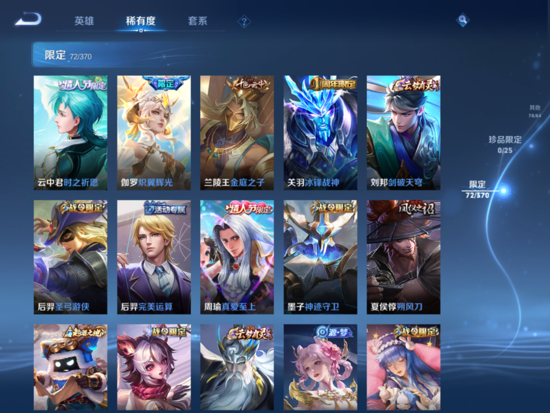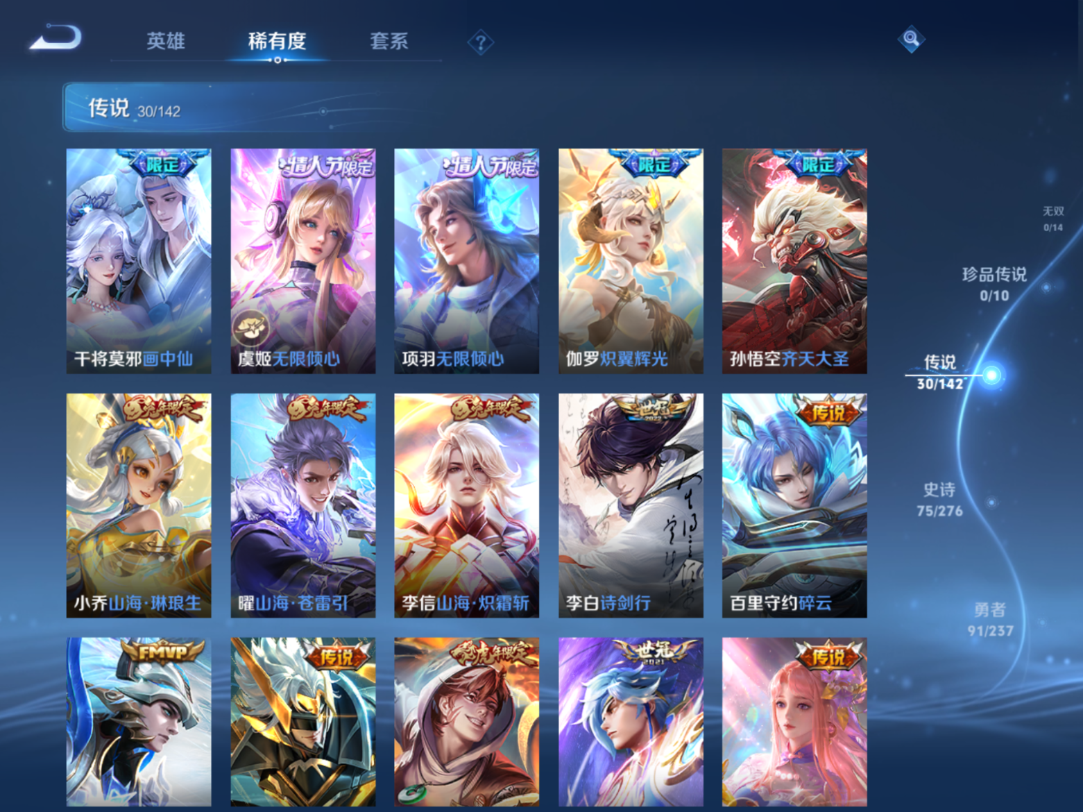 传说品质_后羿_黄金射手座传说品质_孙悟空_齐天大圣传说品质_马超_无双飞将传说品质_干将莫邪_画中仙传说品质_干将莫邪_久胜战神传说品质_宫本武藏_地狱之眼传说品质_周瑜_音你心动传说品质_花木兰_冠军飞将传说品质_镜_炽阳神光传说品质_貂蝉_猫影幻舞传说品质_李信_一念神魔传说品质_李信_山海·炽霜斩传说品质_孙尚香_末日机甲传说品质_小乔_山海·琳琅生传说品质_梦奇_胖达荣荣传说品质_刘备_时之恋人传说品质_项羽_无限倾心传说品质_李白_诗剑行传说品质_百里守约_碎云传说品质_伽罗_炽翼辉光传说品质_曜_云鹰飞将传说品质_曜_山海·苍雷引传说品质_孙策_末日机甲传说品质_狄仁杰_超时空战士传说品质_达摩_黄金狮子座传说品质_虞姬_无限倾心传说品质_虞姬_启明星使传说品质_赵云_淬星耀世传说品质_裴擒虎_寅虎·赤拳传说品质_王昭君_乞巧织情