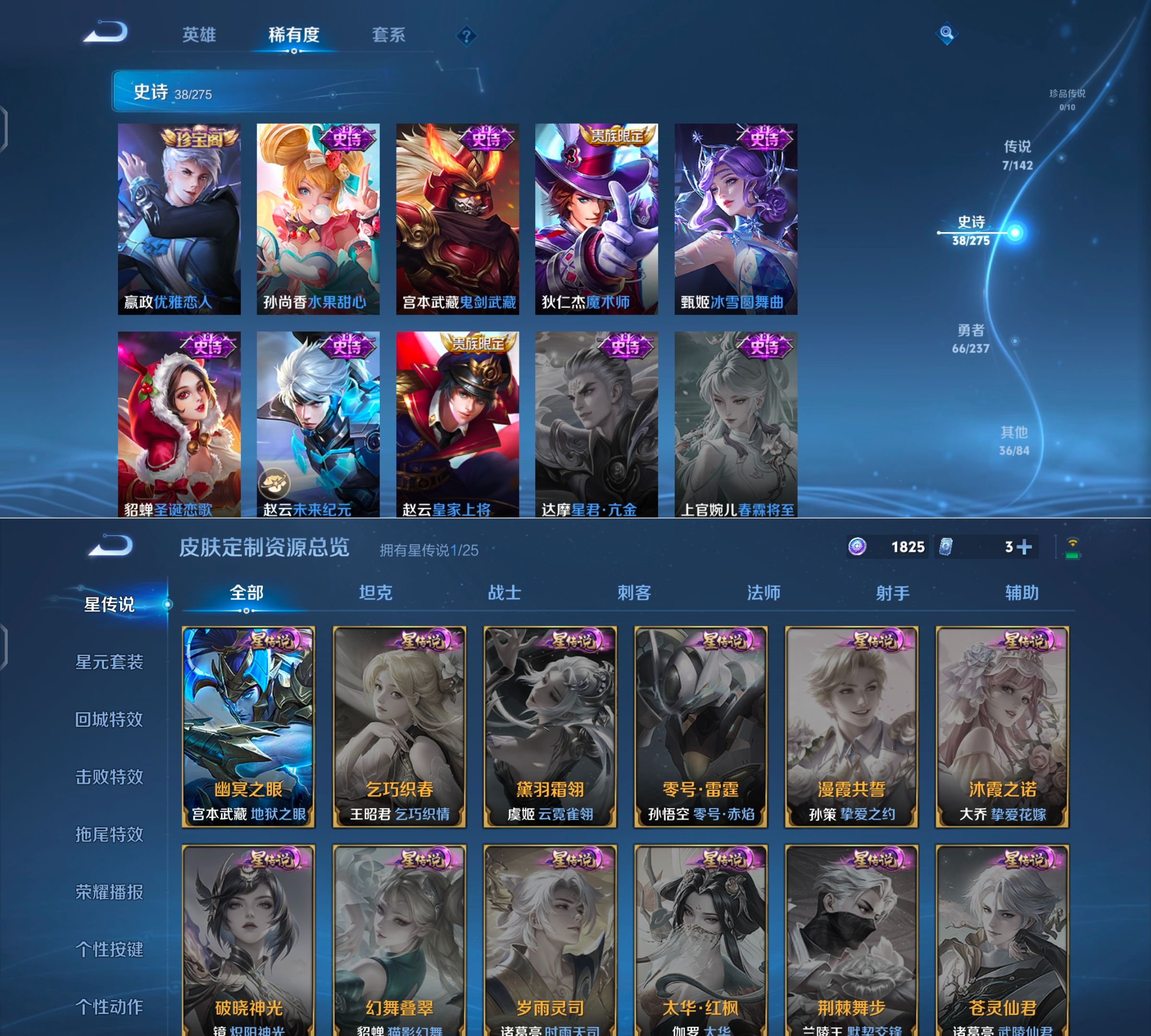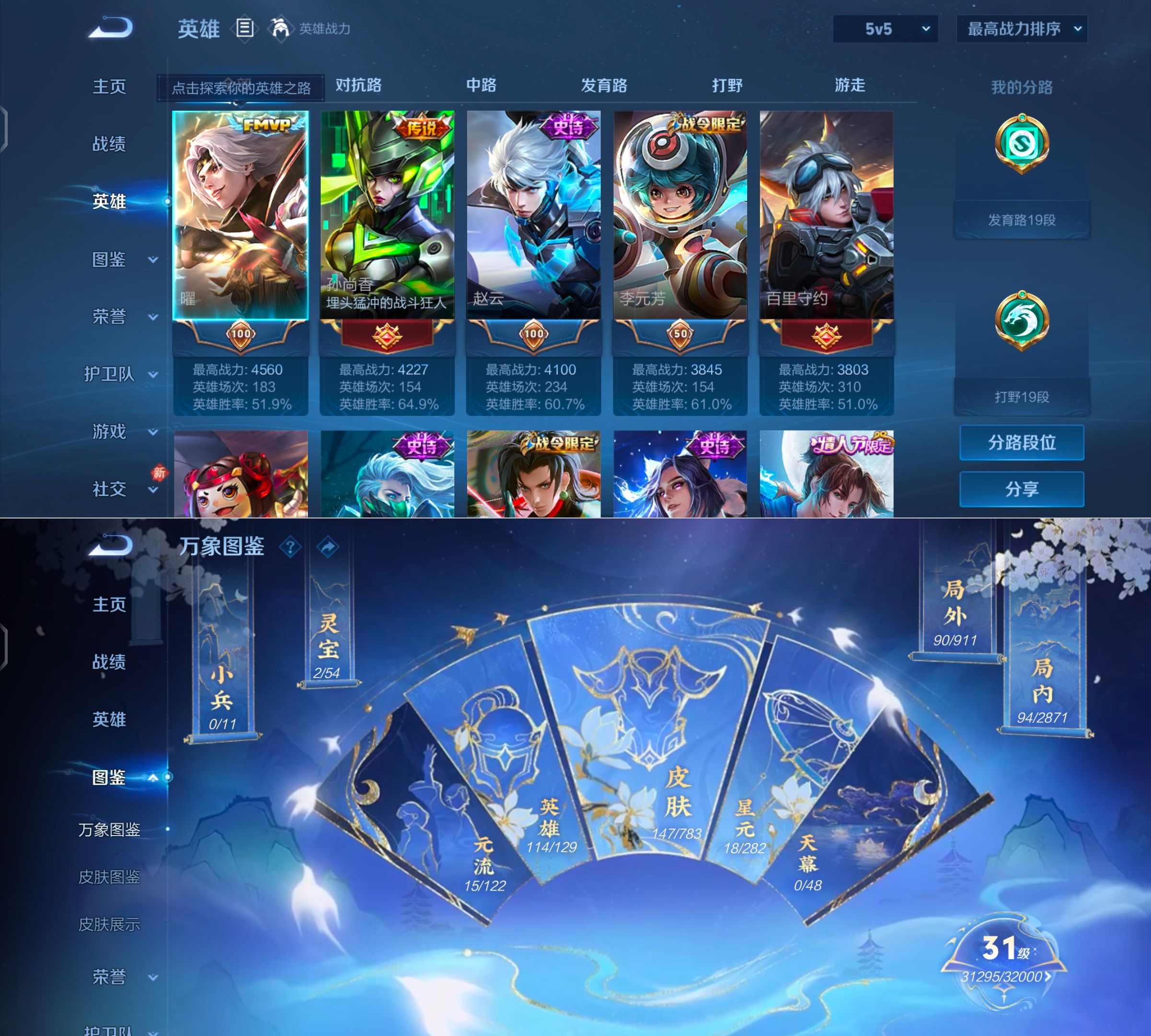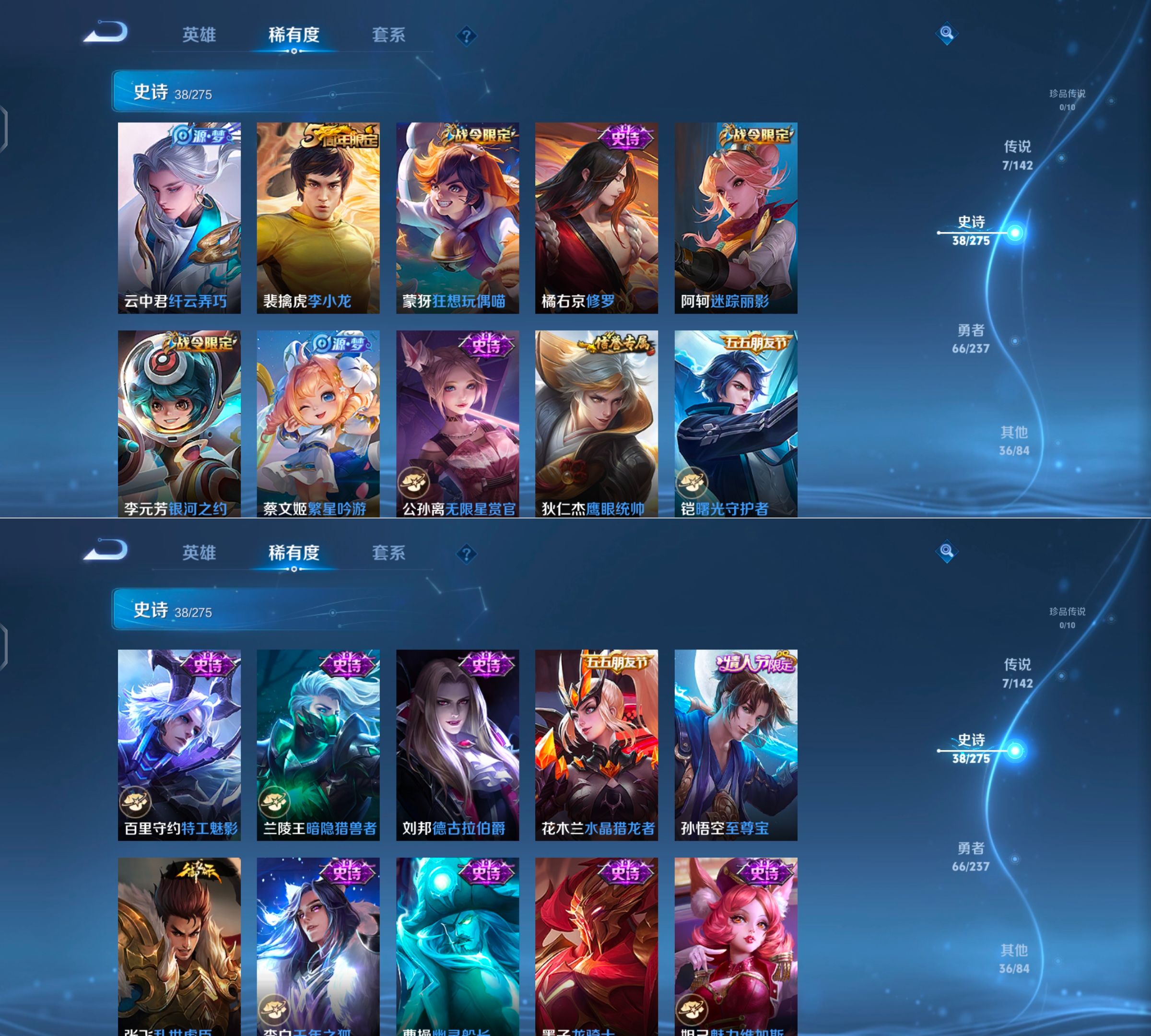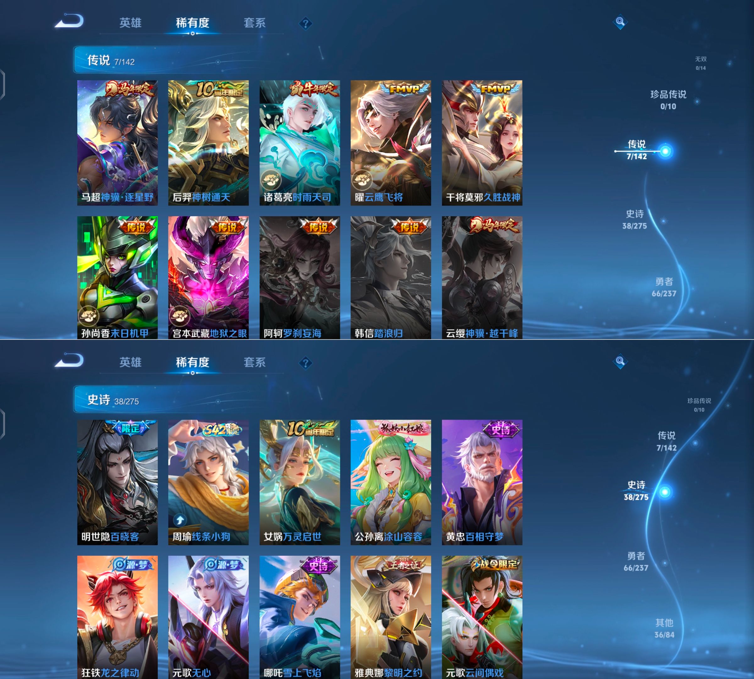 贵族等级:v7皮肤数:147传说品质7 生肖限定2 情人节限定1 英雄数:114
