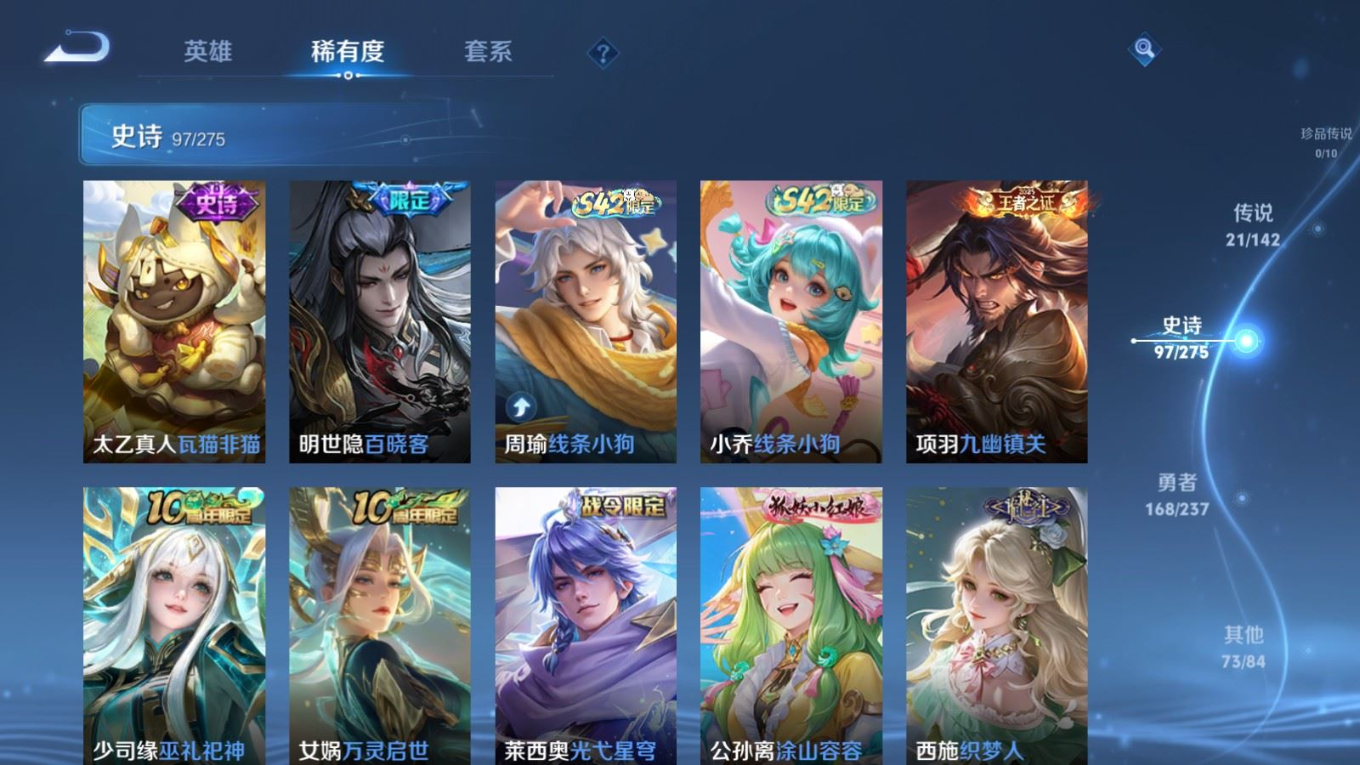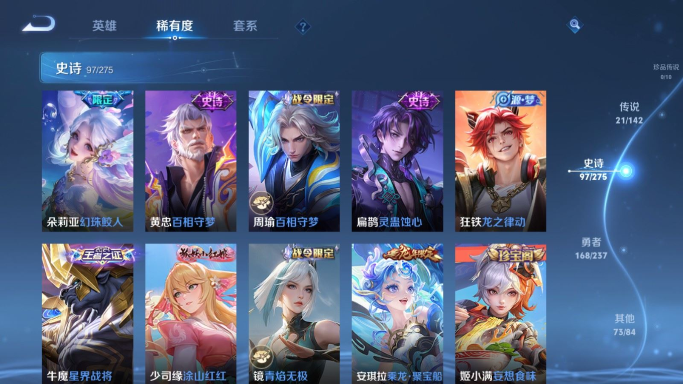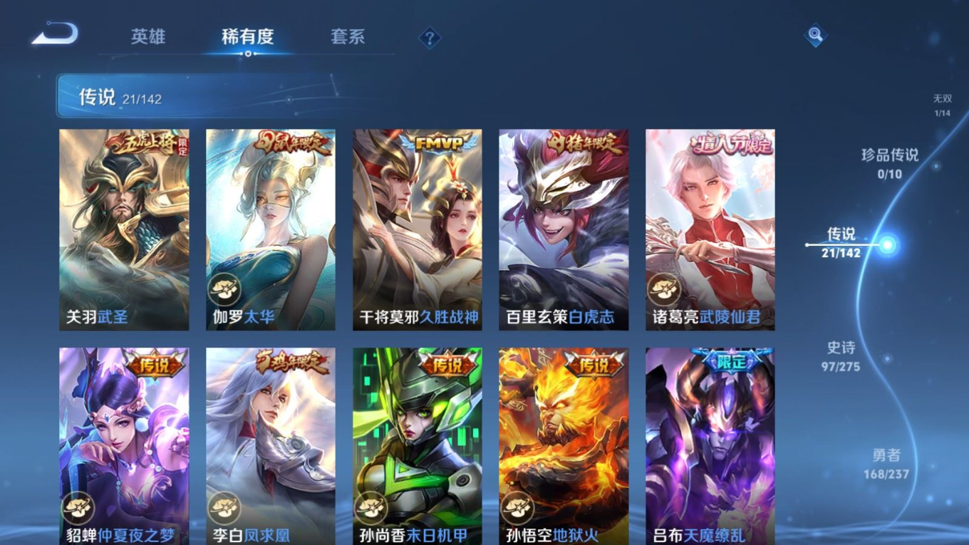 贵族等级:v9皮肤数:363生肖限定9 传说品质21 情人节限定4 荣耀典藏3 无双1 英雄数:129