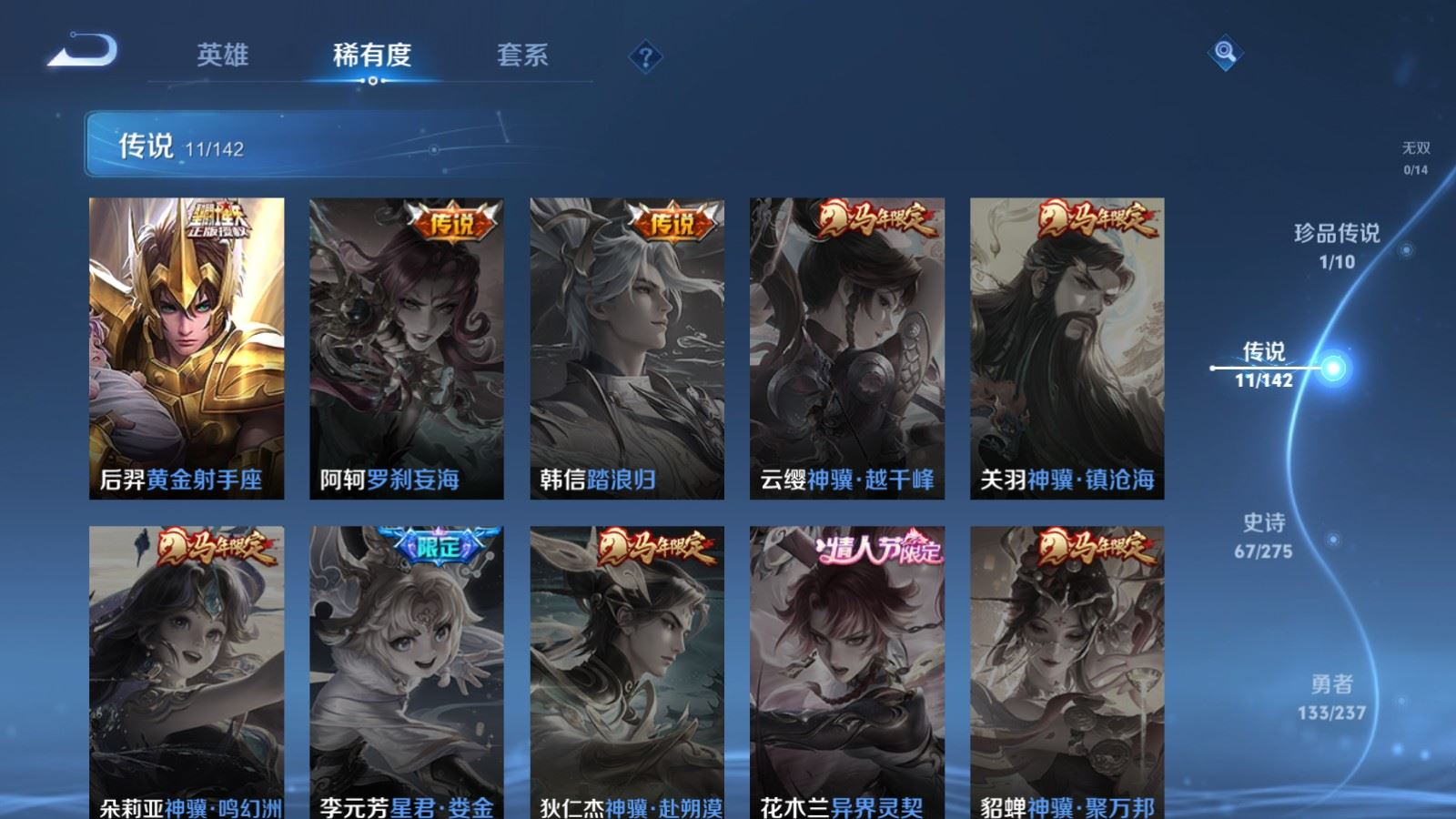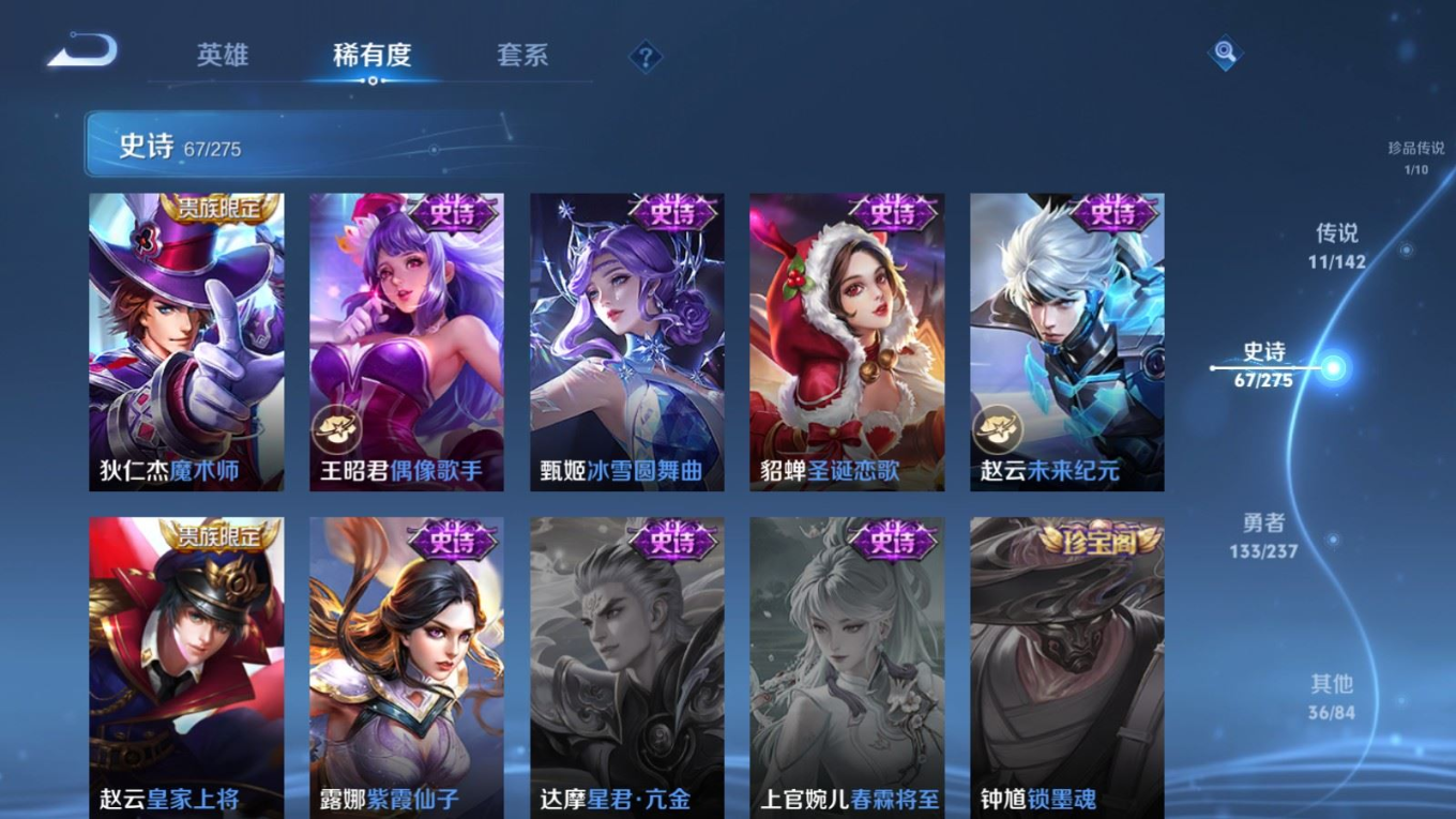 贵族等级:v7皮肤数:249传说品质11 情人节限定1 荣耀典藏1 生肖限定2 珍品传说1 英雄数:125