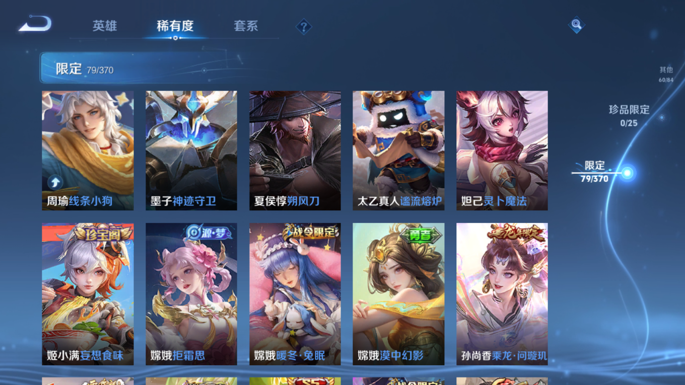 贵族等级:v8皮肤数:276传说品质21 生肖限定6 情人节限定3 荣耀典藏1 英雄数:126
