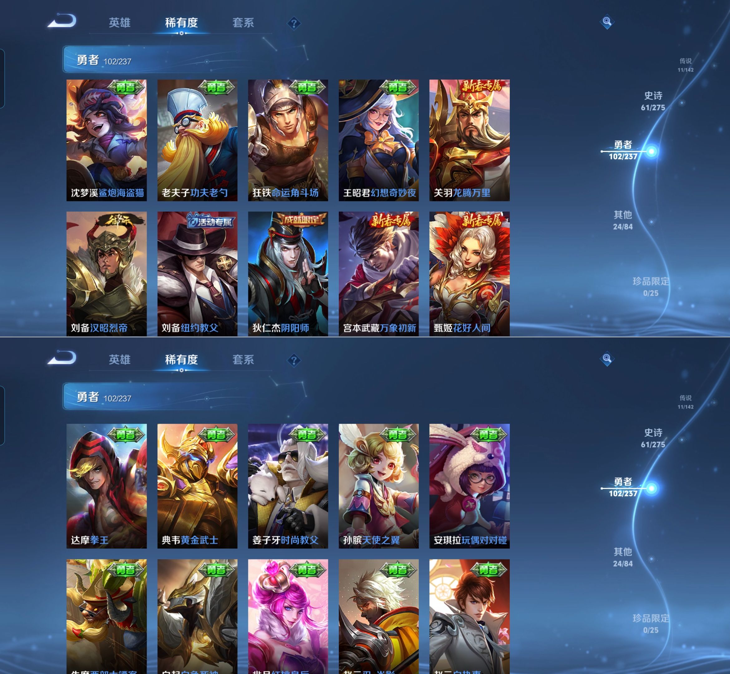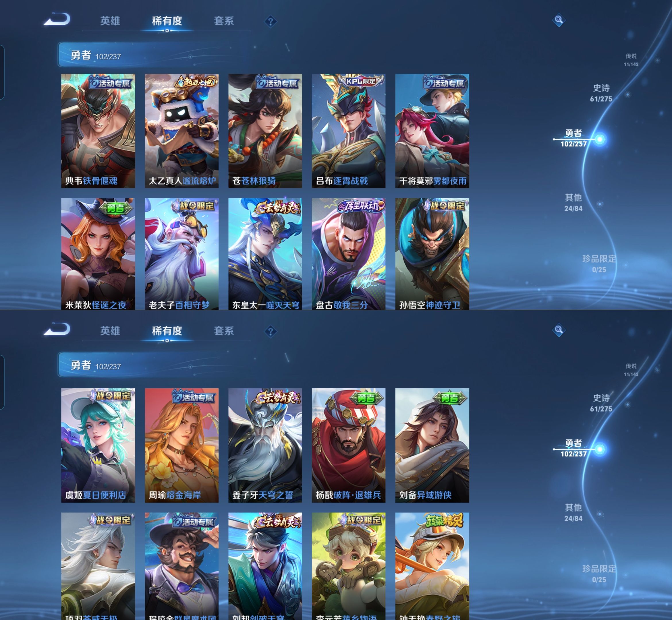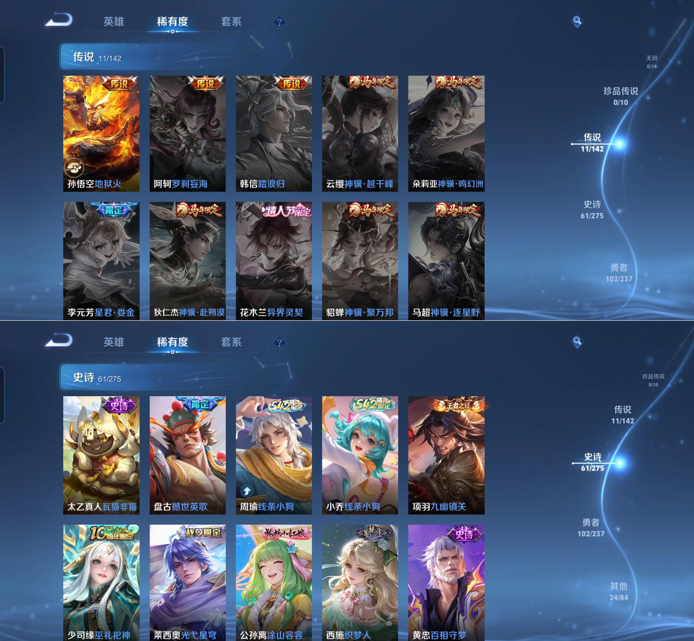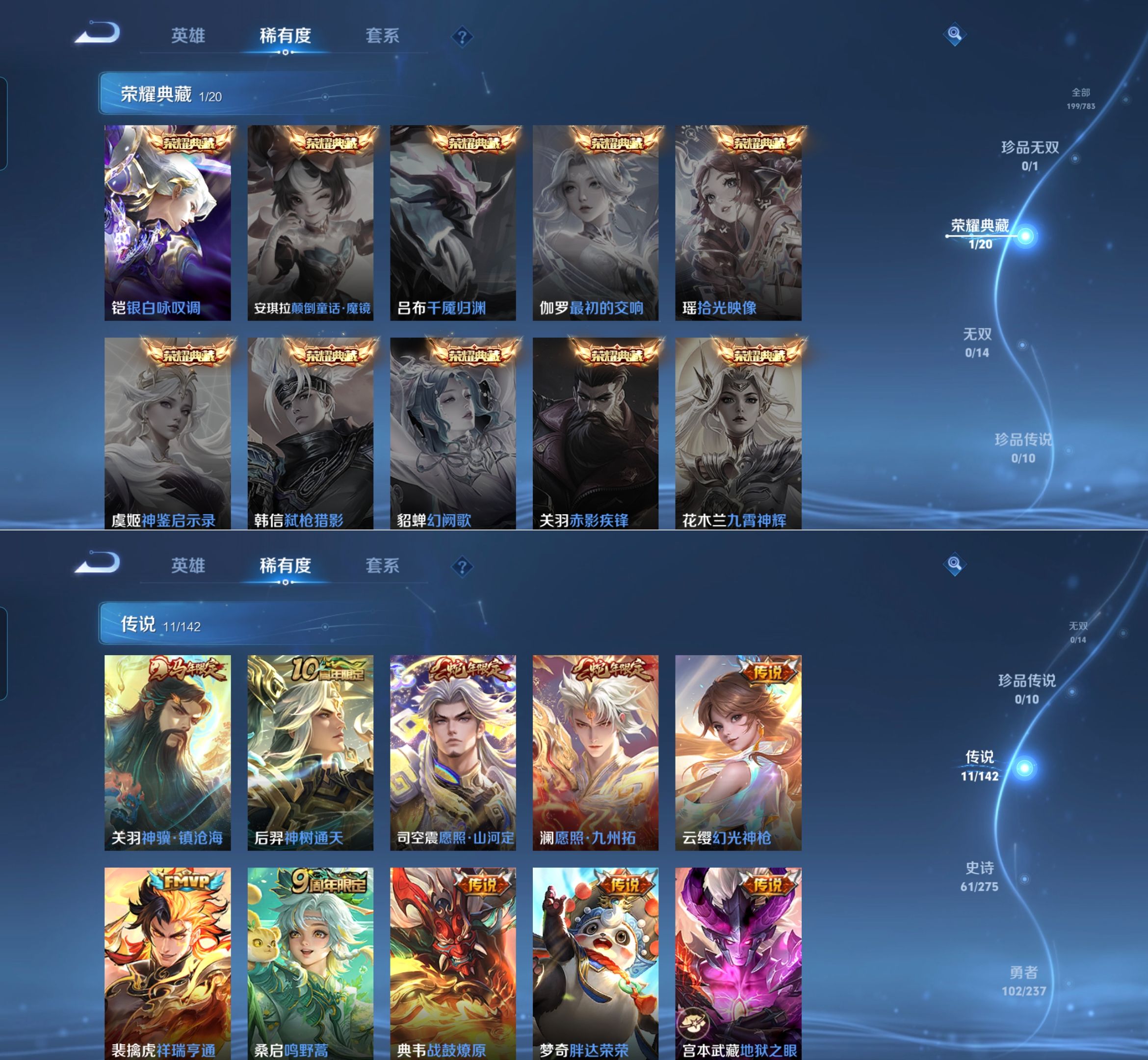贵族等级:v7皮肤数:199传说品质11 生肖限定3 荣耀典藏1 英雄数:126
