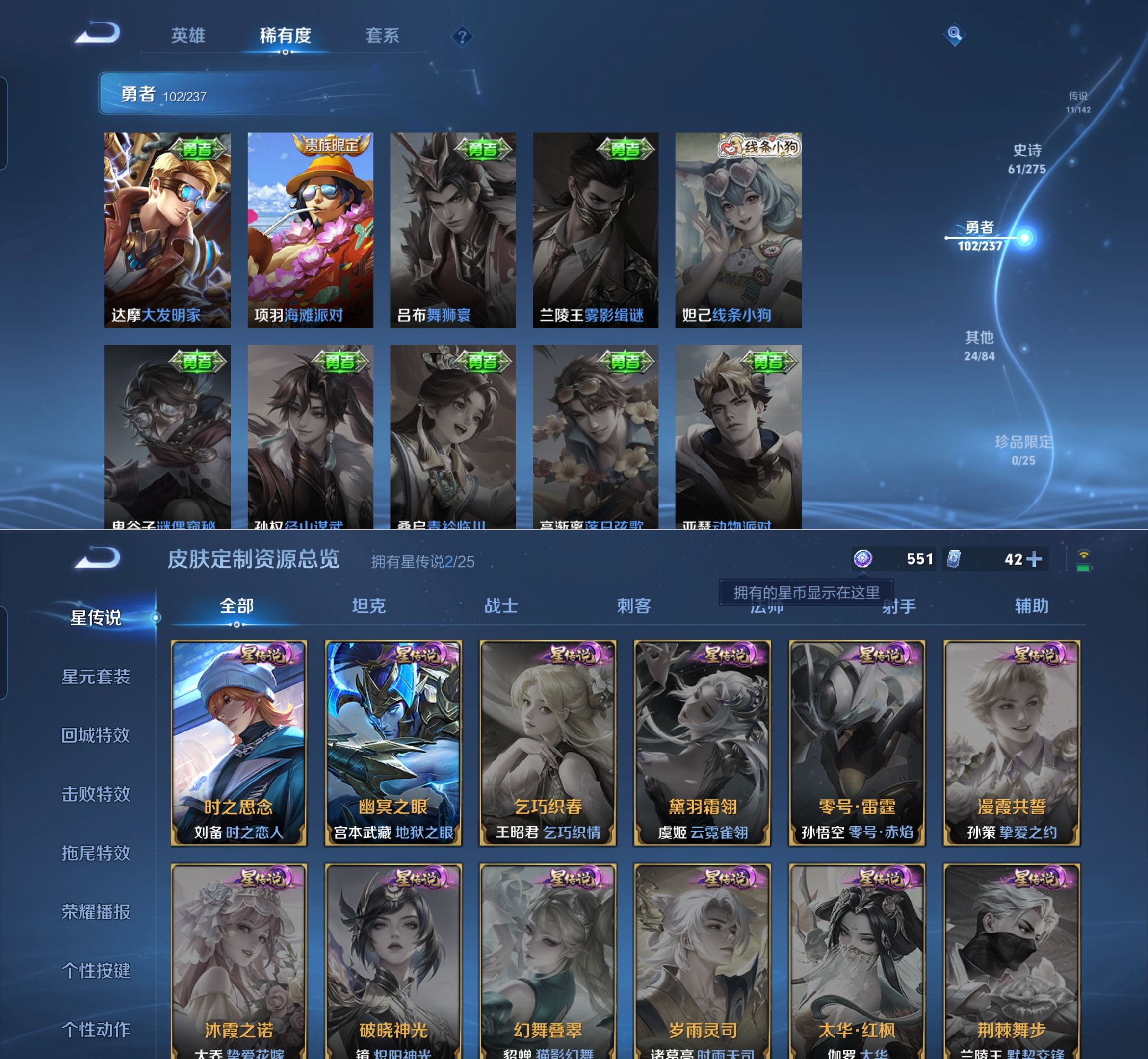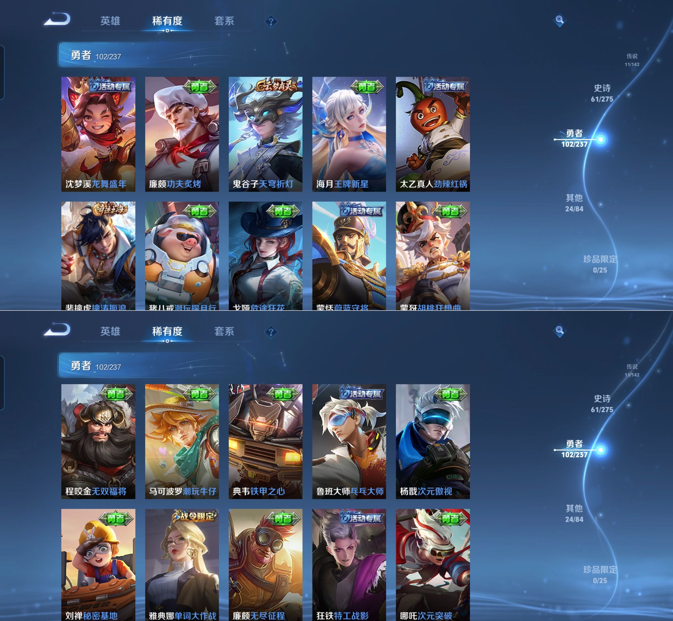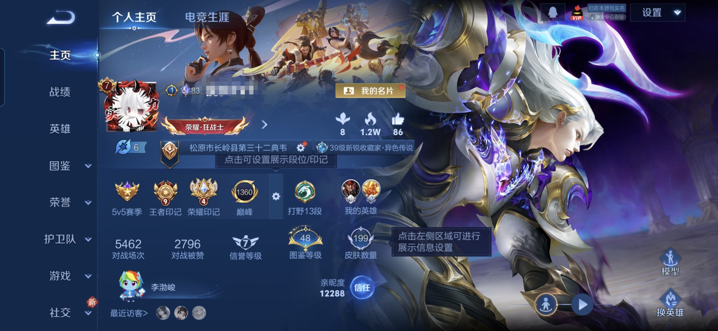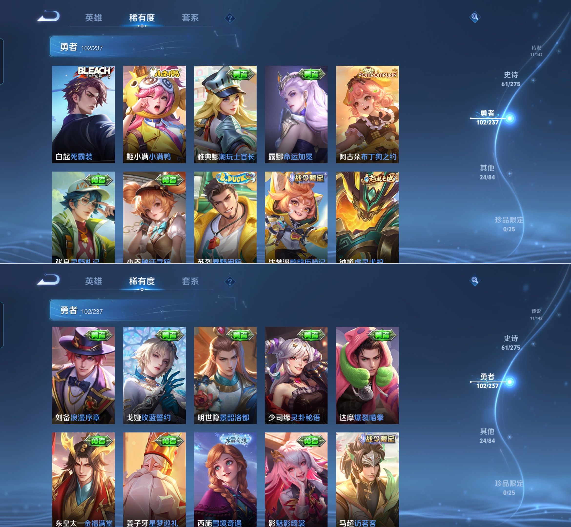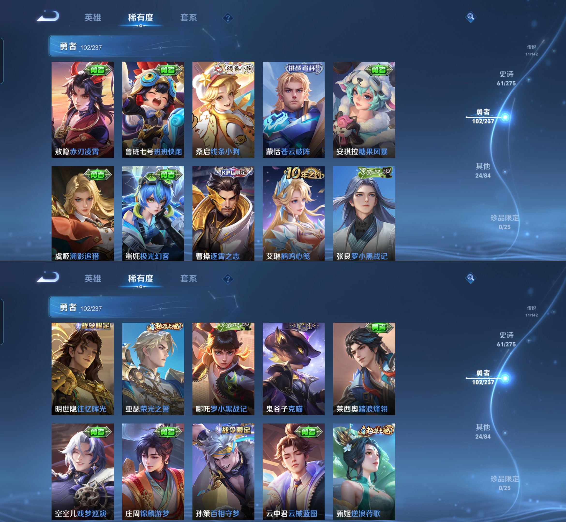 贵族等级:v7皮肤数:199传说品质11 生肖限定3 荣耀典藏1 英雄数:126