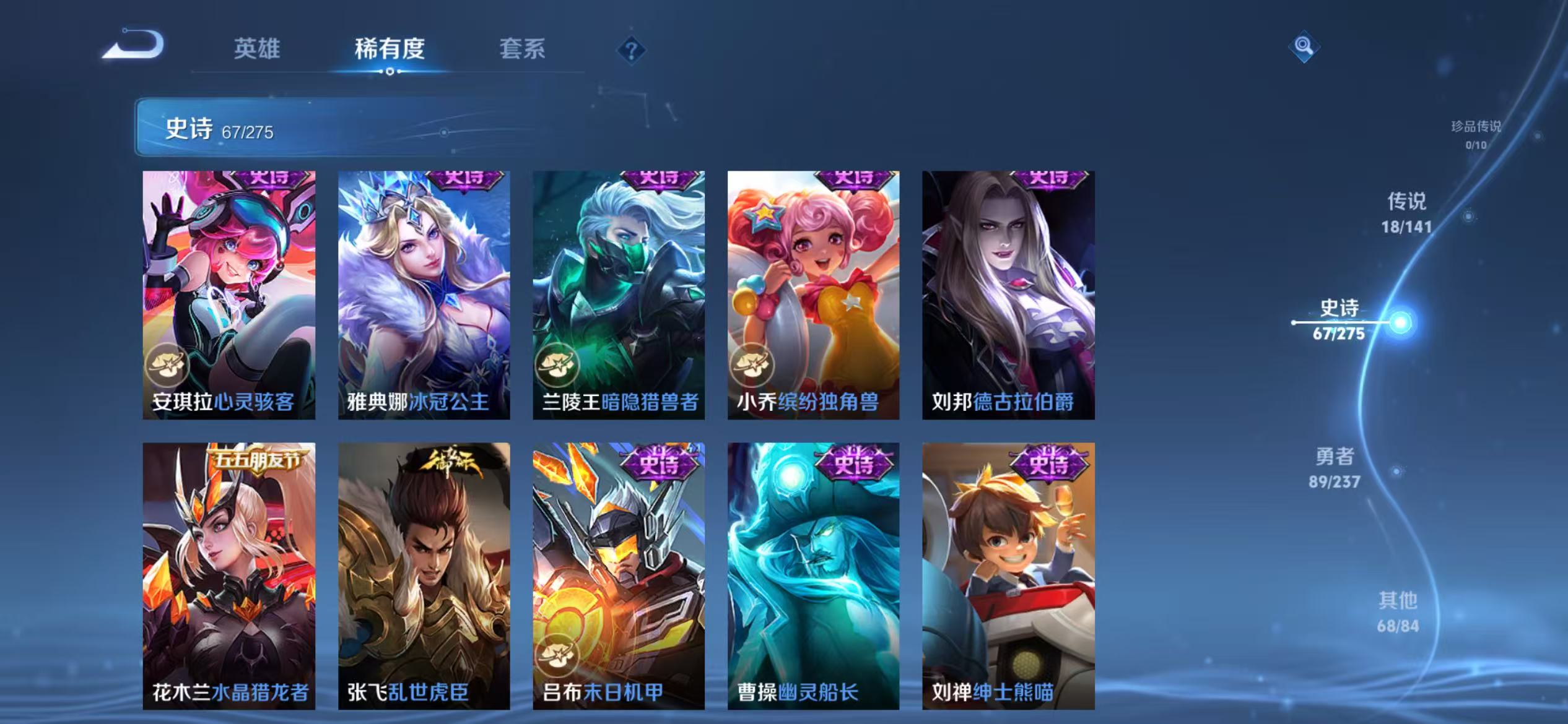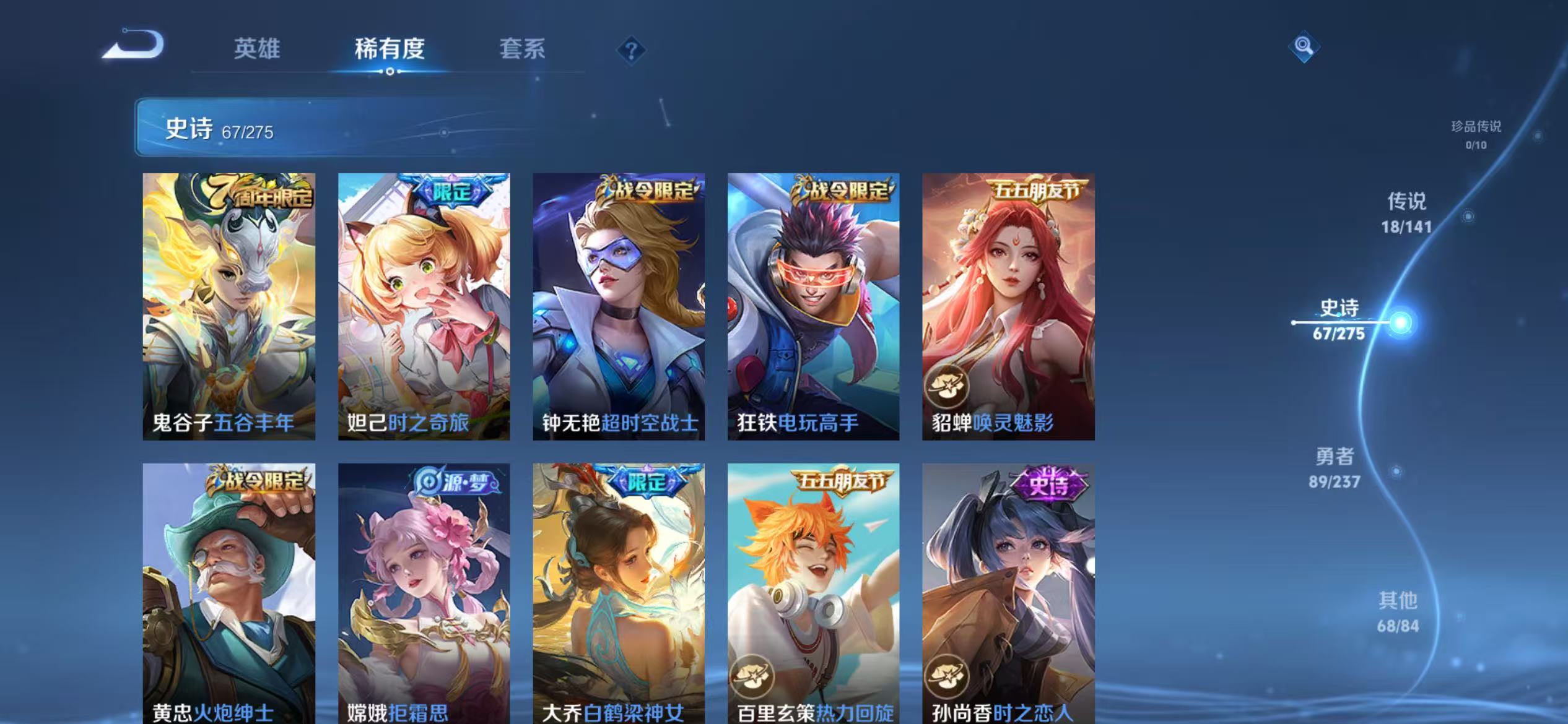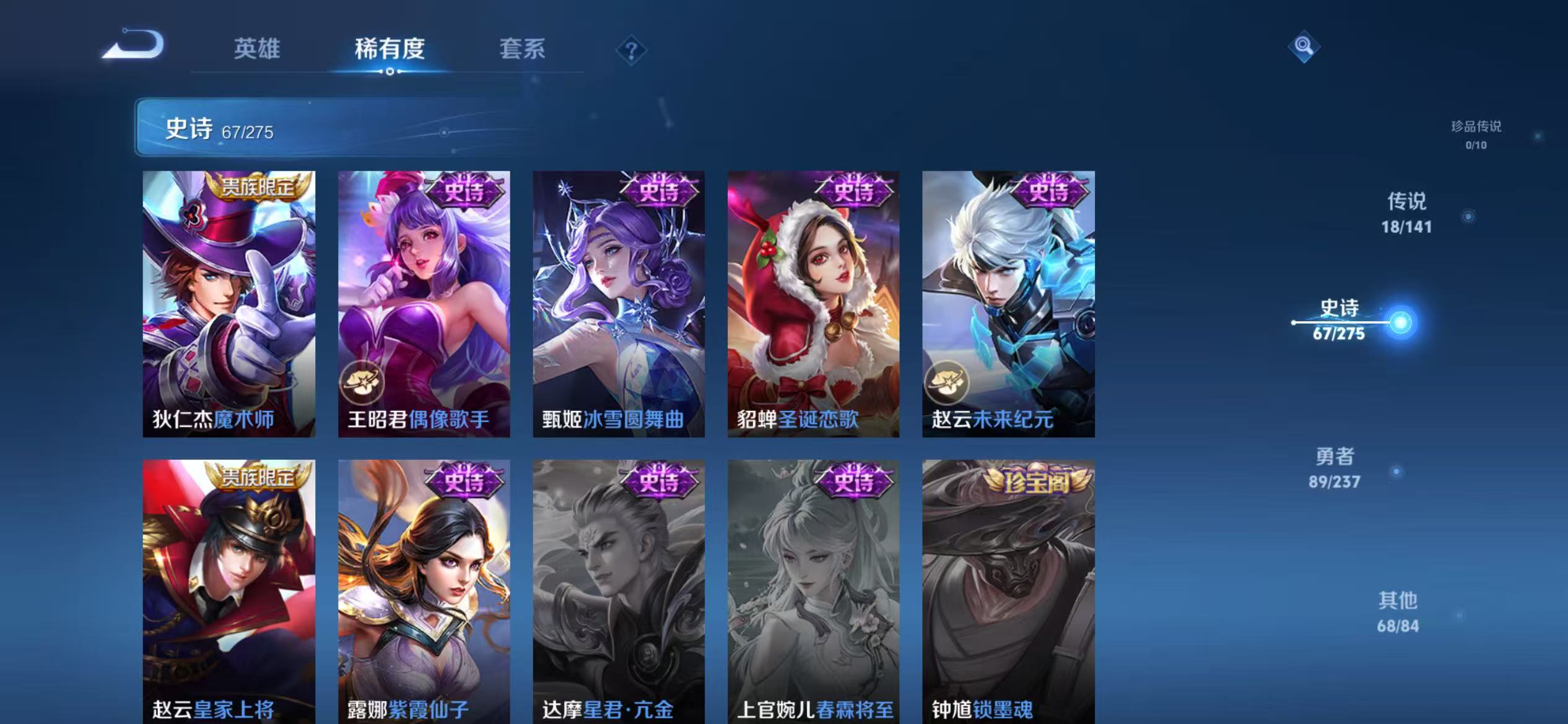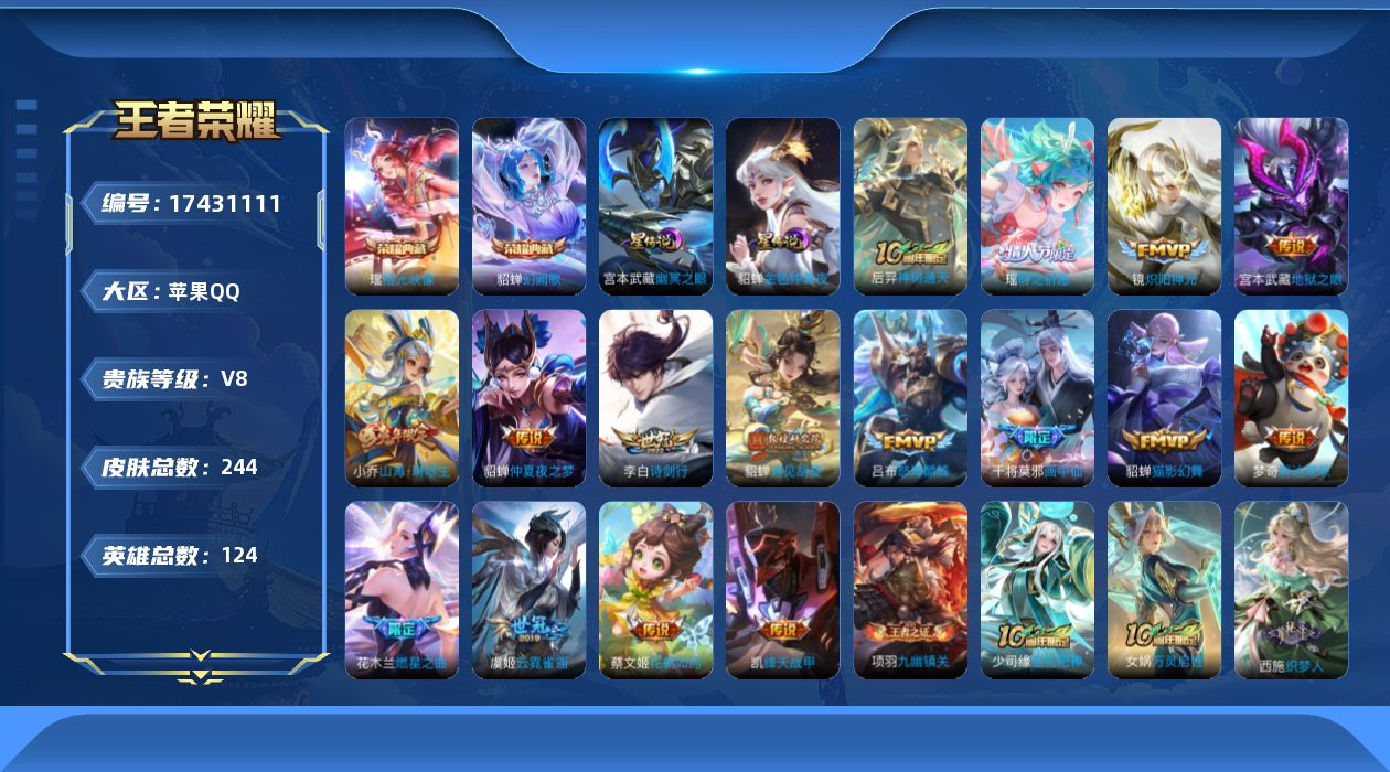 贵族等级:v8皮肤数:244传说品质18 荣耀典藏2 生肖限定3 情人节限定1 英雄数:124