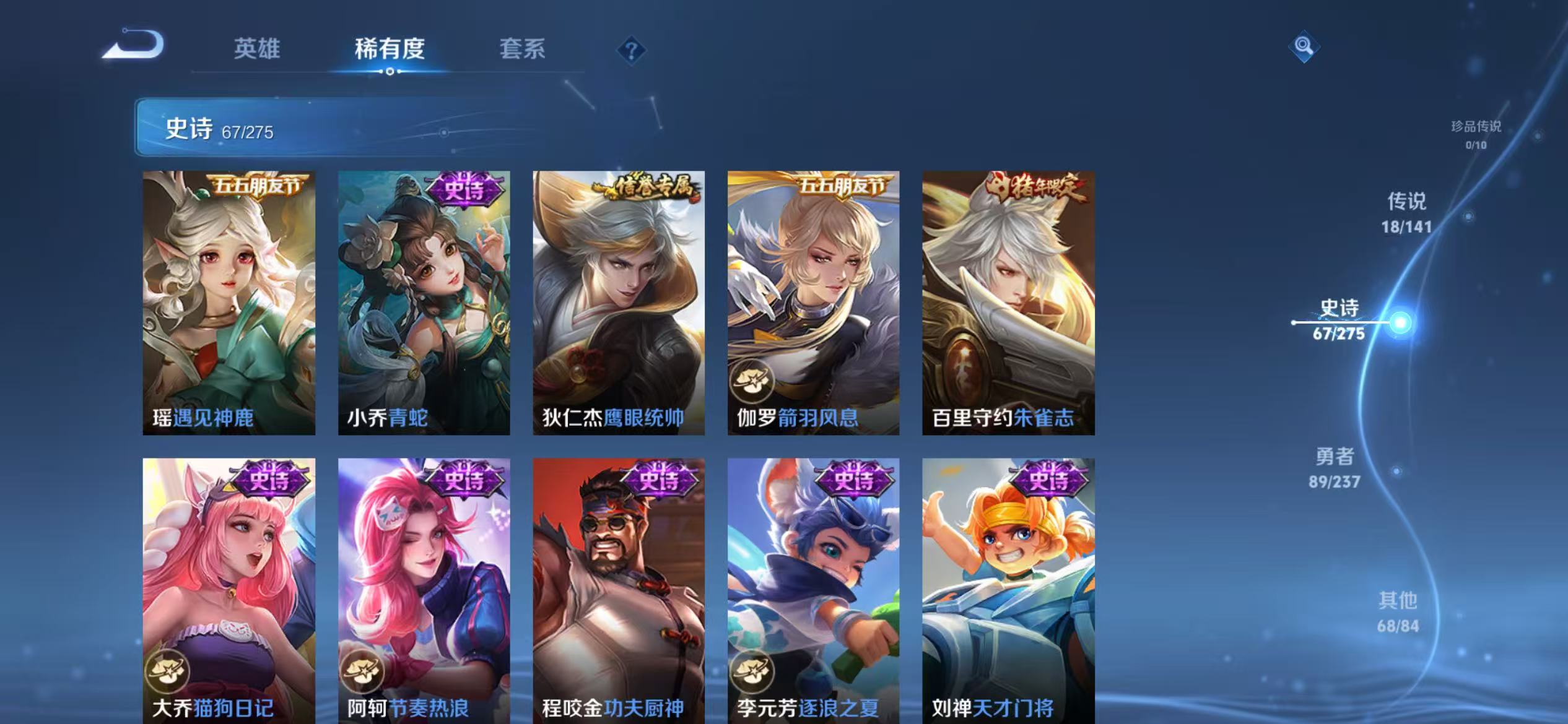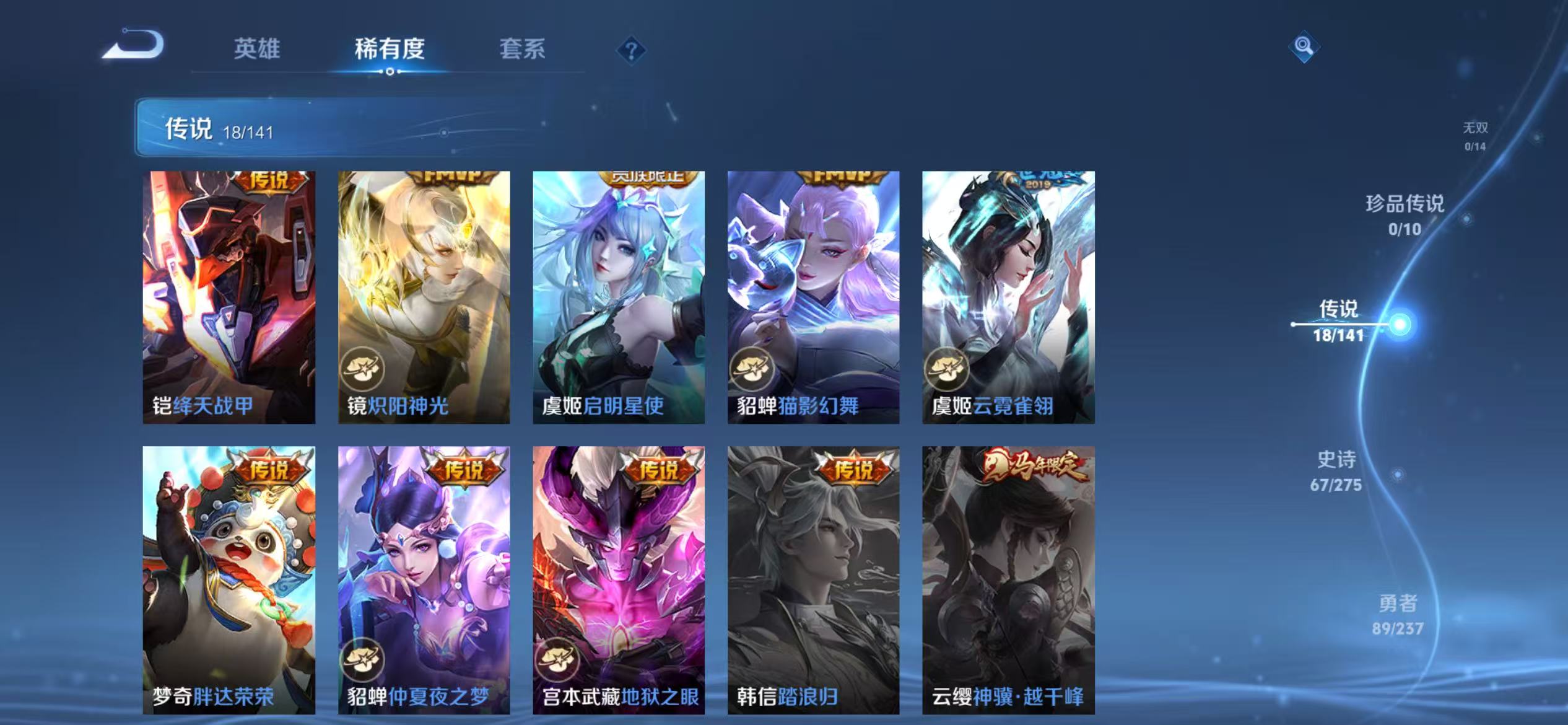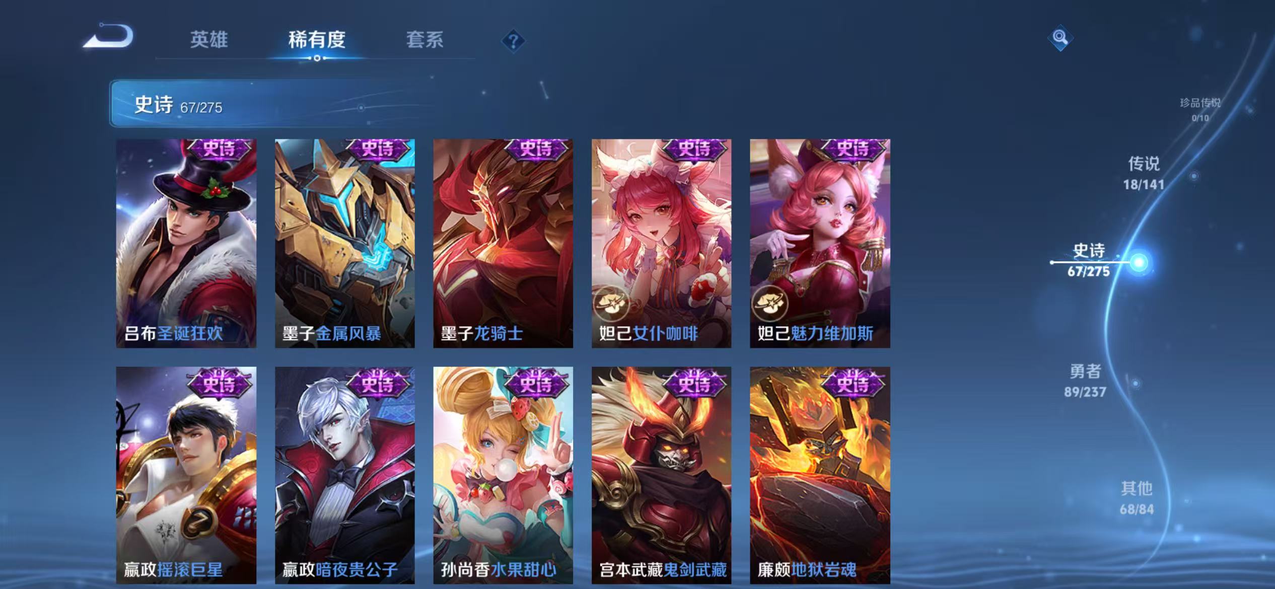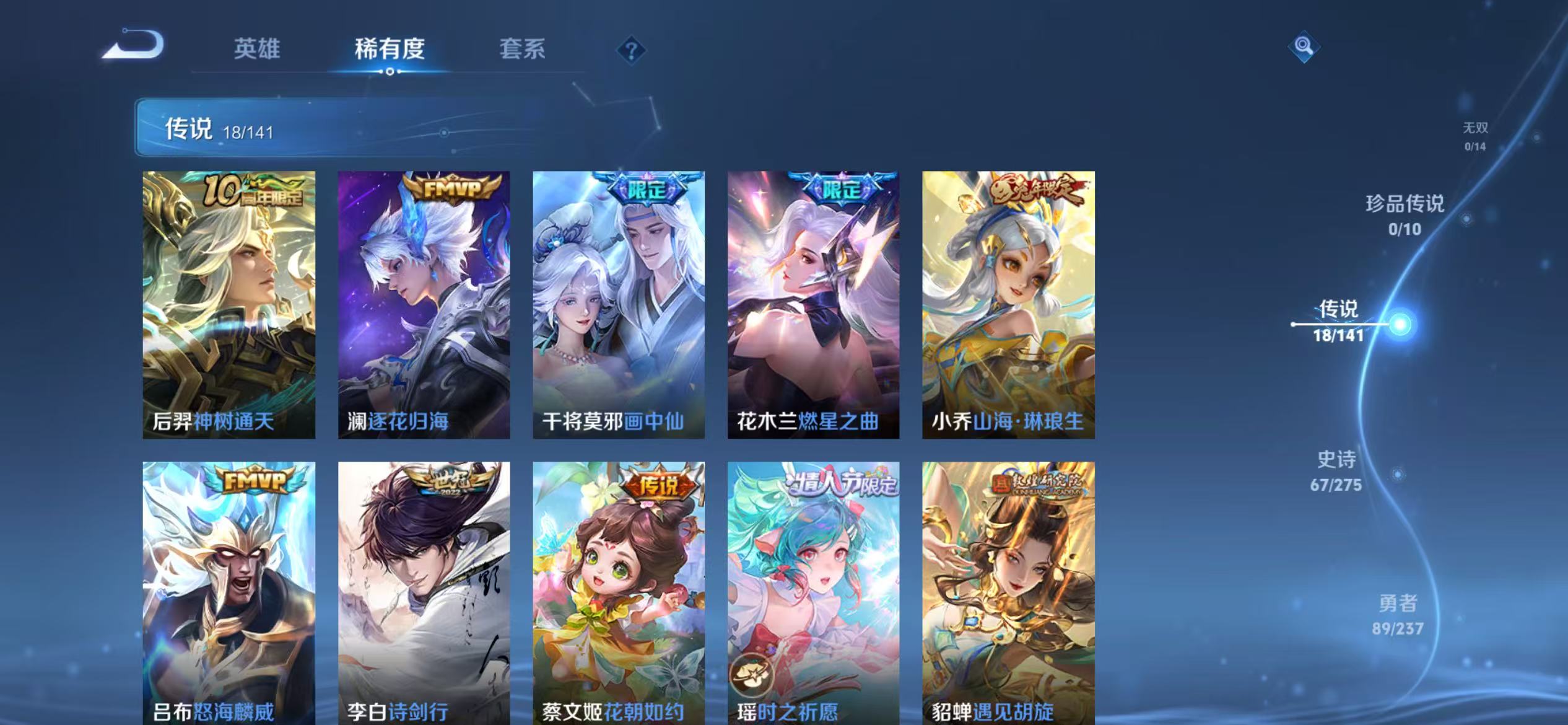 贵族等级:v8皮肤数:244传说品质18 荣耀典藏2 生肖限定3 情人节限定1 英雄数:124