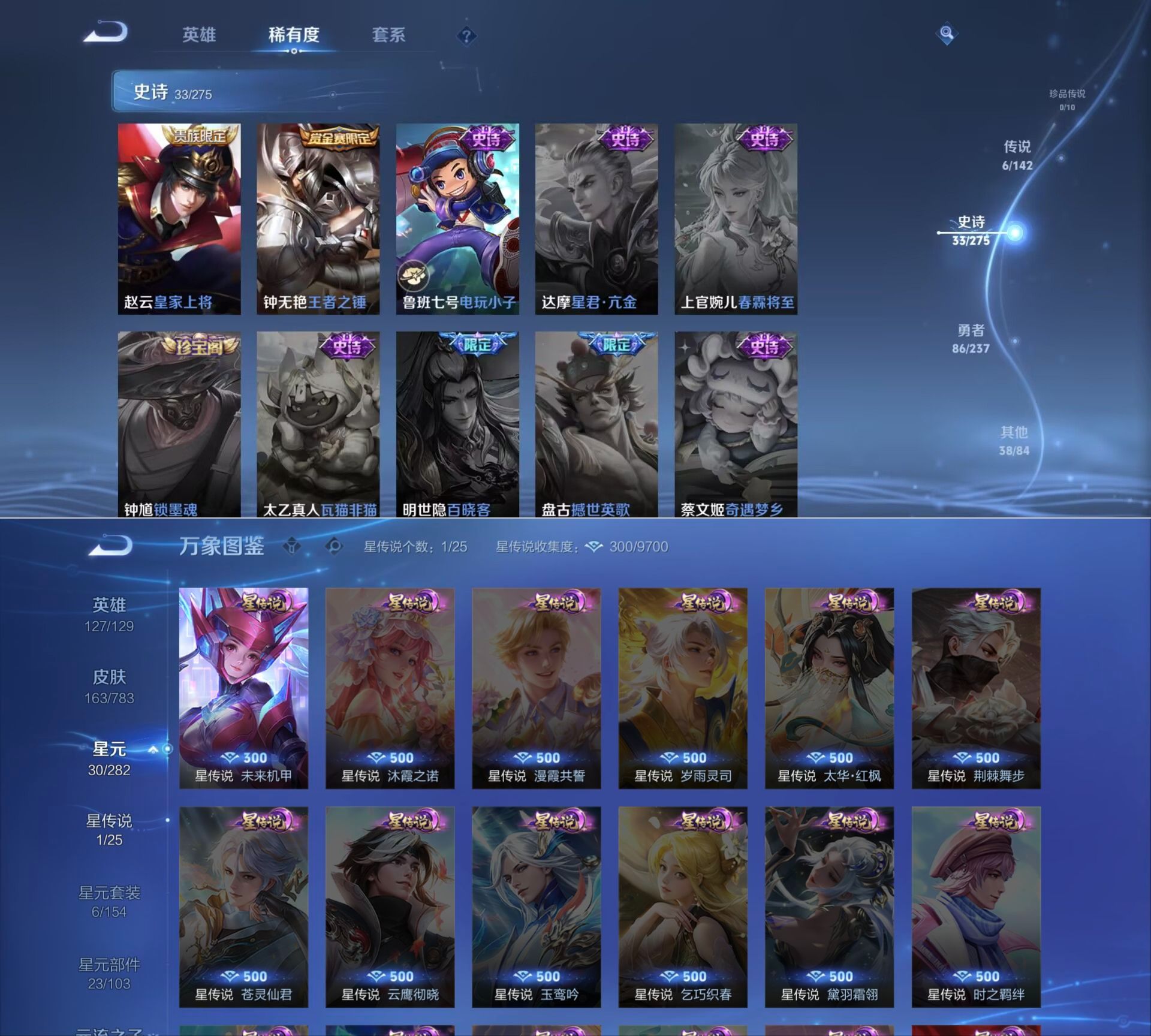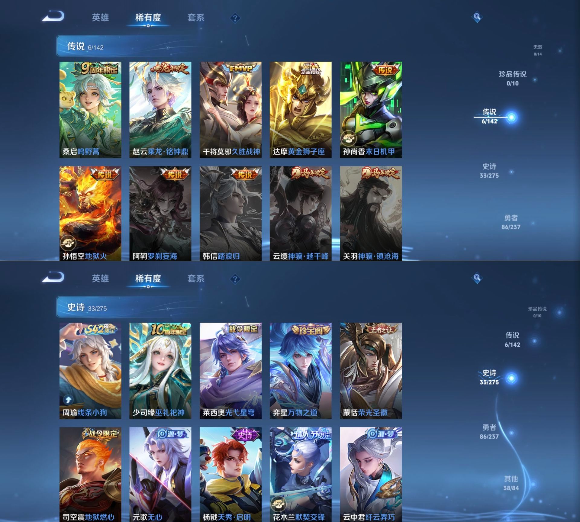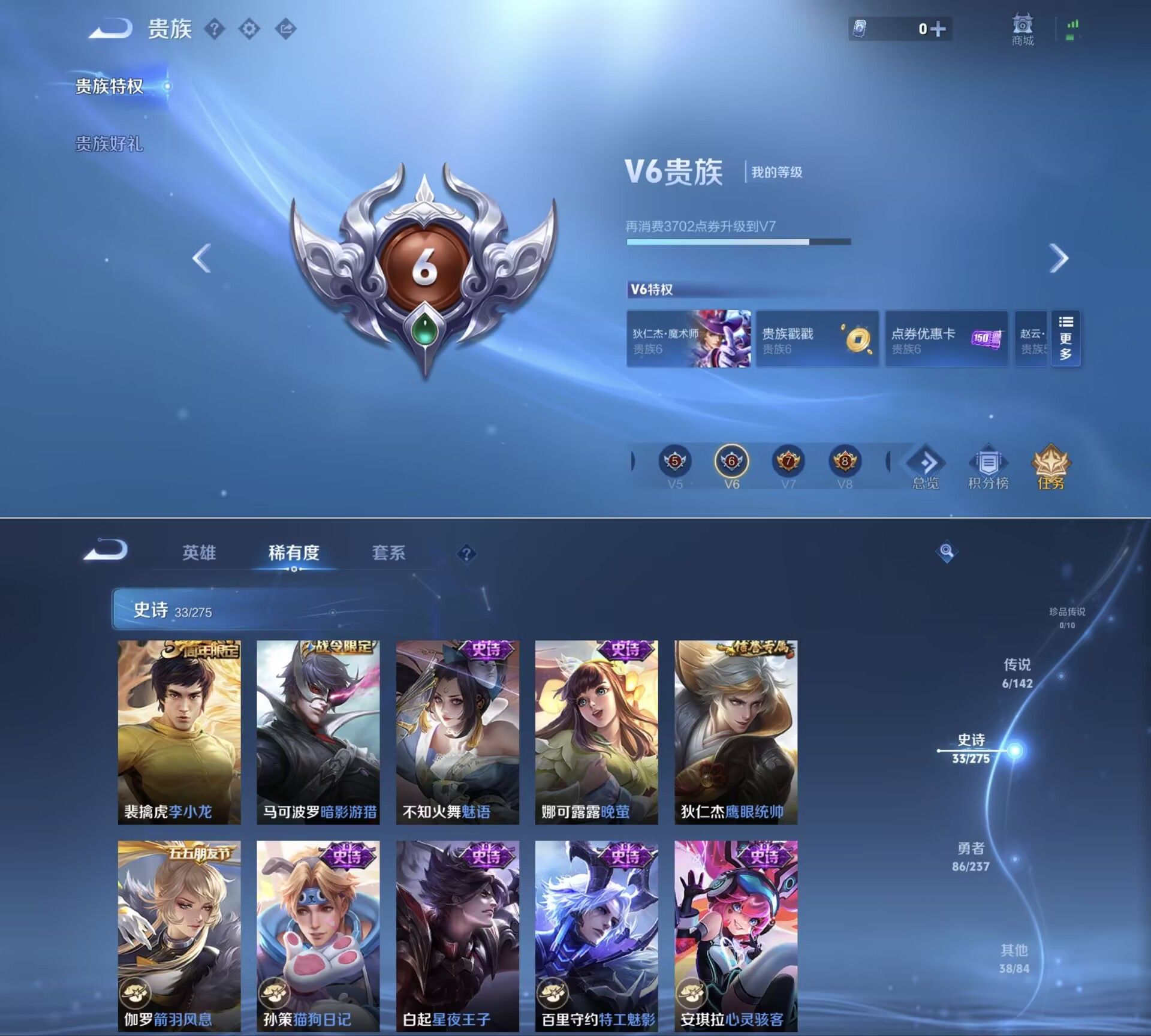 贵族等级:v6皮肤数:163传说品质6 情人节限定1 生肖限定1 英雄数:127