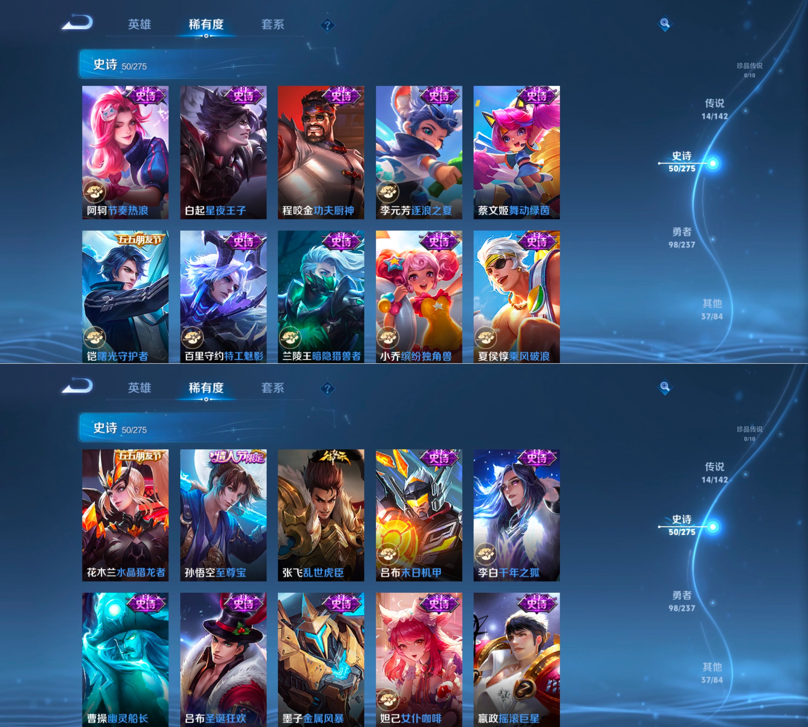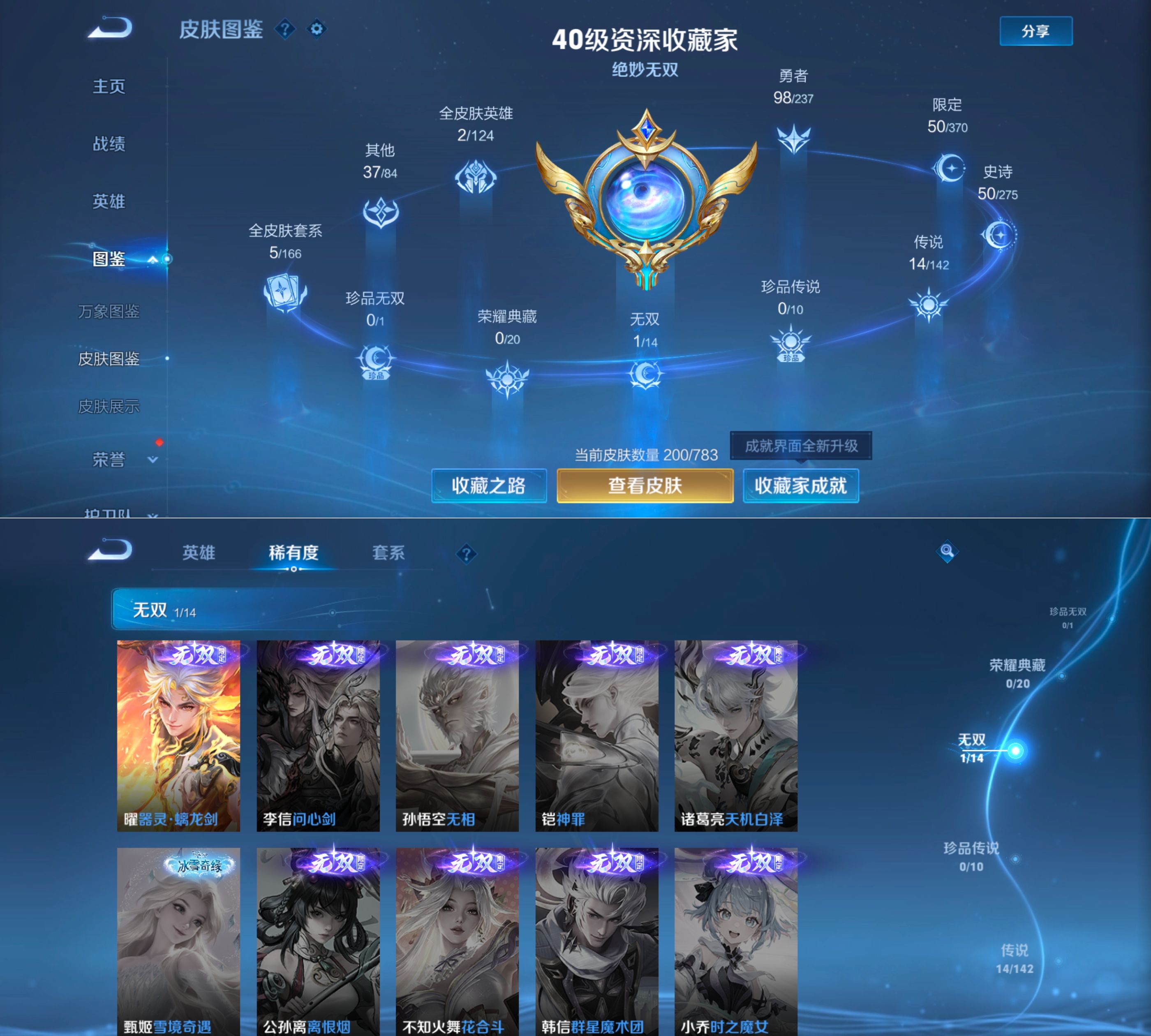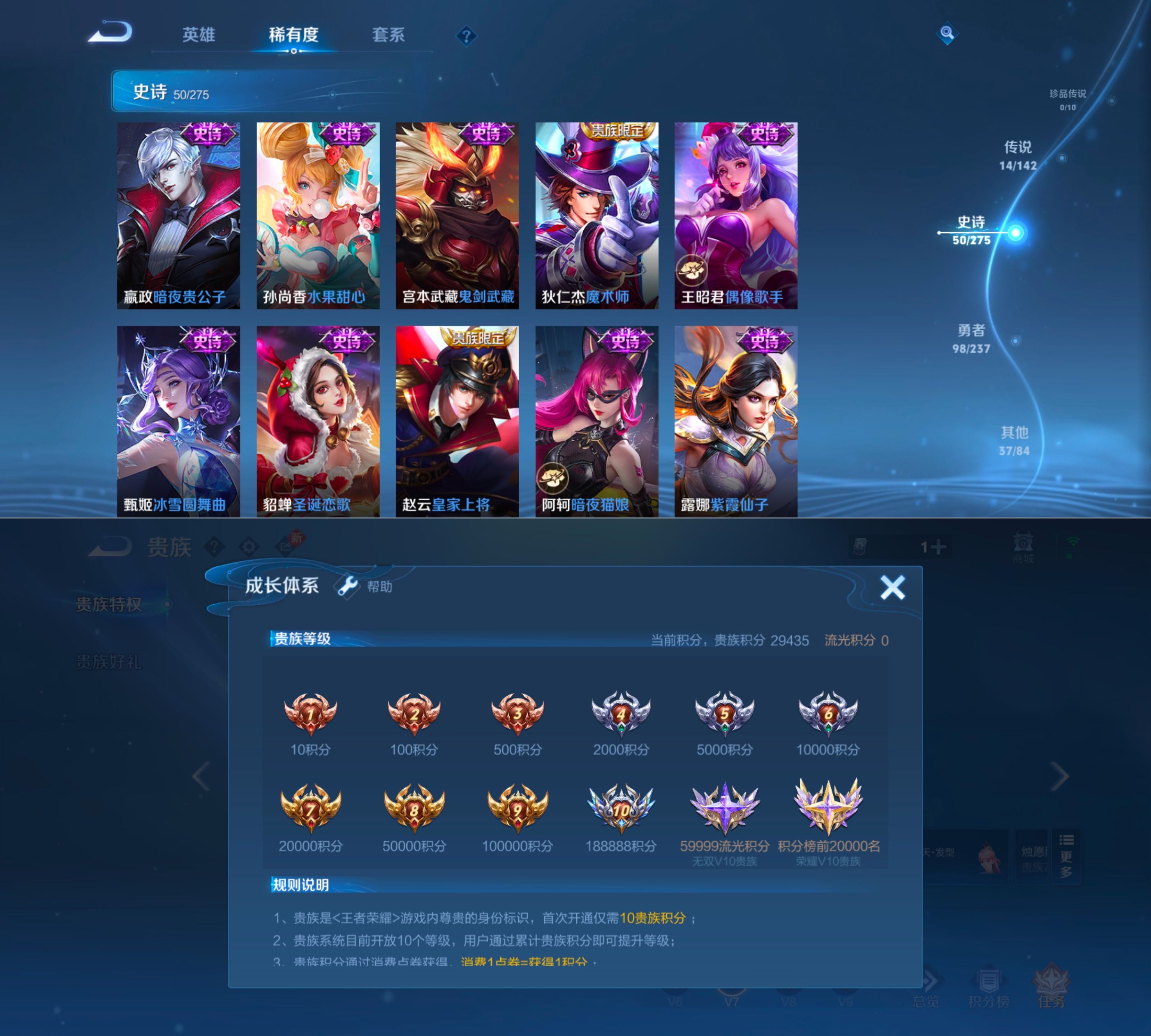贵族等级:v7皮肤数:200传说品质14 情人节限定1 生肖限定4 无双1 英雄数:128