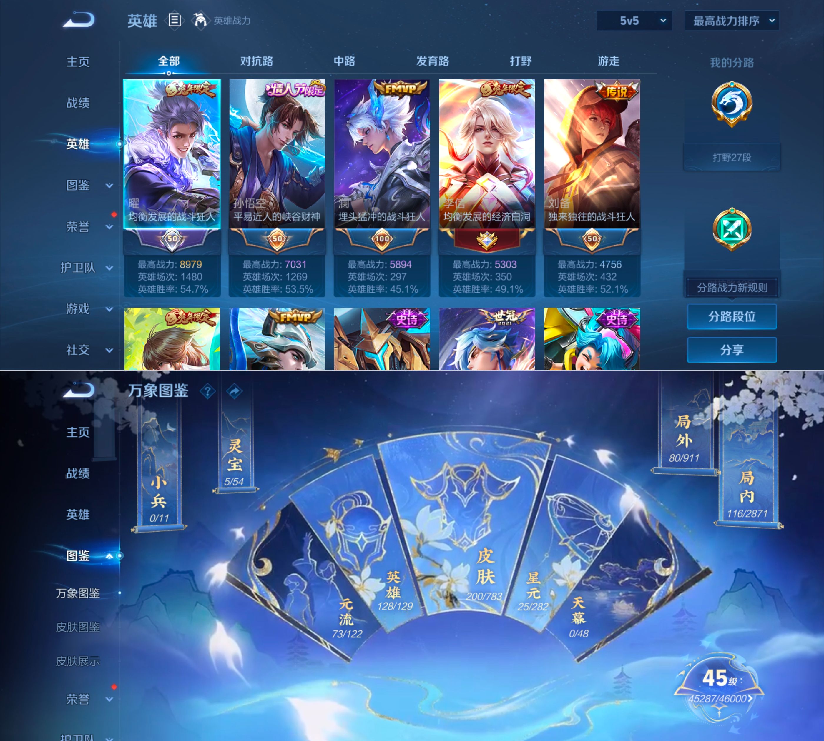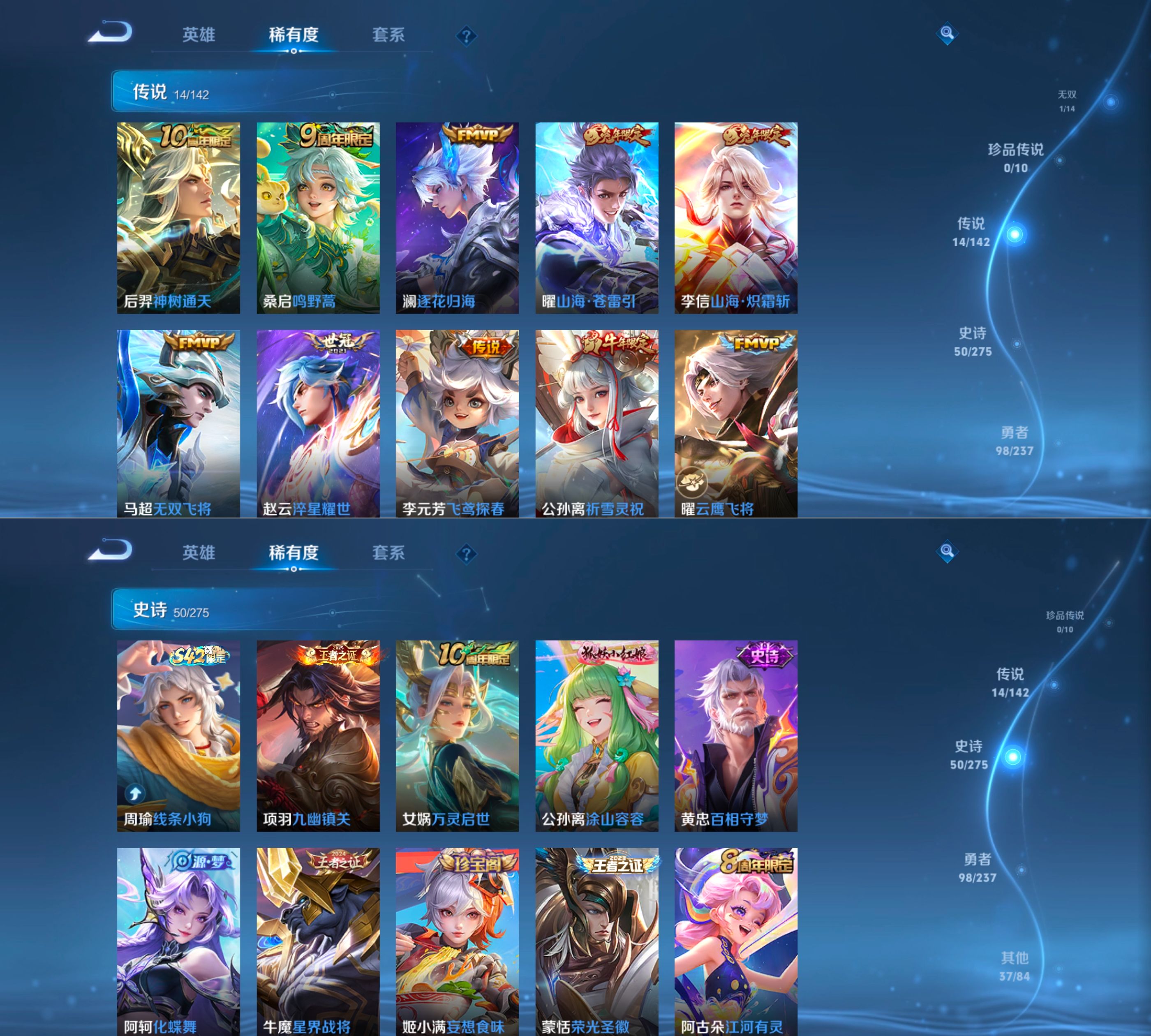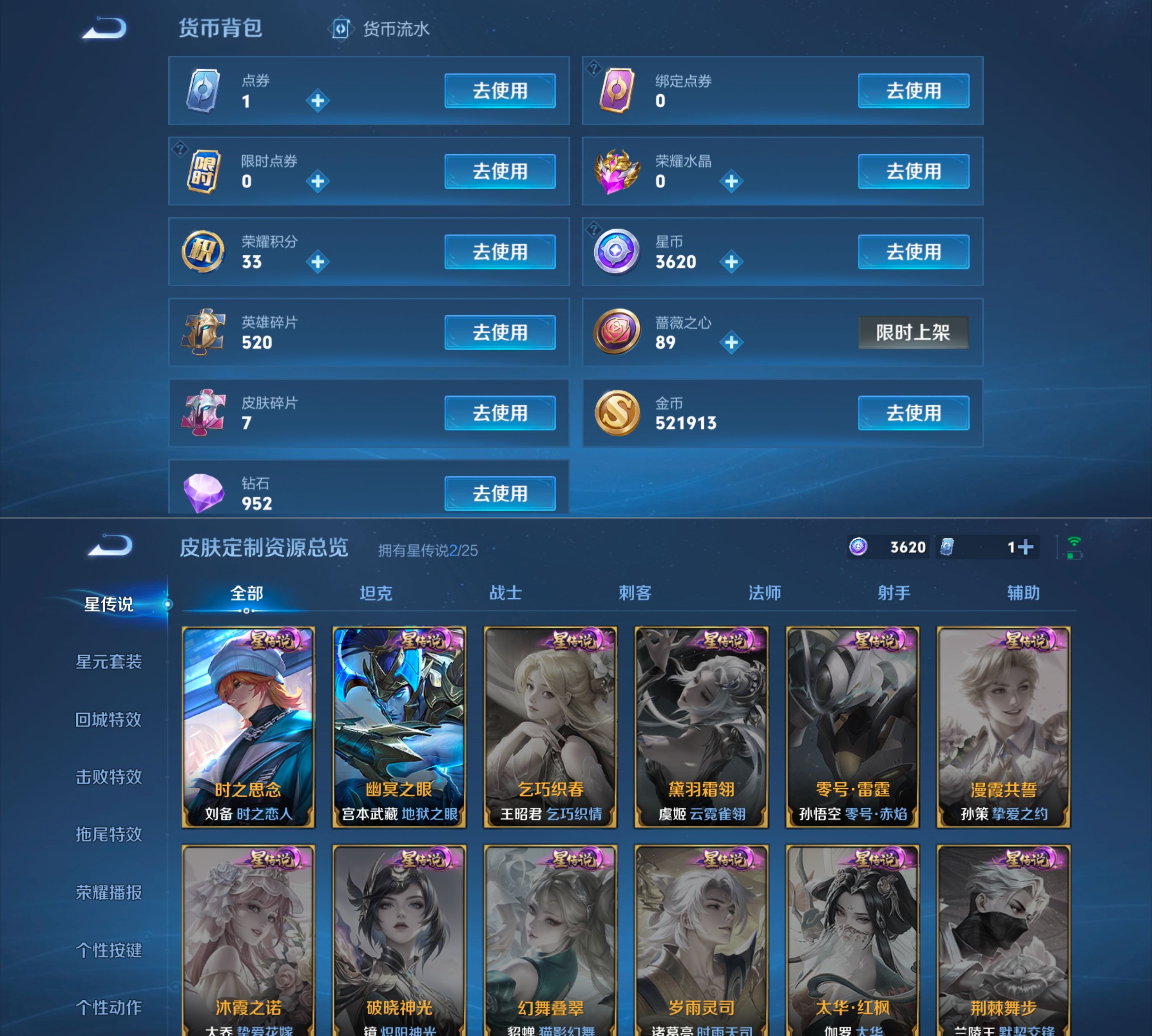 贵族等级:v7皮肤数:200传说品质14 情人节限定1 生肖限定4 无双1 英雄数:128