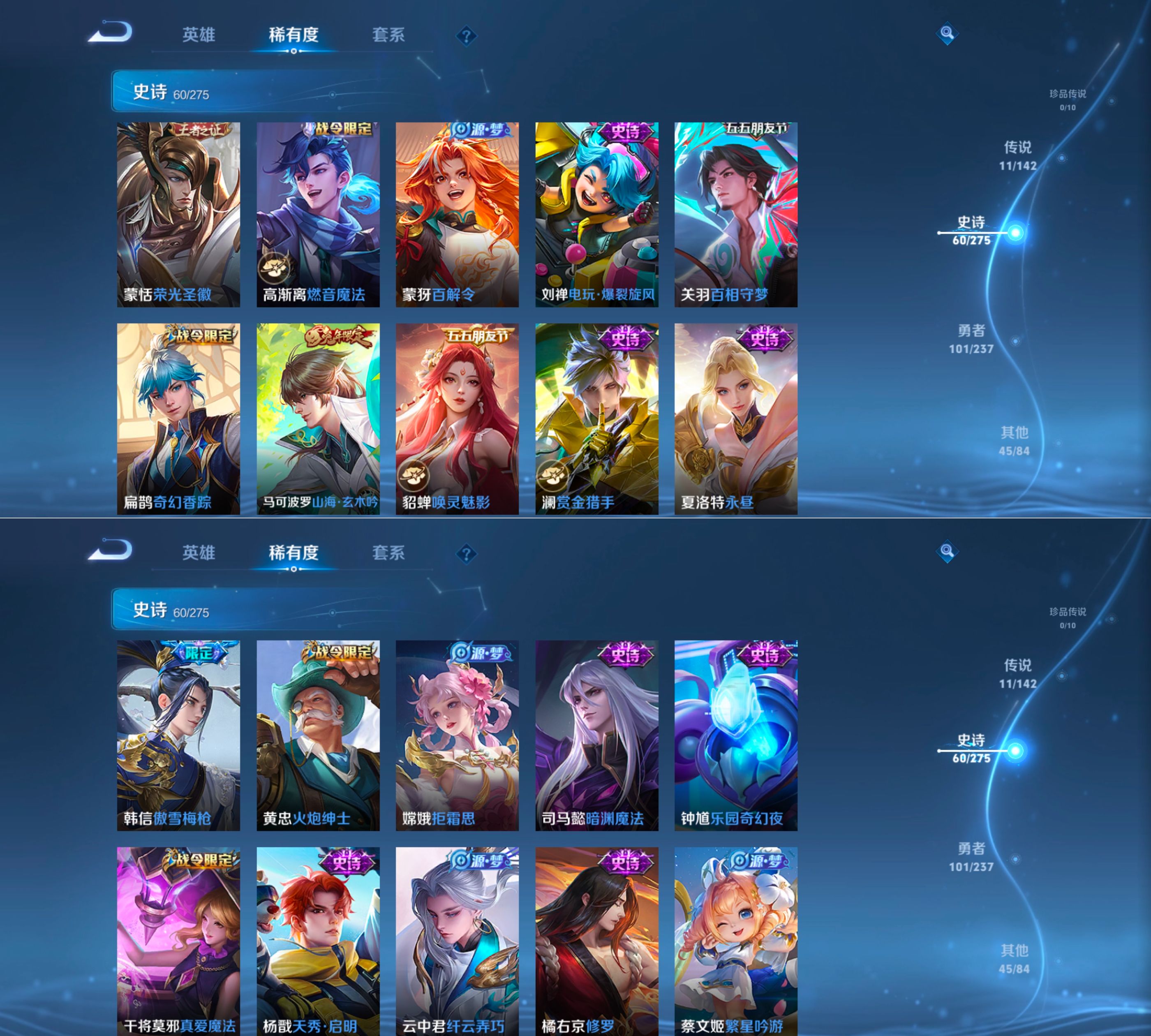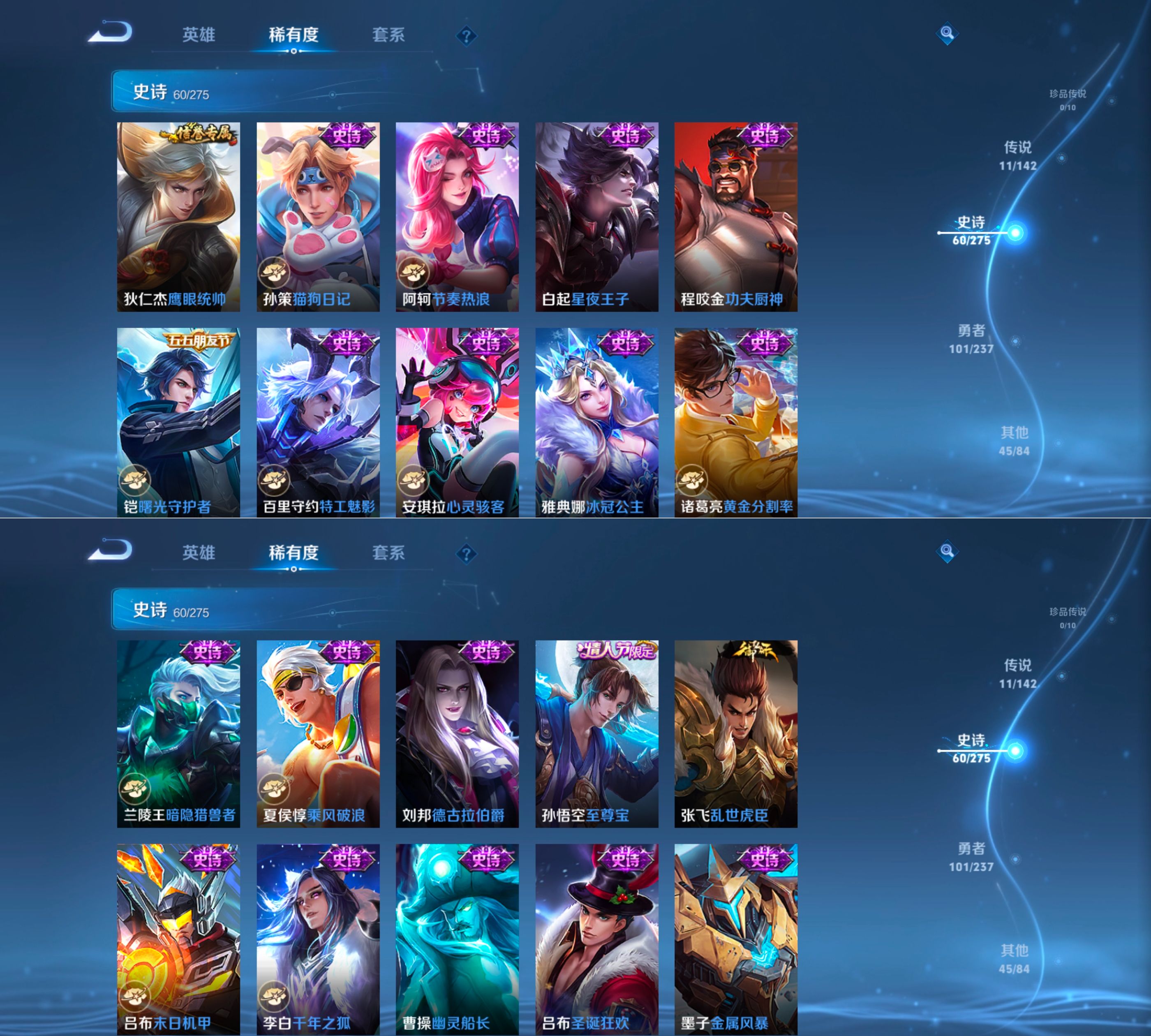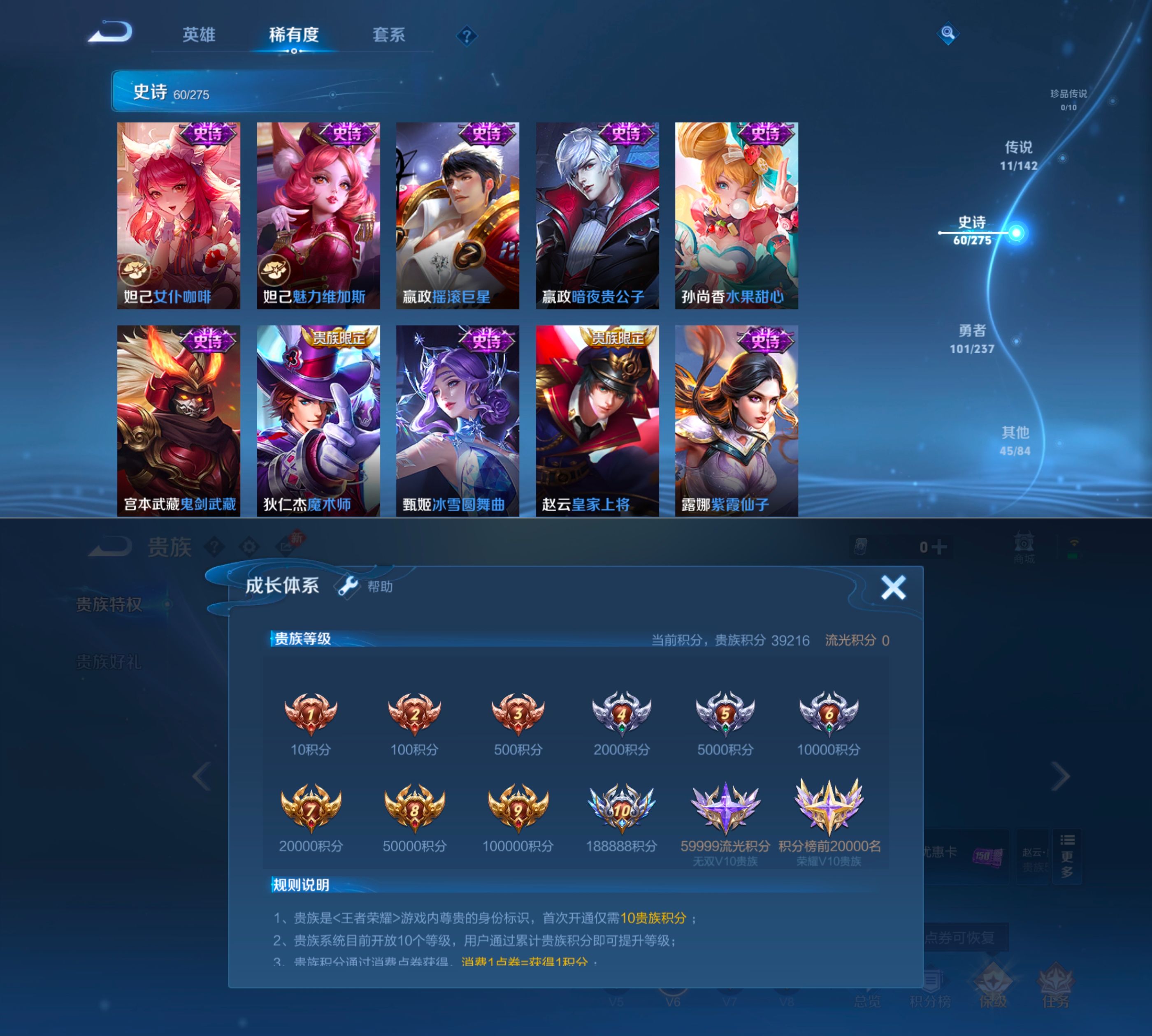 贵族等级:v7皮肤数:217传说品质11 生肖限定4 情人节限定1 英雄数:128
