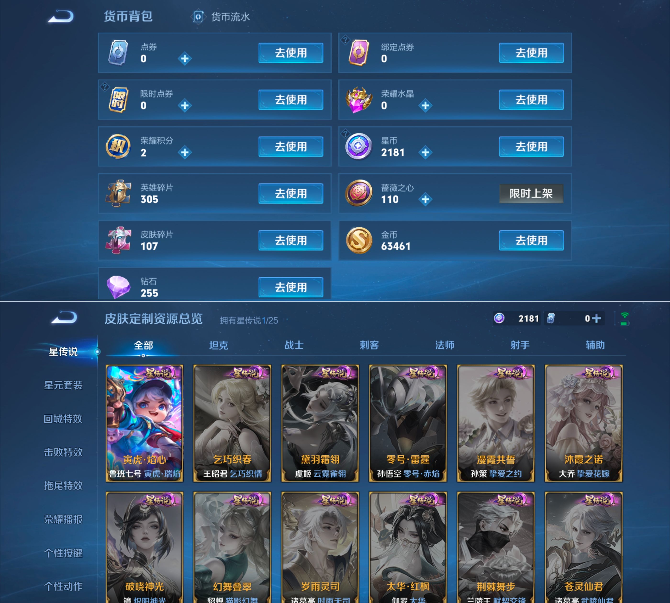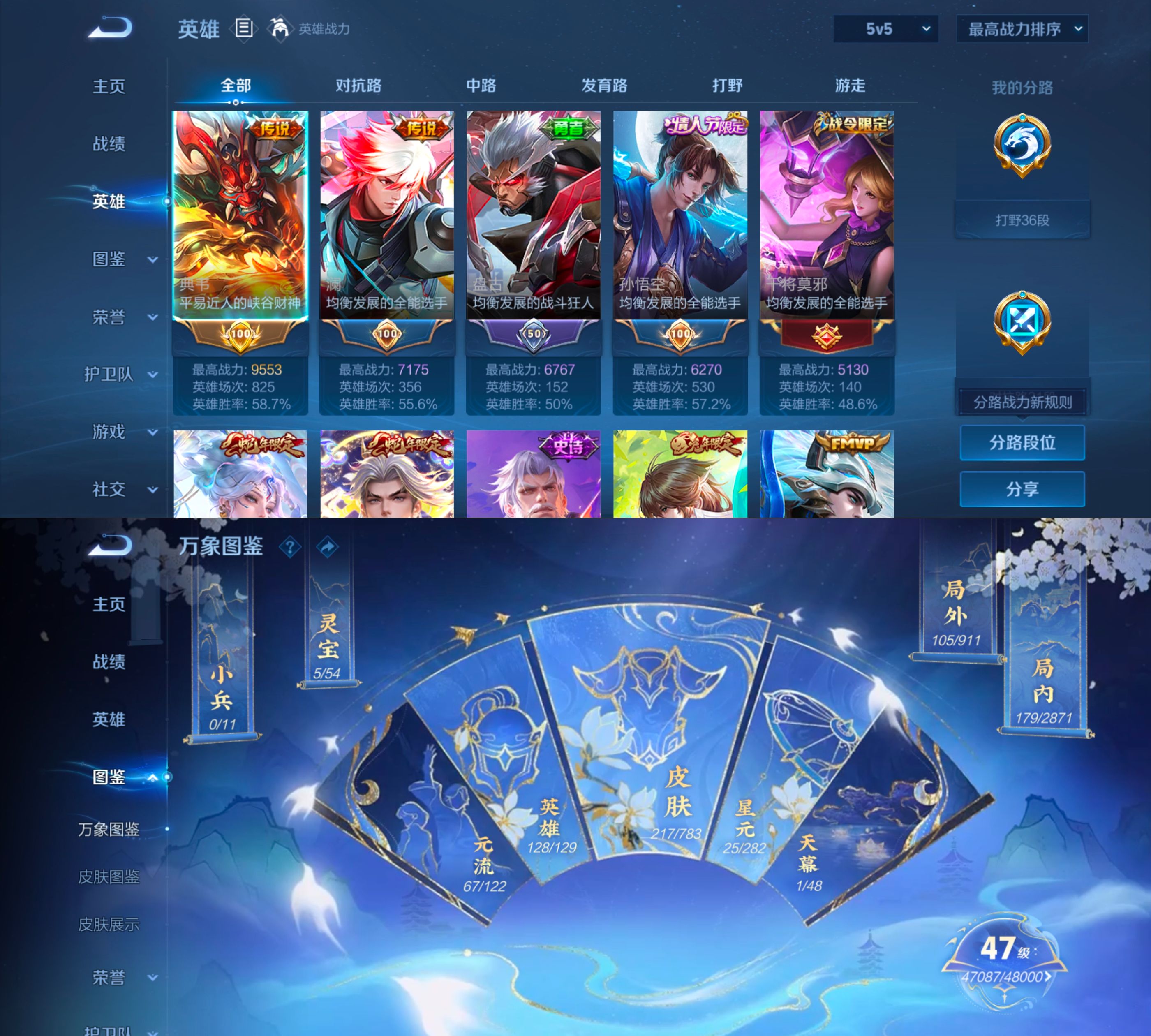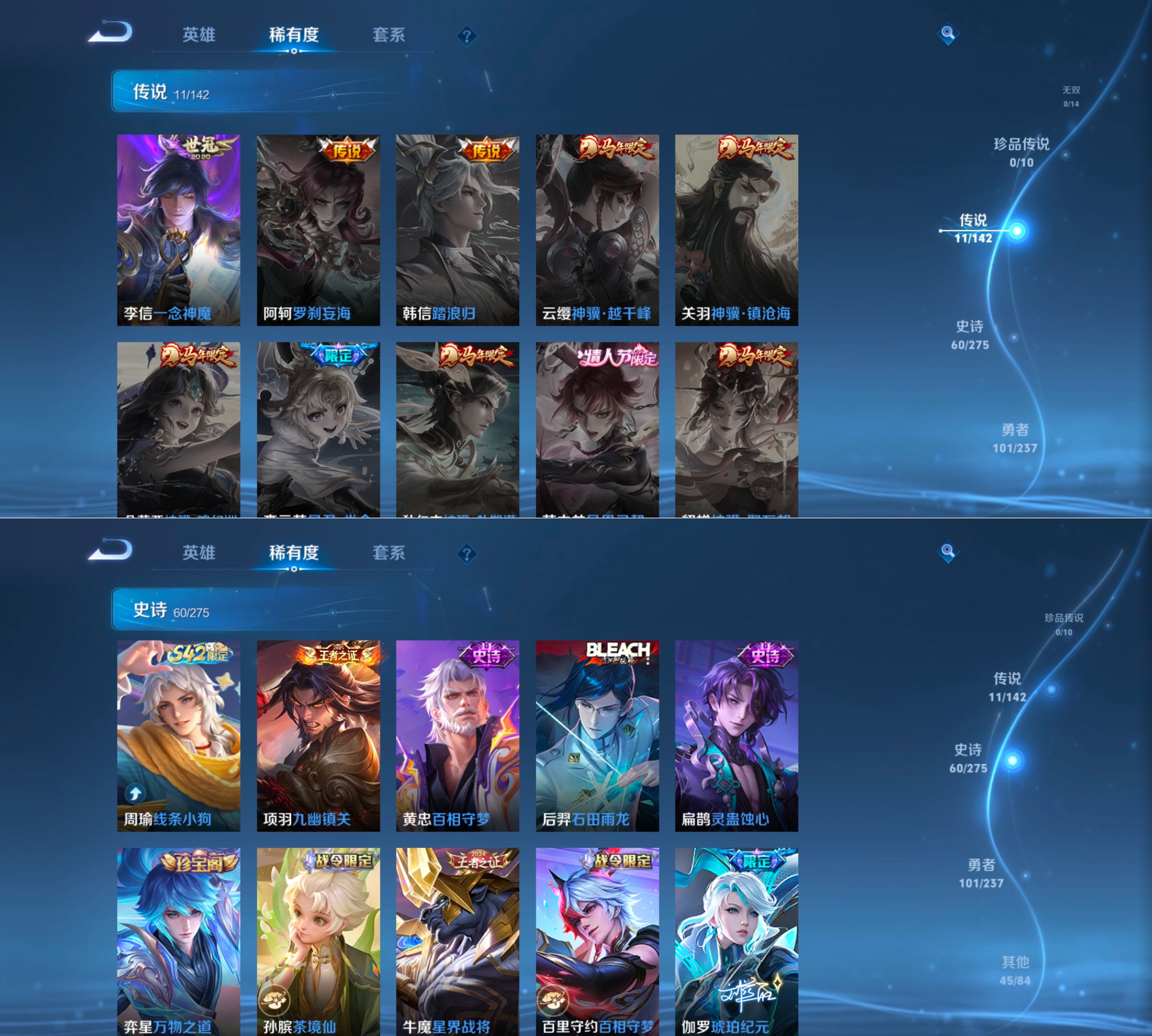 贵族等级:v7皮肤数:217传说品质11 生肖限定4 情人节限定1 英雄数:128