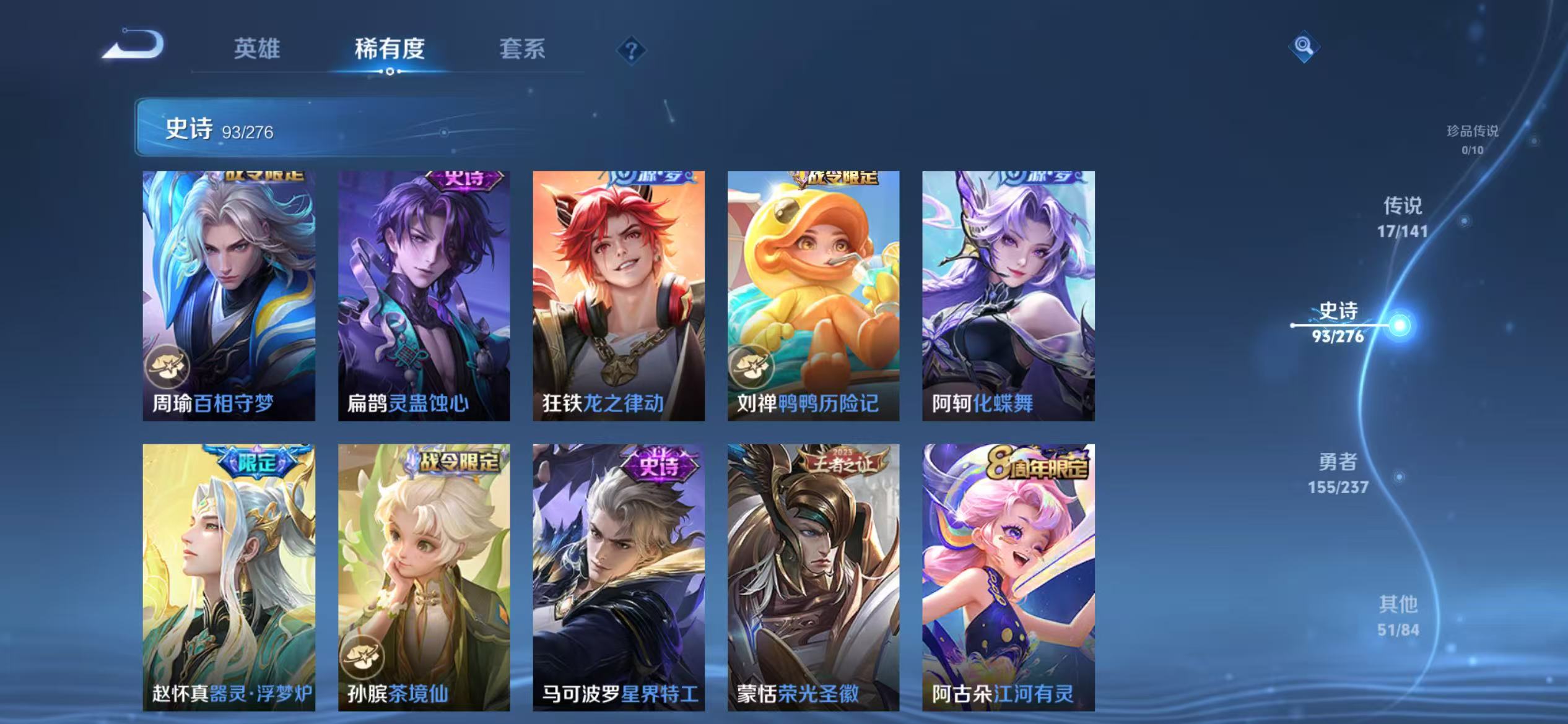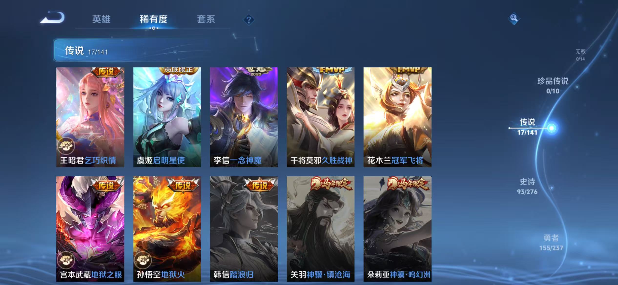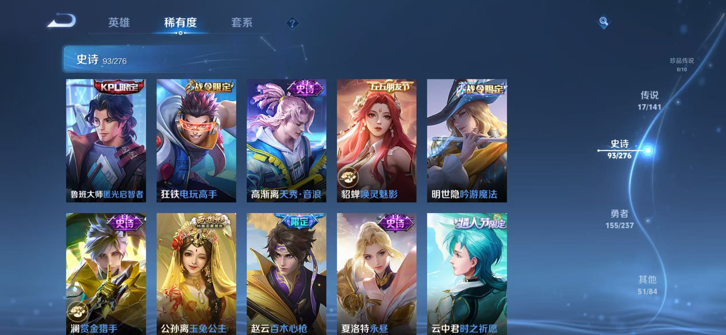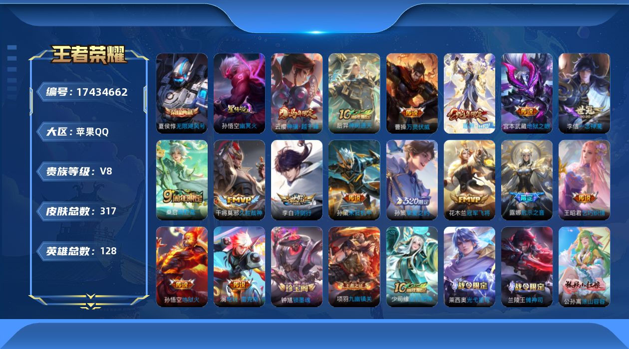 贵族等级:v8皮肤数:317传说品质17 生肖限定4 情人节限定2 荣耀典藏1 英雄数:128