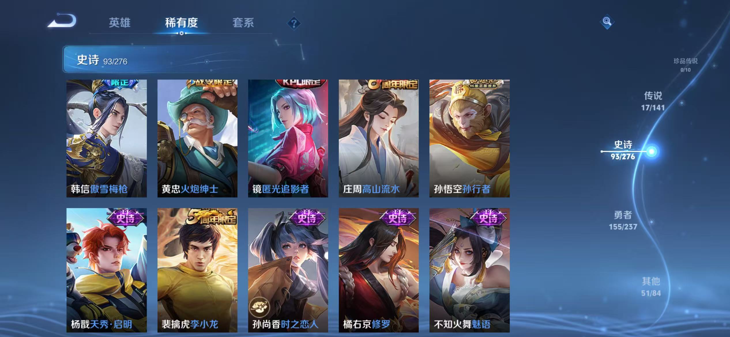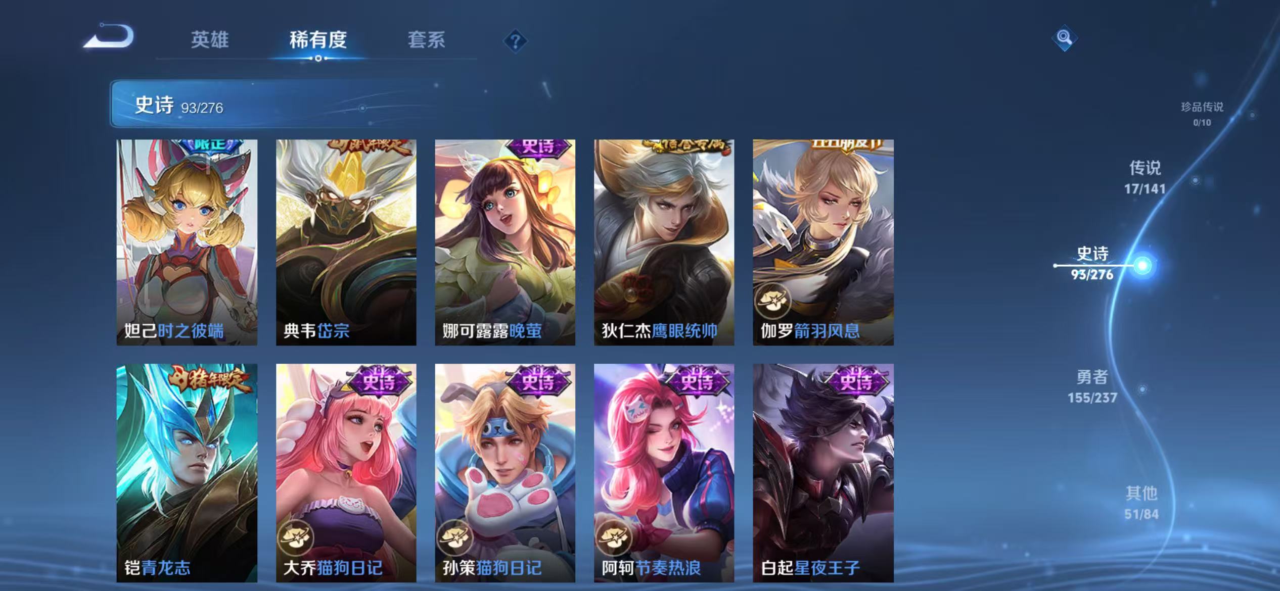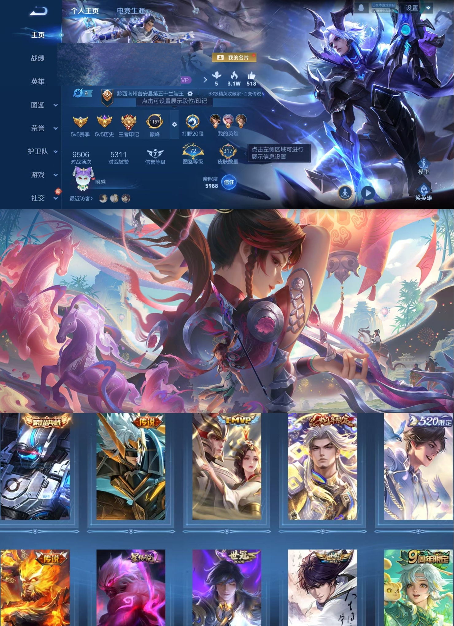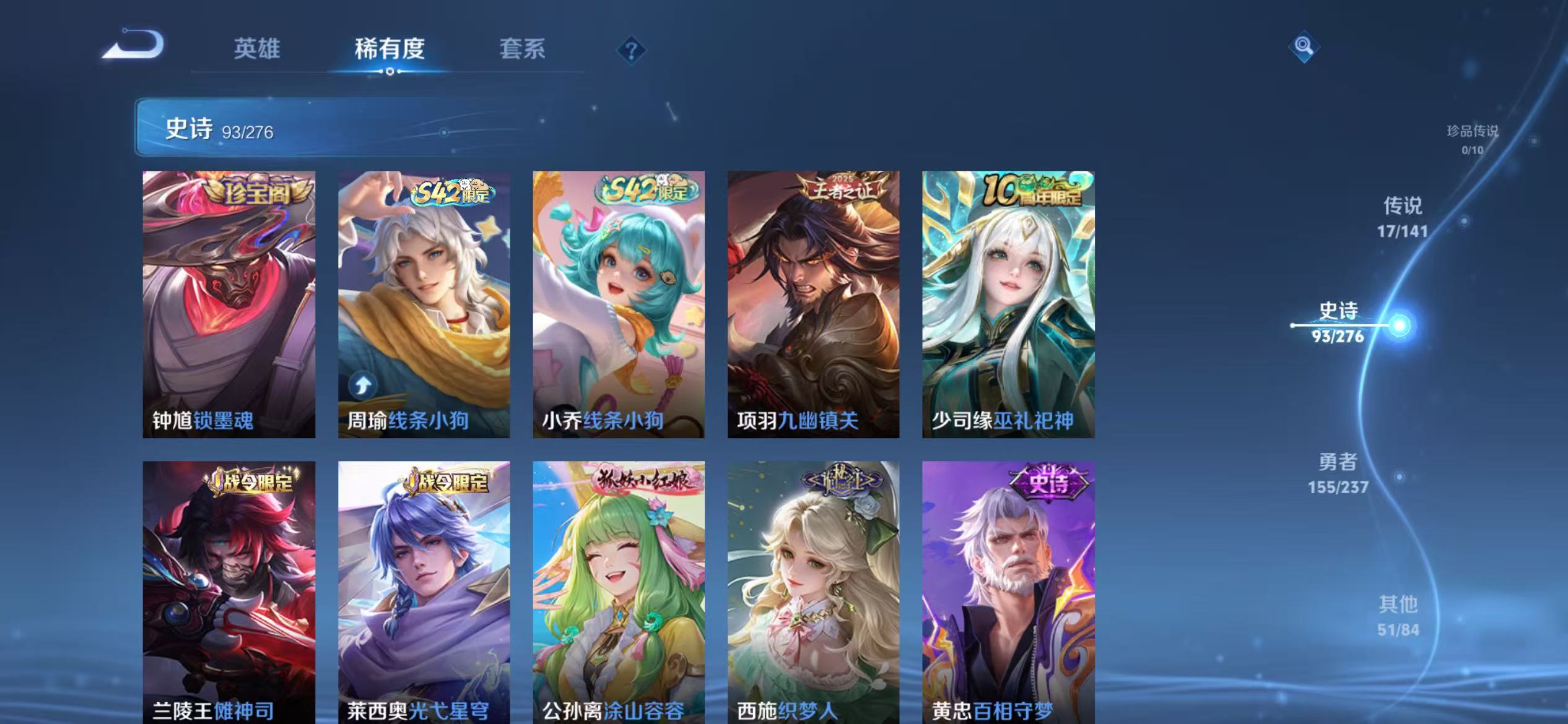 贵族等级:v8皮肤数:317传说品质17 生肖限定4 情人节限定2 荣耀典藏1 英雄数:128